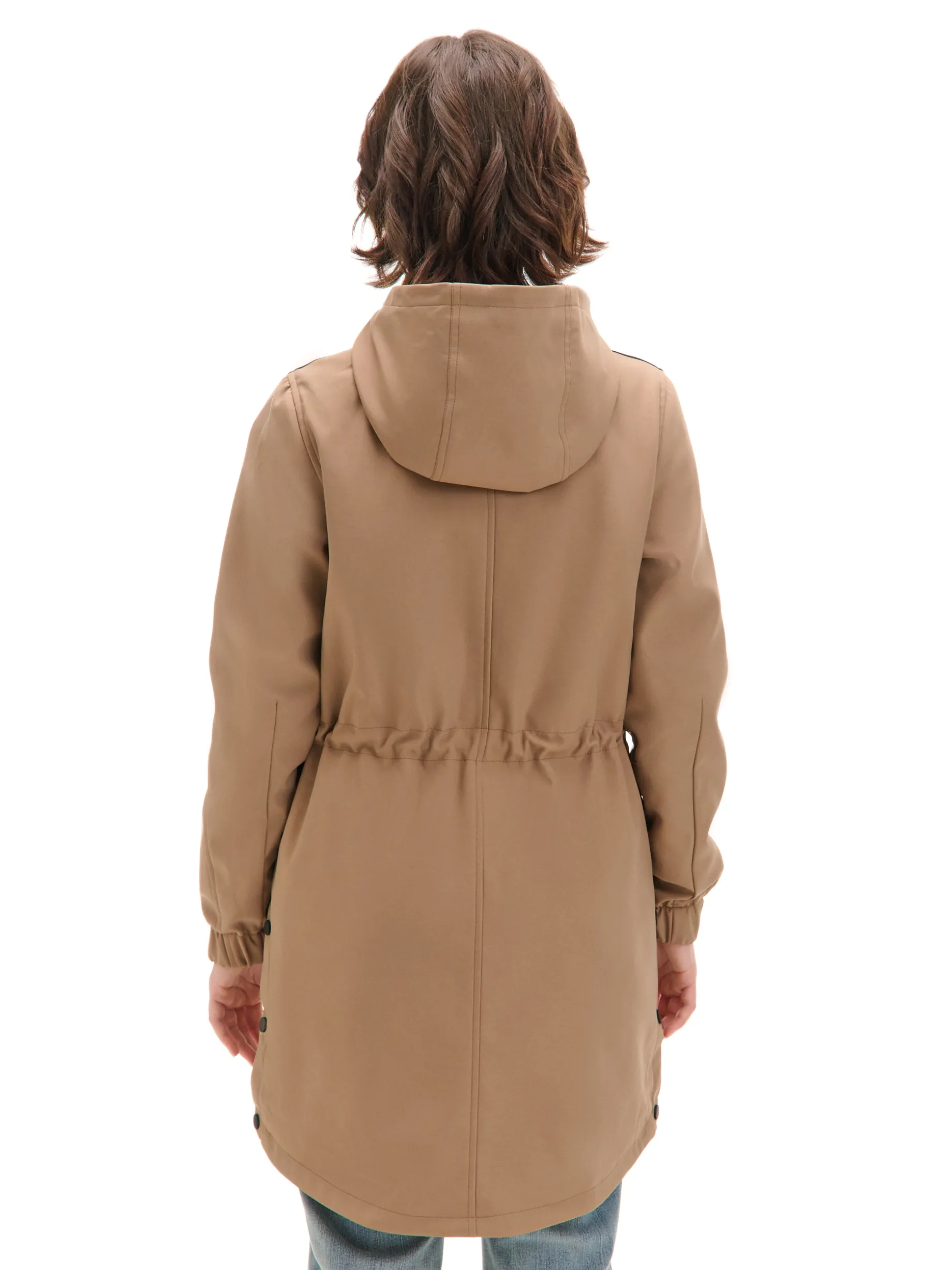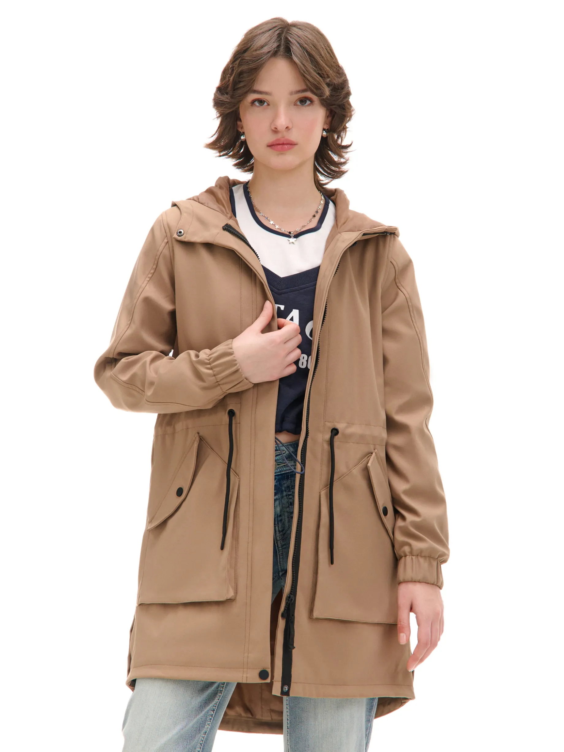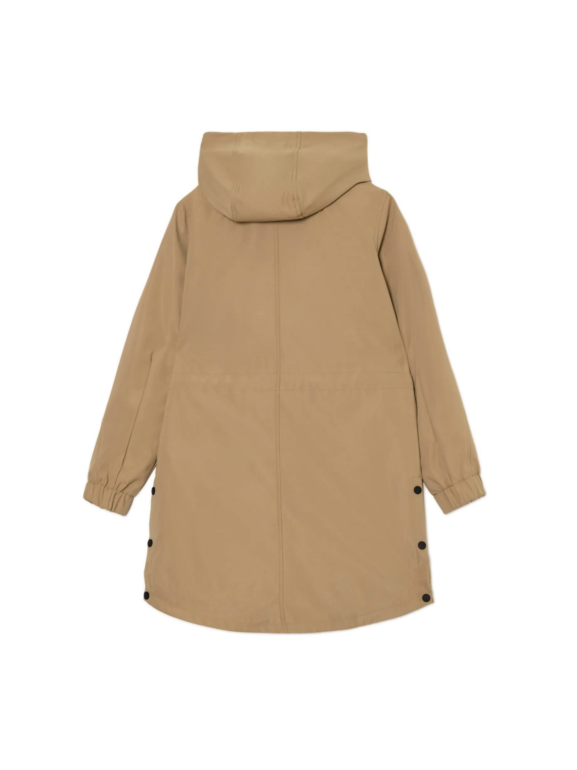 Damski płaszcz typu parka, uszyty z gładkiej beżowej tkaniny. Idealny na deszczowe jesienne dni i nie tylko! regularny krój wewnątrz wykończenie na gładkiej podszewce zapięcie na zamek ukryty pod listwą z napami zapięcie na zatrzask na dole szeroki kaptur zapinany na zatrzask długie rękawy ze ściągaczem wewnątrz mankietów regulacja w talii za pomocą sznurka kieszenie boczne z zatrzaskami ozdobne patki na ramionach