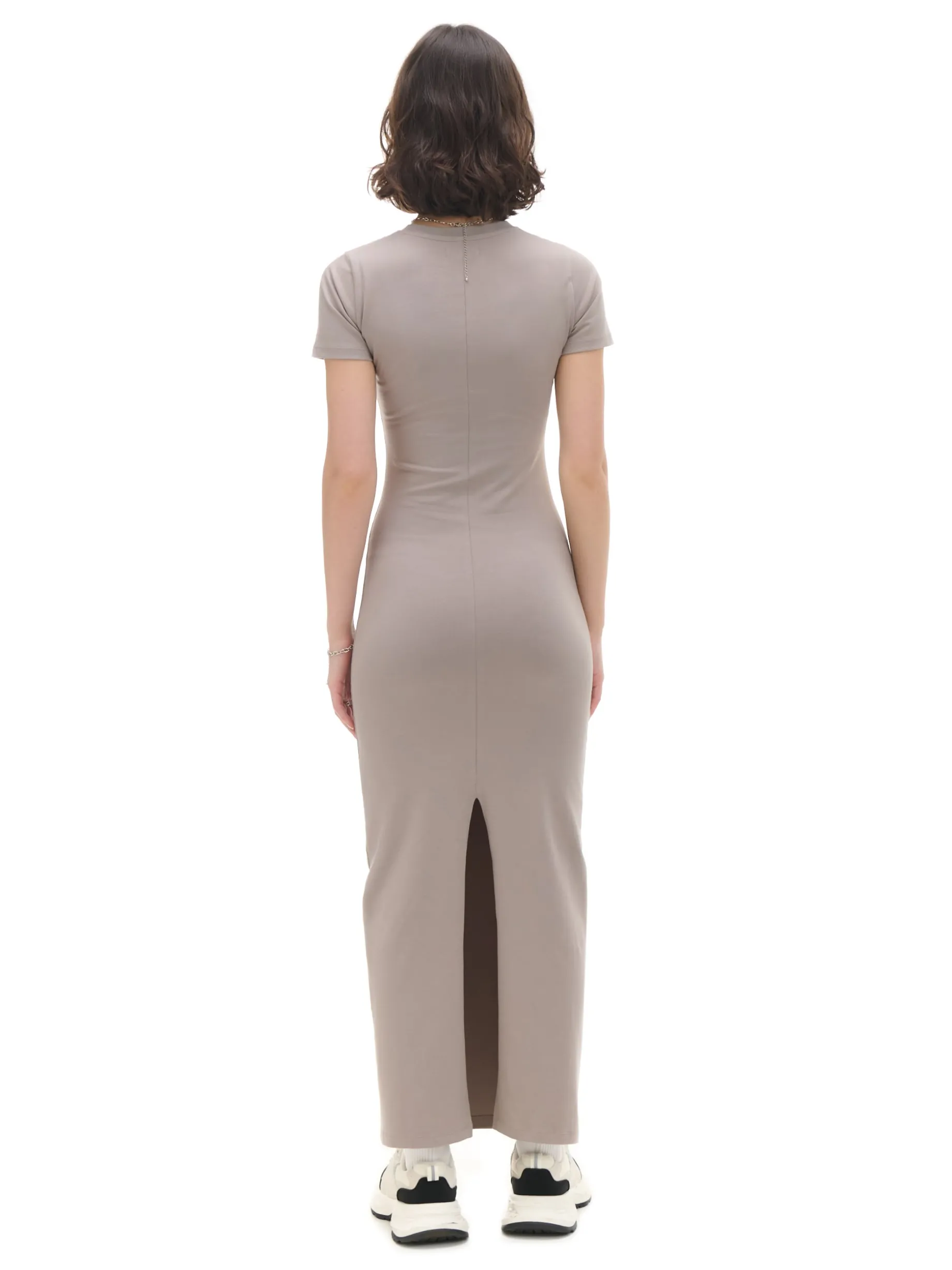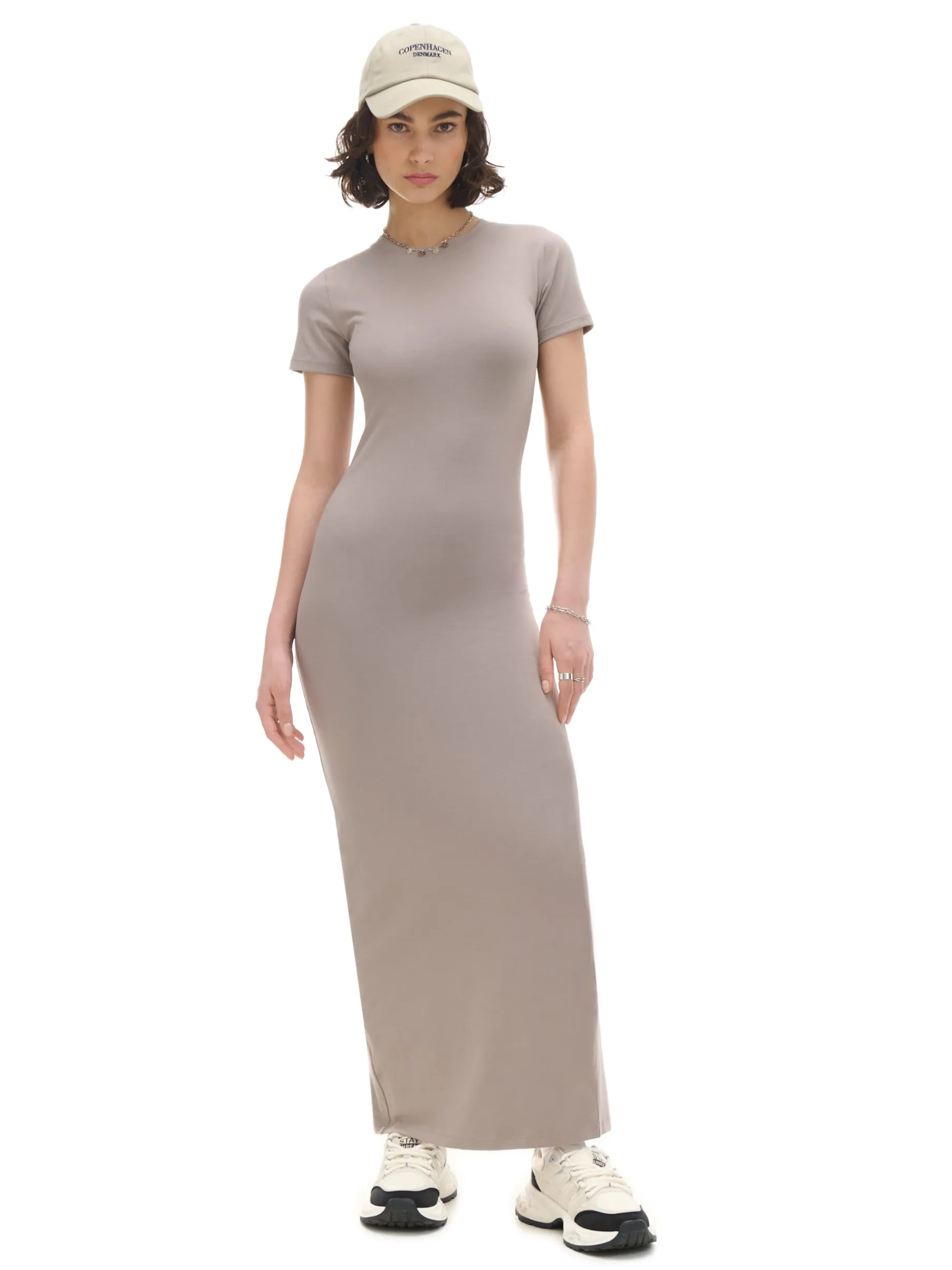 Damska sukienka maxi o dopasowanym kroju, uszyta z mieszanki dzianin z bawełną. Dobierz do tego modelu swoje ulubione dodatki i ruszaj na miasto! bawełna z dodatkiem elastycznych włókien długość maxi i dopasowany krój krótkie, ścięte rękawy półokrągły dekolt z lamówką Wzrost modelki: 172 cm