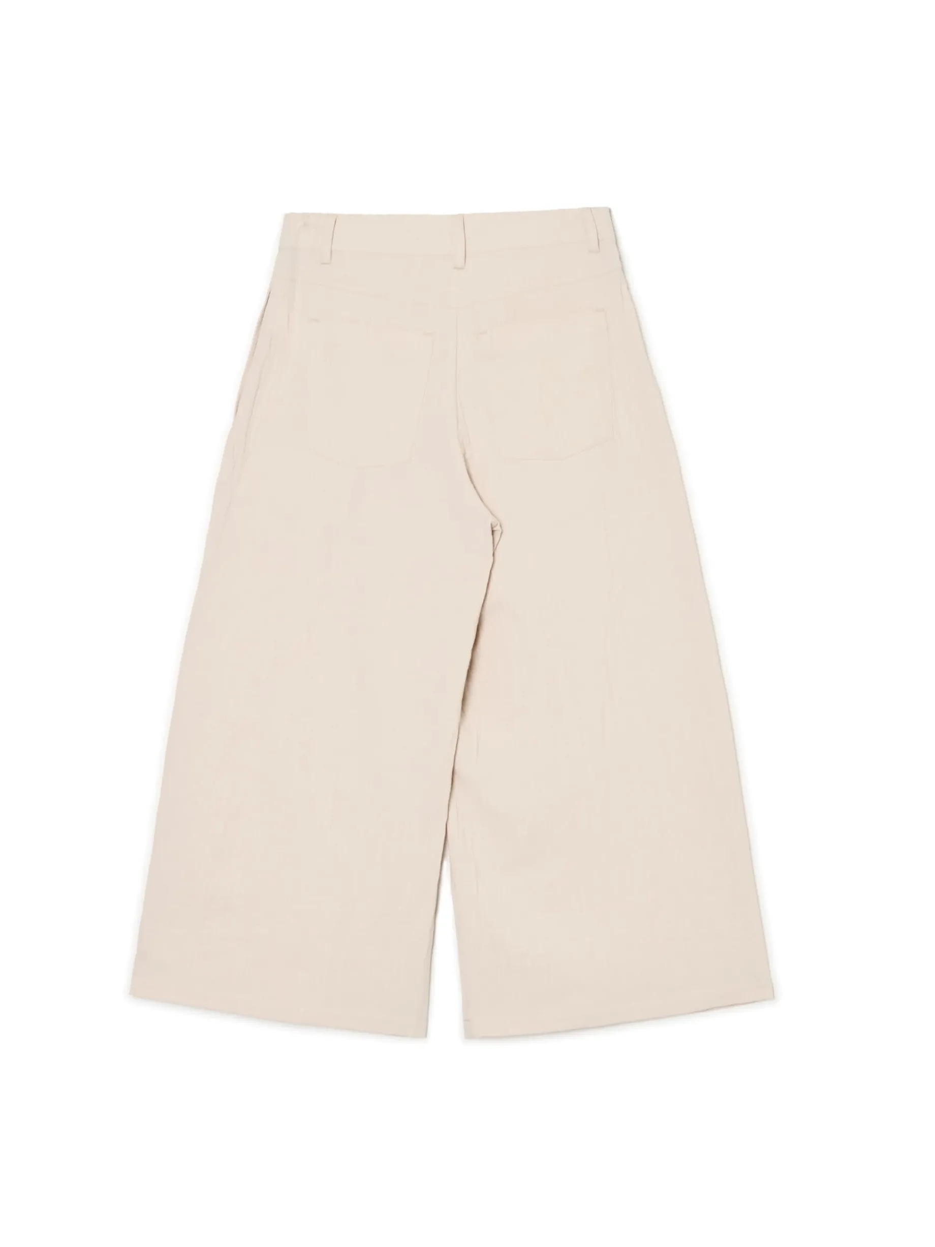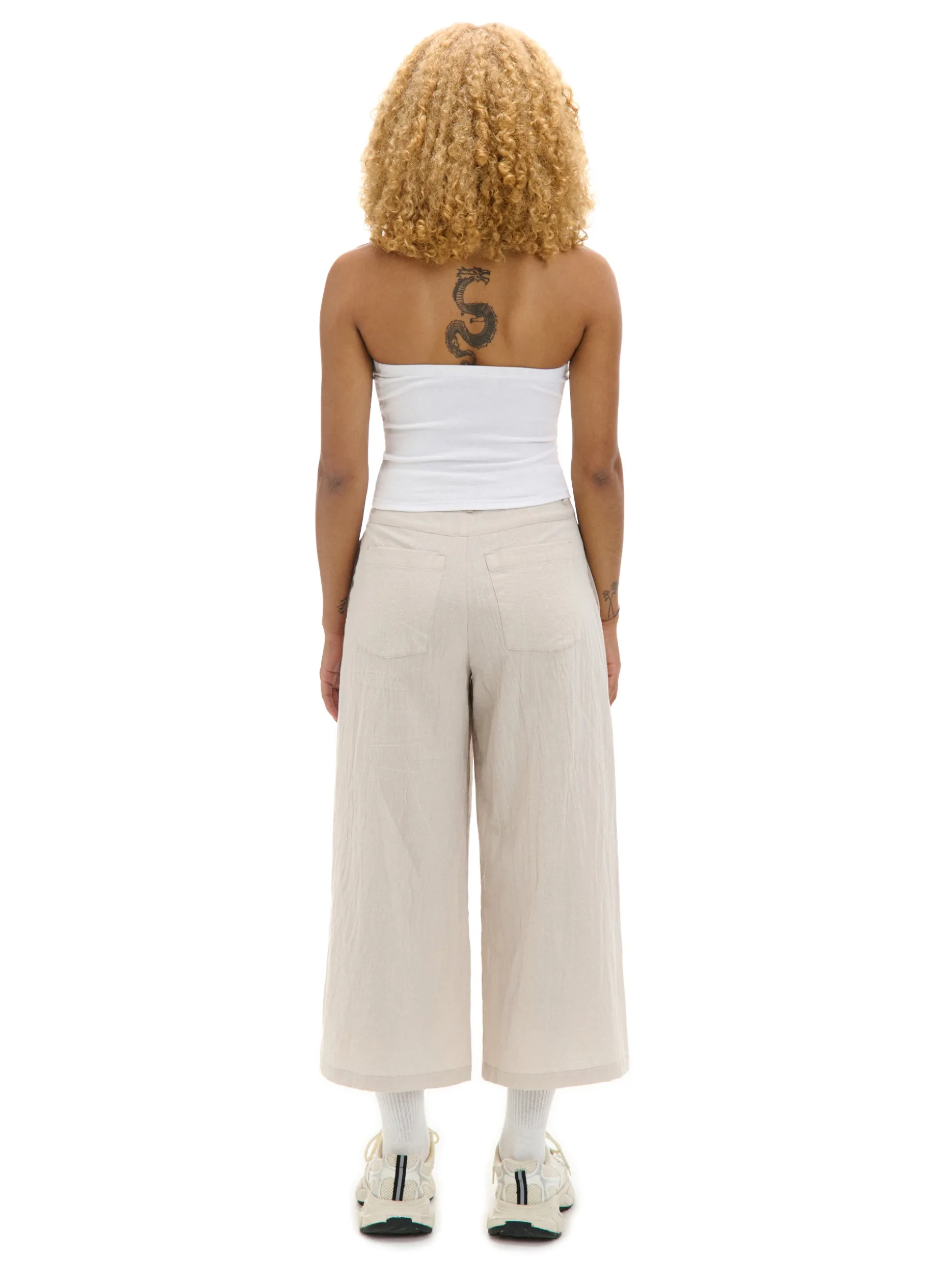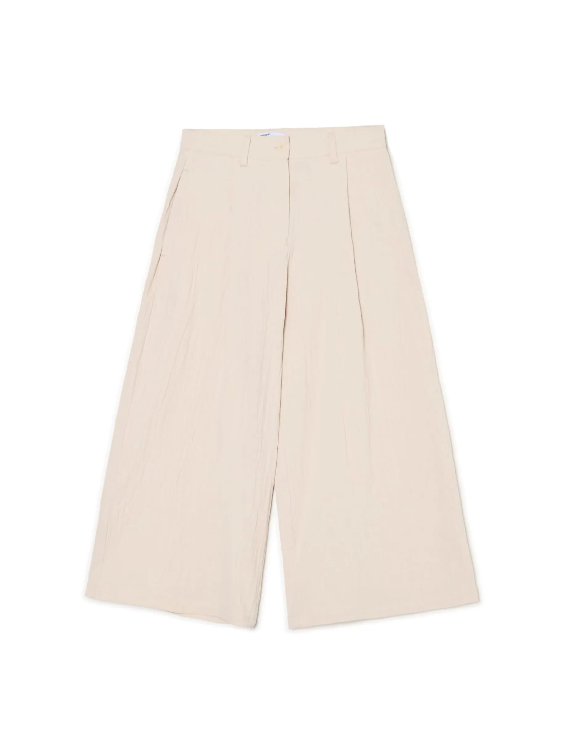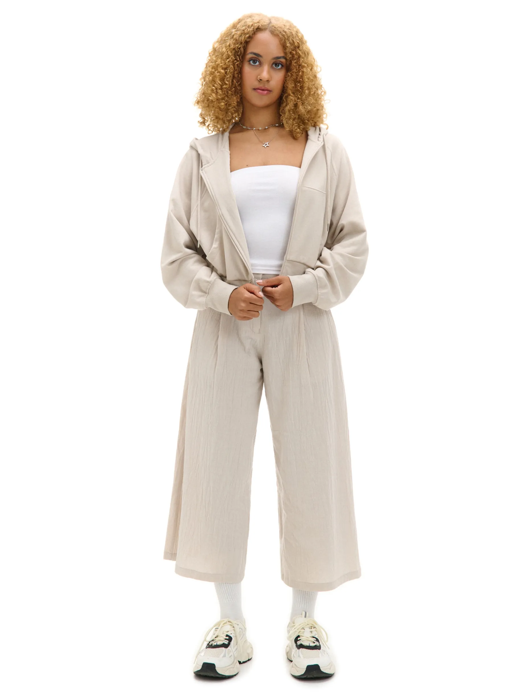 Tkaninowe damskie spodnie w kolorze beżowym, uszyte z bawełny. Kuloty są idealnym dodatkiem zarówno do eleganckich stylizacji, jak i casualowych. 100% bawełny spodnie typu kuloty zapięcie na zamek i guzik modelujące zakładki z przodu szerokie nogawki dwie kieszenie po bokach szlufki blisko siebie