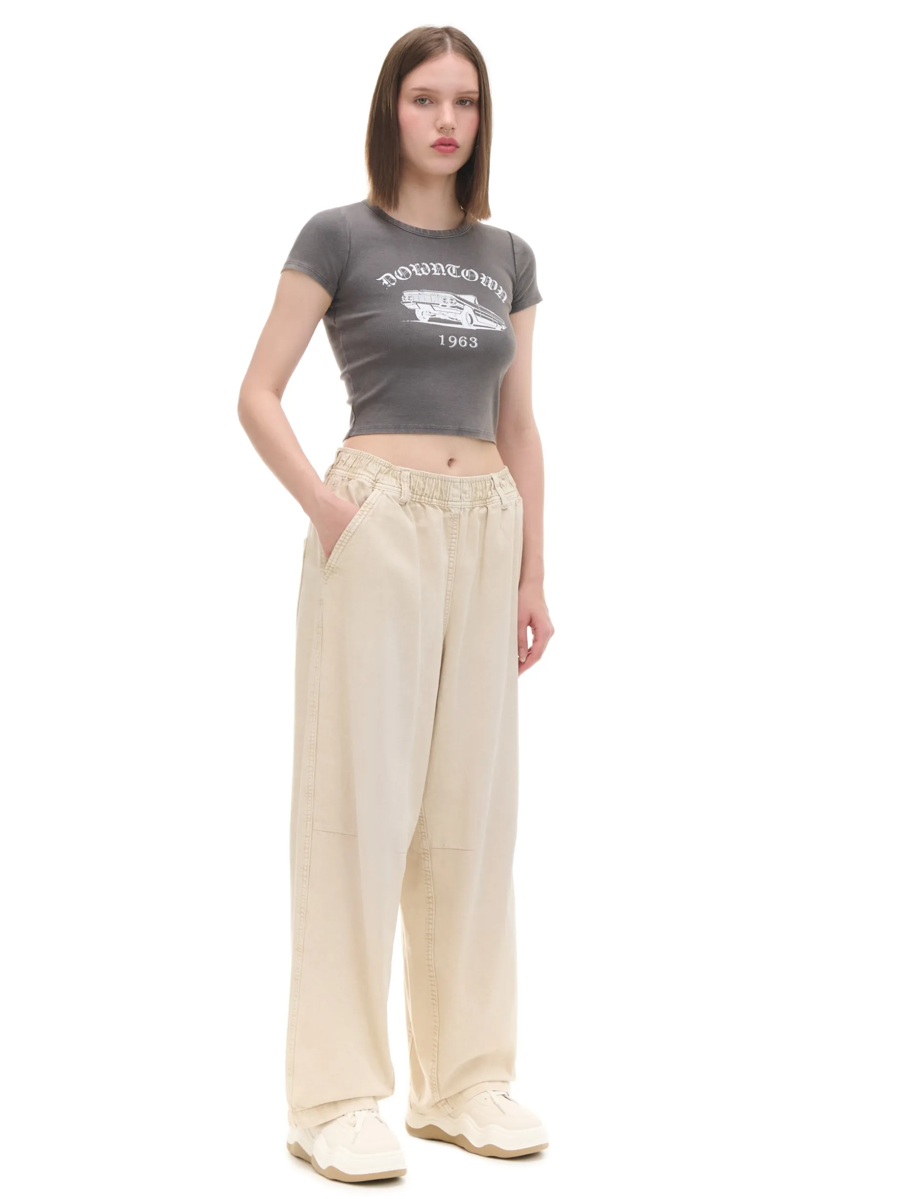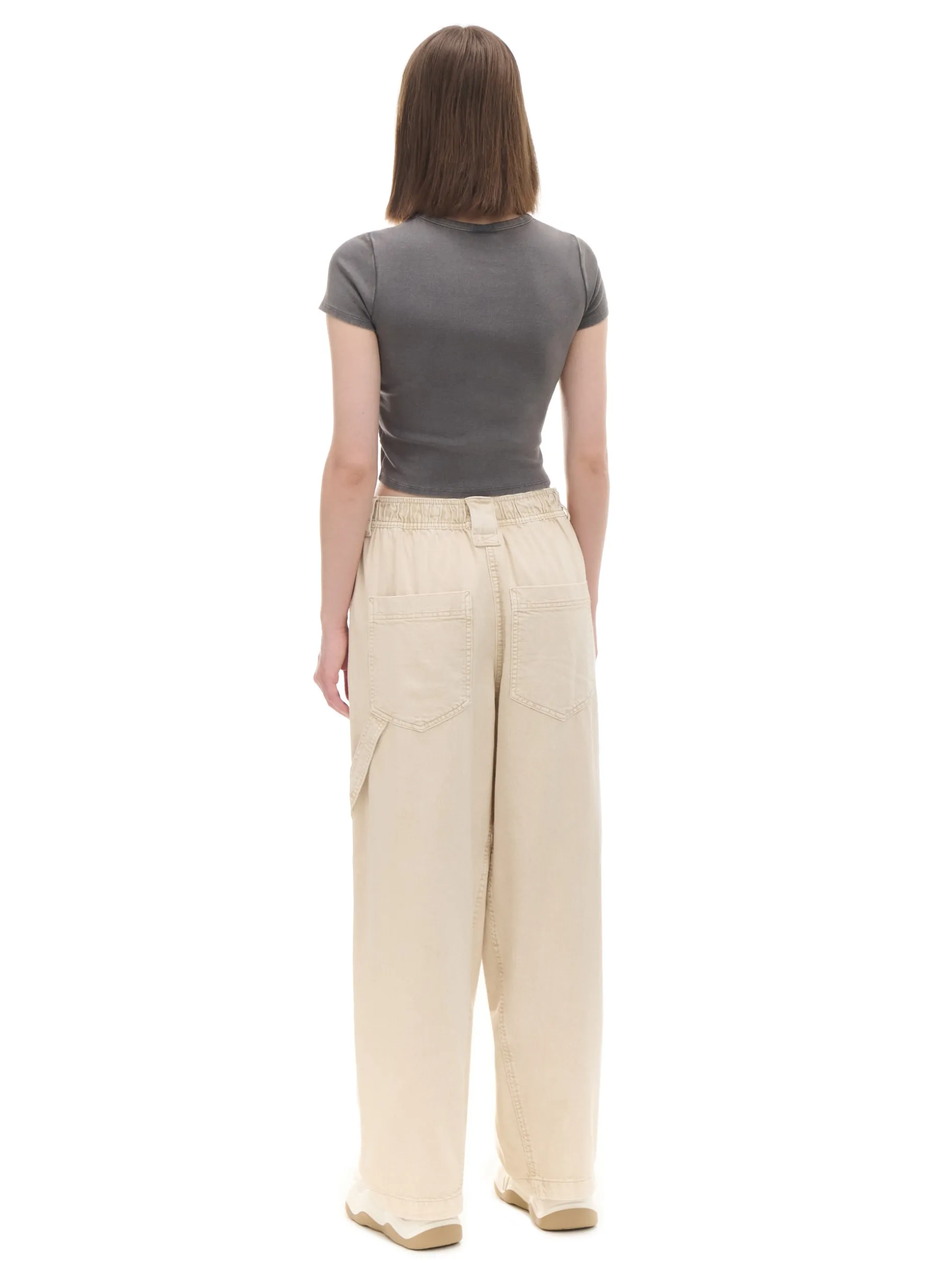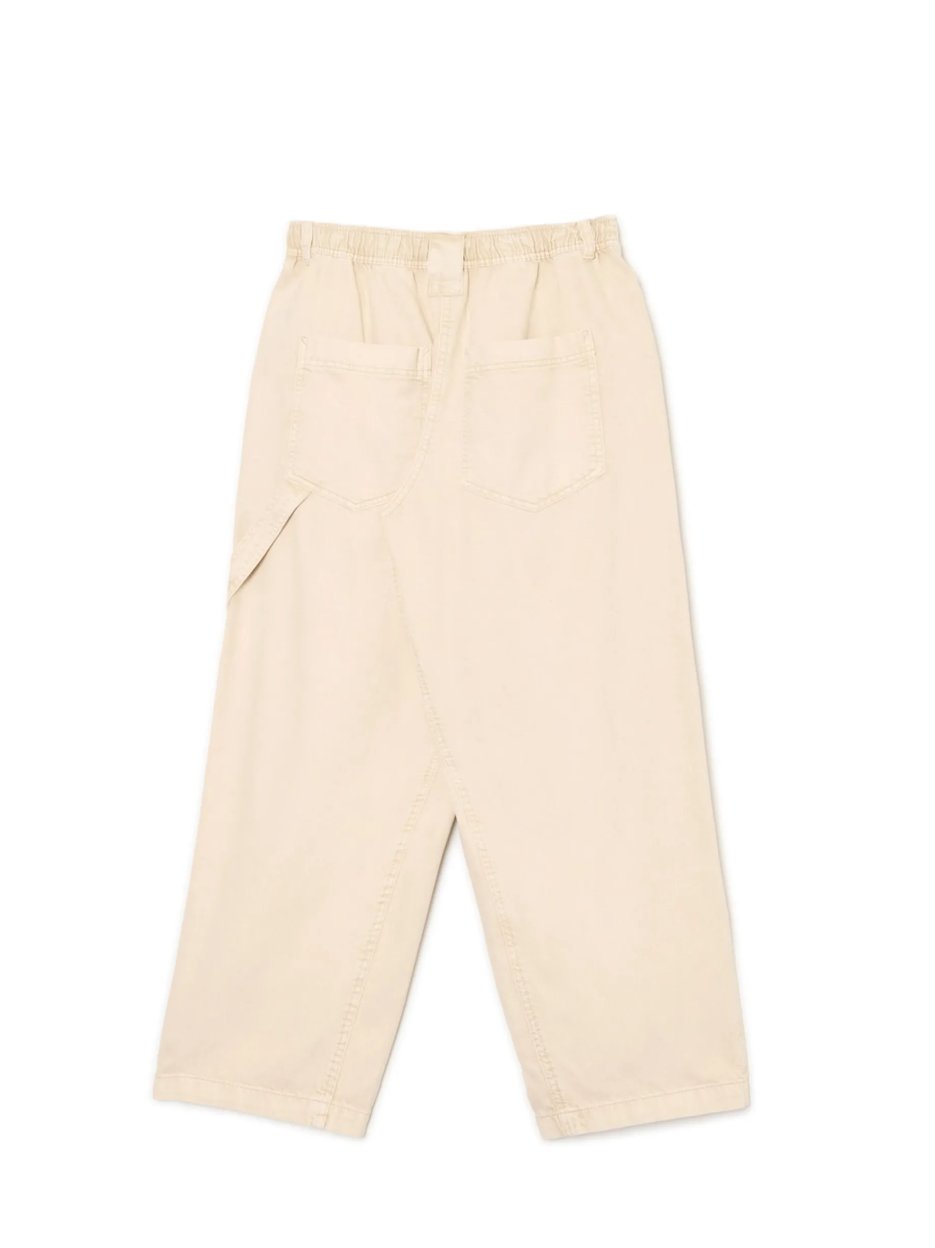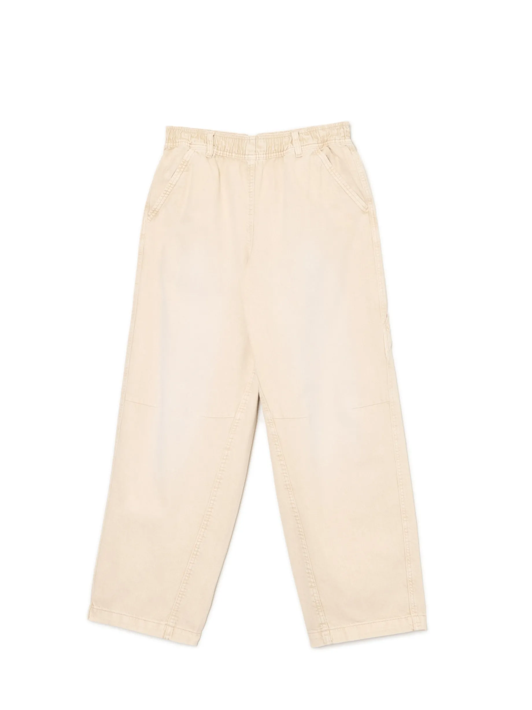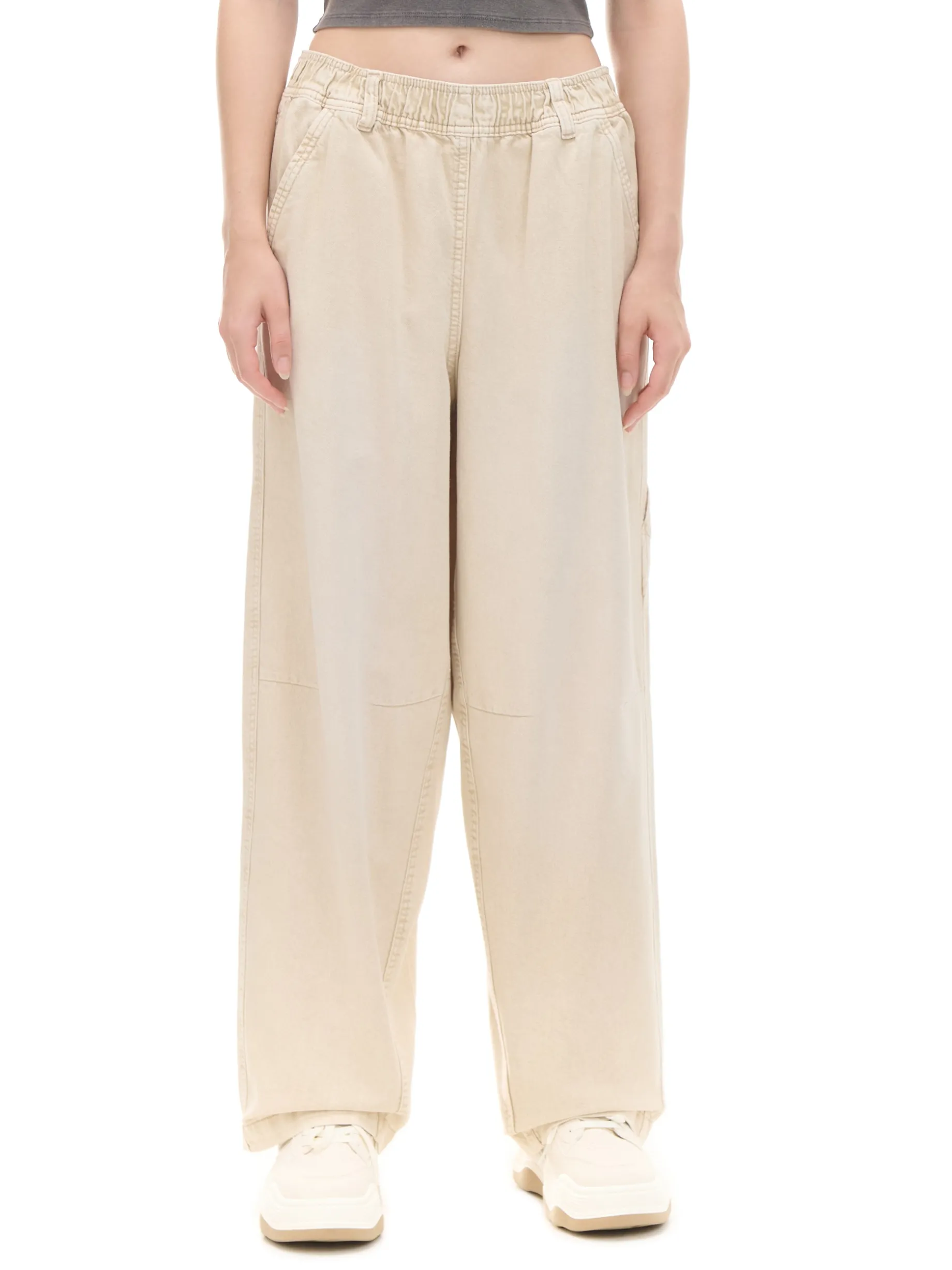Damskie beżowe spodnie, uszyte z bawełnianego, wytrzymałego diagonalu. luźny krój baggy bardzo szeroka nogawka wysoki stan, w pasie elastyczna gumka cztery kieszenie ukośne przeszycia na wysokości kolan pasek typu carpenter delikatny efekt sprania materiału Wzrost modelki: 172 cm