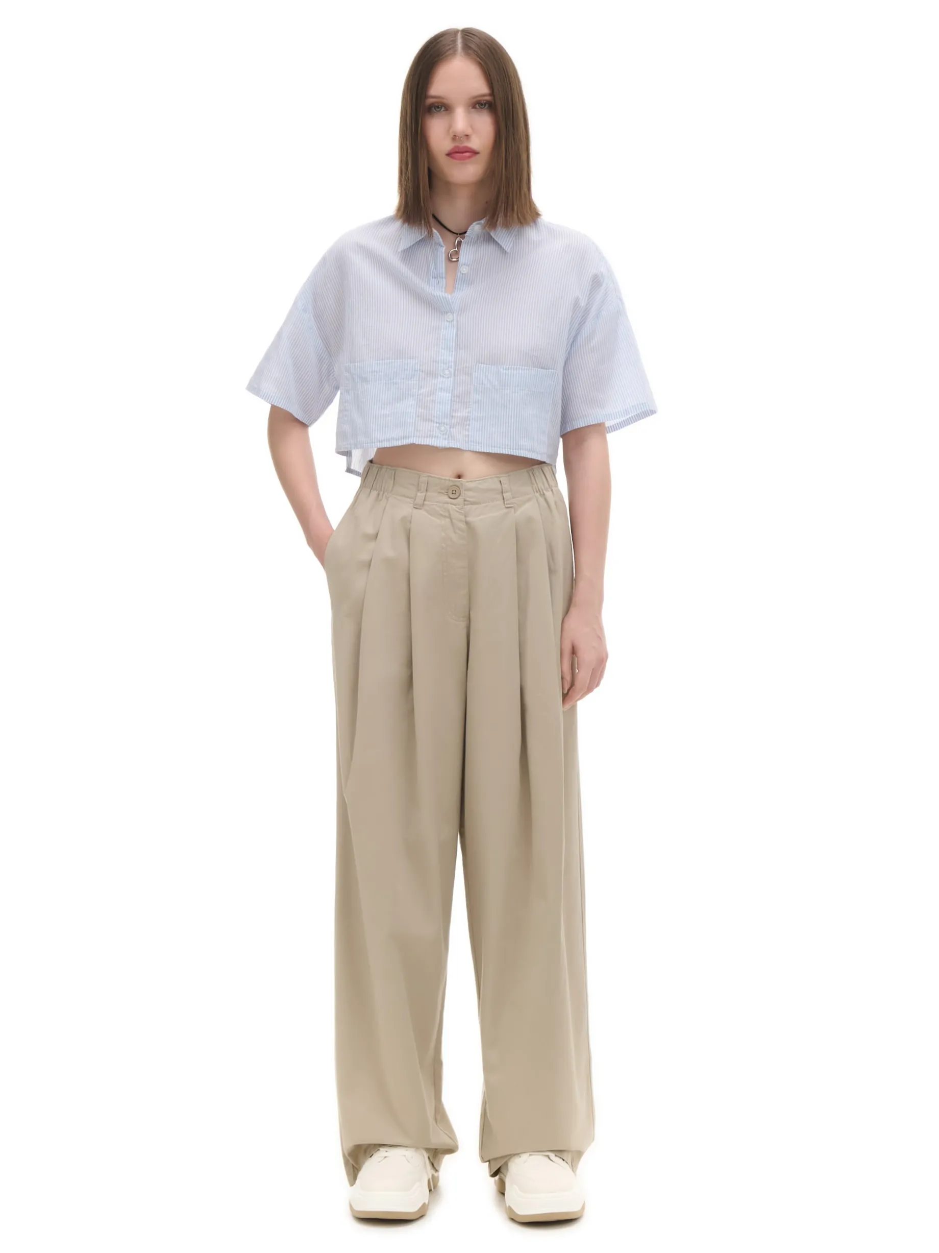 Damskie spodnie o kroju wide leg, uszyte z bawełny. Dzięki specjalnym zakładkom modelującym, ten item będzie się pięknie prezentował. 100% bawełny długie, szerokie nogawki zapięcie na zamek i guzik elastyczna gumka w pasie dwie kieszenie z przodu dwie naszyte kieszenie tylnie modelujące zakładki z przodu szlufki na pasek Wzrost modelki: 172 cm