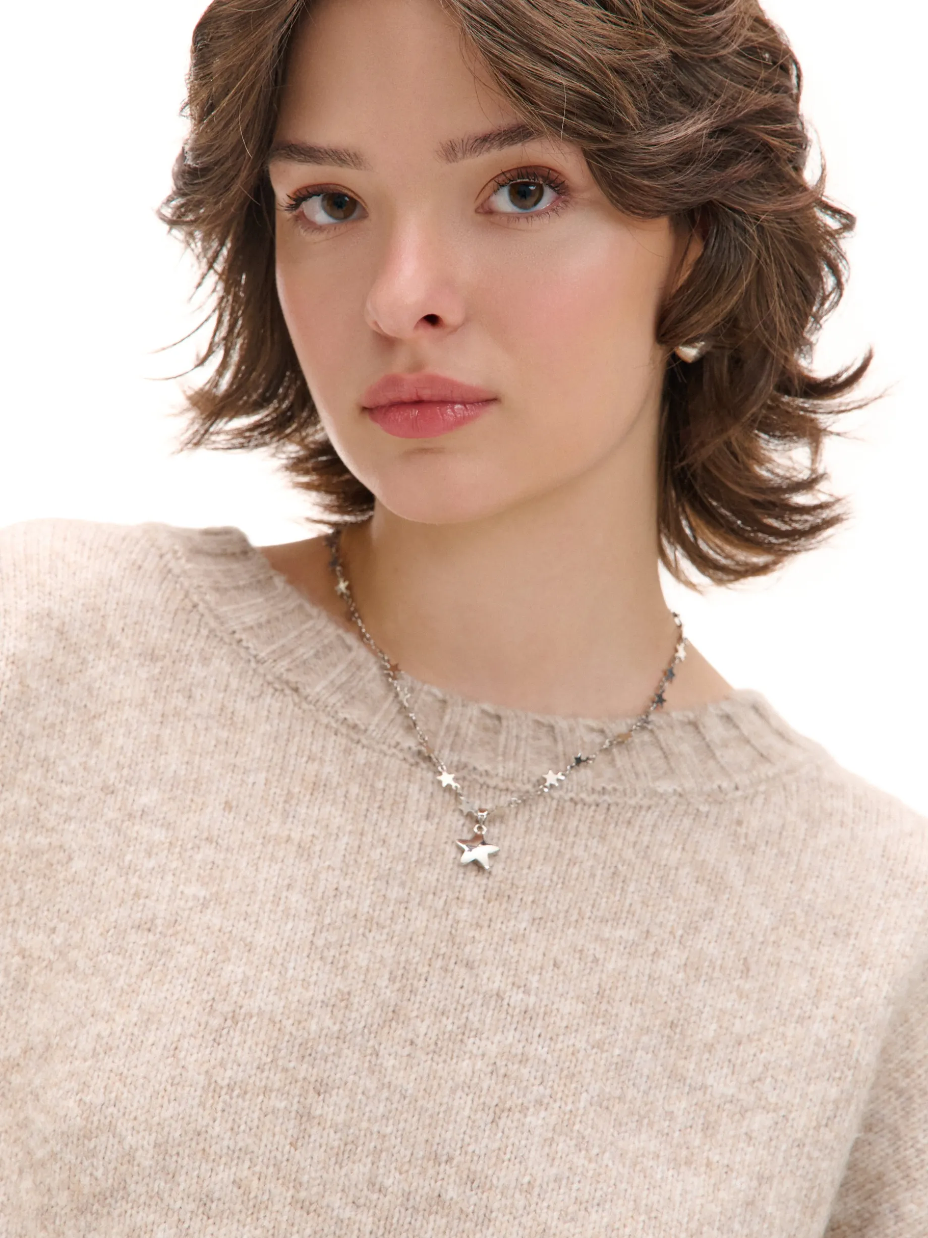 Damski sweter w dotyku przypominającym wełniany koc. Uszyty z solidnej mieszanki dzianin, która zapewnia ciepło w chodne dni. Idealny item na chillowanie z herbatą na kanapie lub jesienne spacery z bestie! przyjemny w dotyku materiał regularny krój okrągły dekolt wykończony ozdobnym ściągaczem długie rękawy z obniżoną linią ramion dół i rękawy wykończone prążkowanym ściągaczem