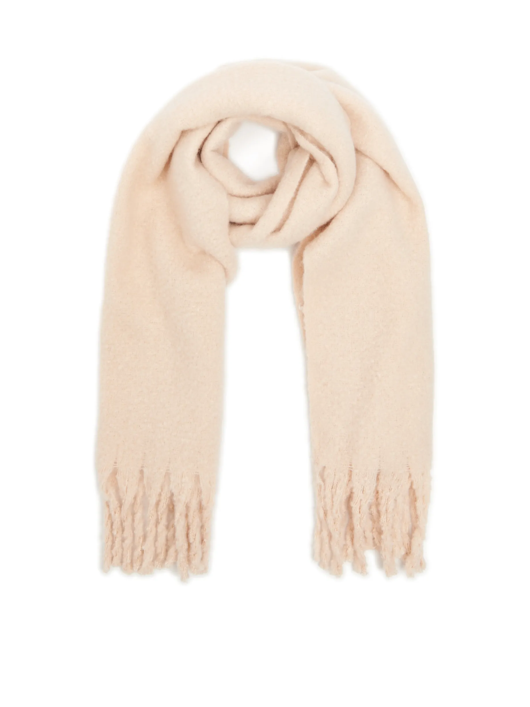 Beżowy szalik damski uszyty z miękkiej i ciepłej dzianiny, wykończony ozdobnymi frędzlami..