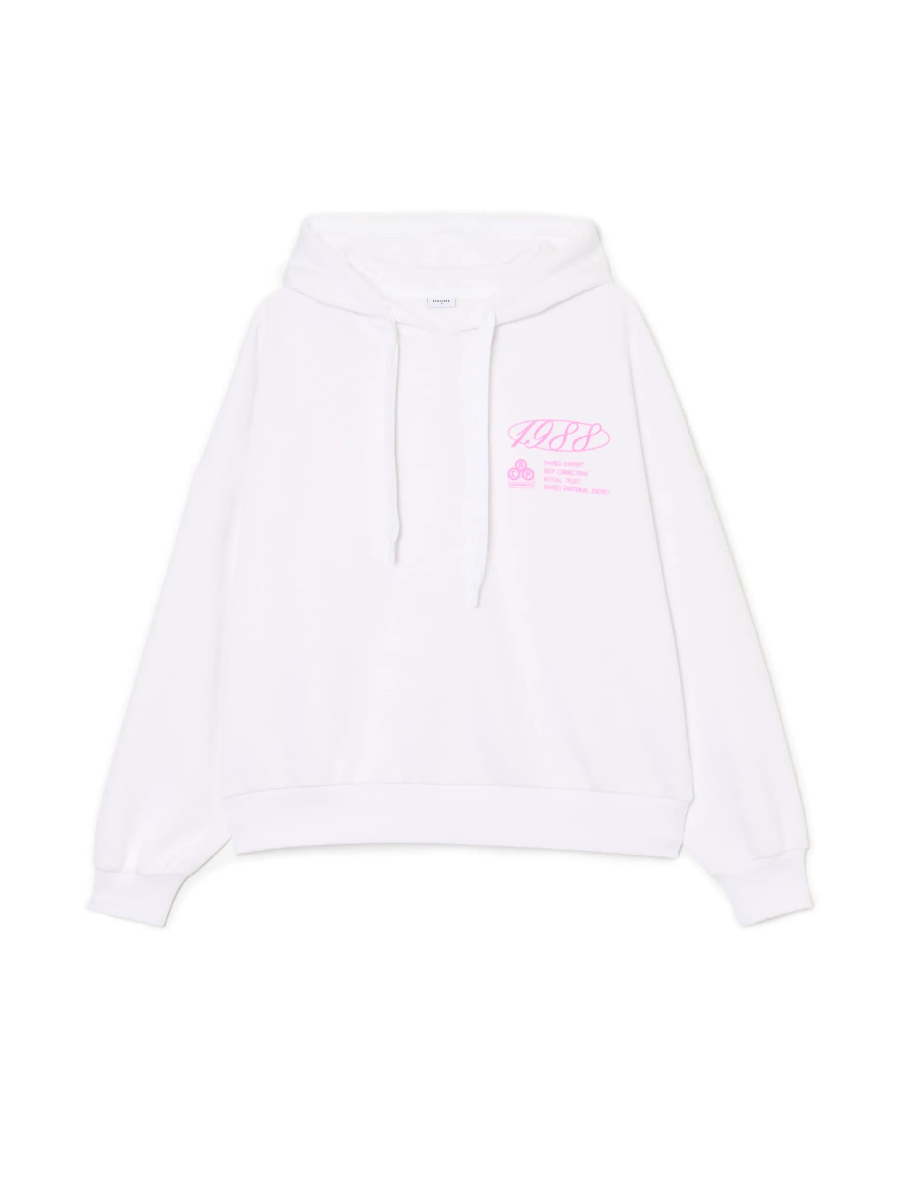 Damska luźna bluza hoodie uszyta z mieszanki dzianin z dodatkiem miękkiej bawełny fleecy. Wykończenie ściągaczami zapobiega unoszeniu się materiału. Item wygodny zarówno w czasie zimowych spacerów z Bestie, jak i chillowania na kanapie. dzianinowy materiał z bawełną regularny krój miękki kaptur z troczkami długie, swobodne rękawy dół i rękawy wykończone prążkowanym ściągaczem mały nadruk na piersi, duży nadruk na plecach