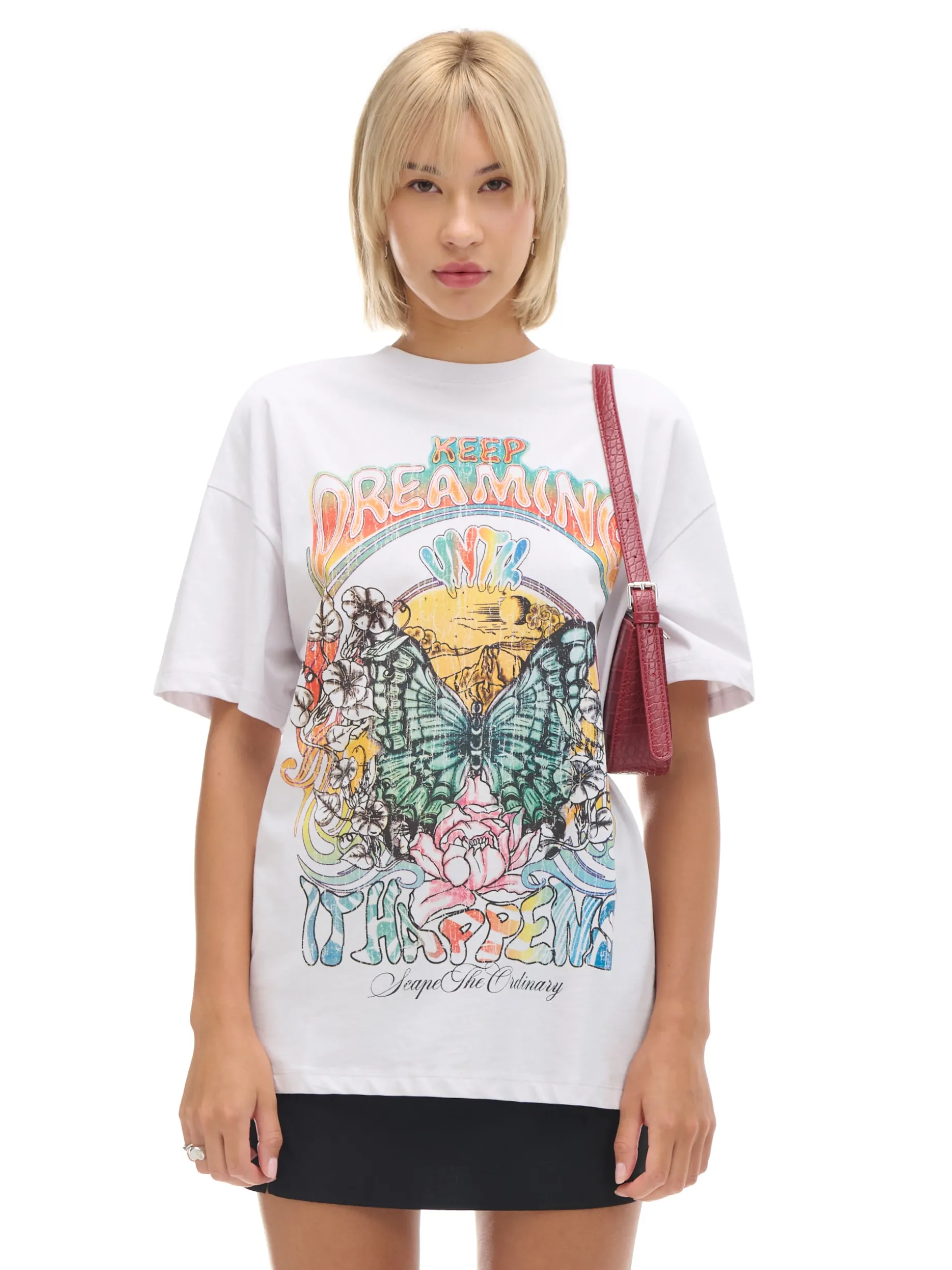 T-shirt damski uszyty z bawełnianej dzianiny z krótkim rękawem. Na przodzie wzorzysty, kolorowy nadruk z delikatnym efektem sprania. 100% bawełny krój oversize krótkie, swobodne rękawy z przodu kolorowy nadruk i napis Ten produkt należy do kolekcji UNISEX – zalecamy wybranie mniejszego rozmiaru niż zazwyczaj, jeśli chcesz uniknąć efektu oversize.