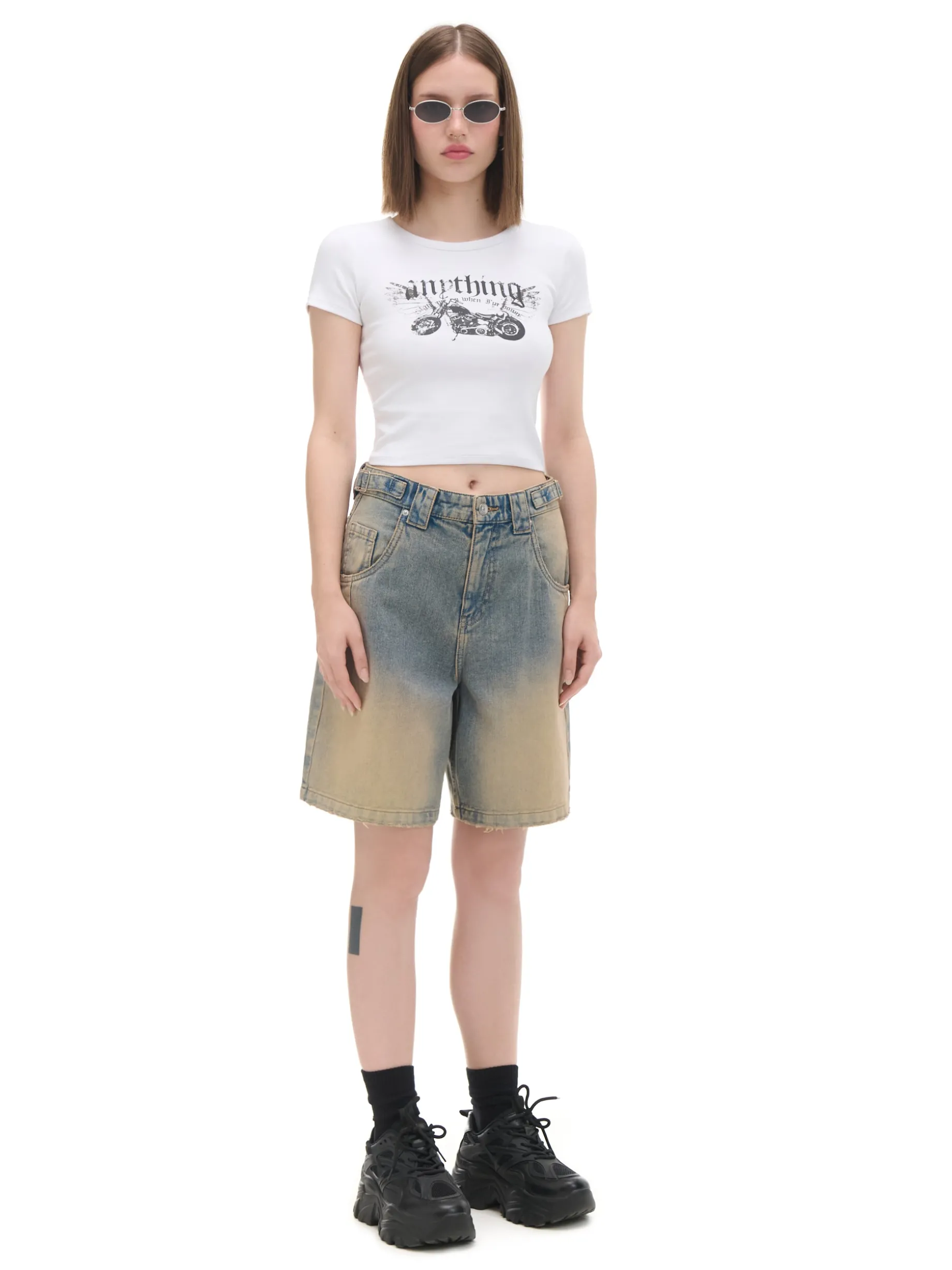 Damski T-shirt uszyty z mieszanki bawełnianej i elastycznej dzianiny. Na przodzie nadruk z motoryzacyjnym motywem w stylu vintage. bawełna z dodatkiem elastycznych włókien krótki, dopasowany fason krótkie rękawy duży nadruk z przodu Wzrost modelki: 172 cm