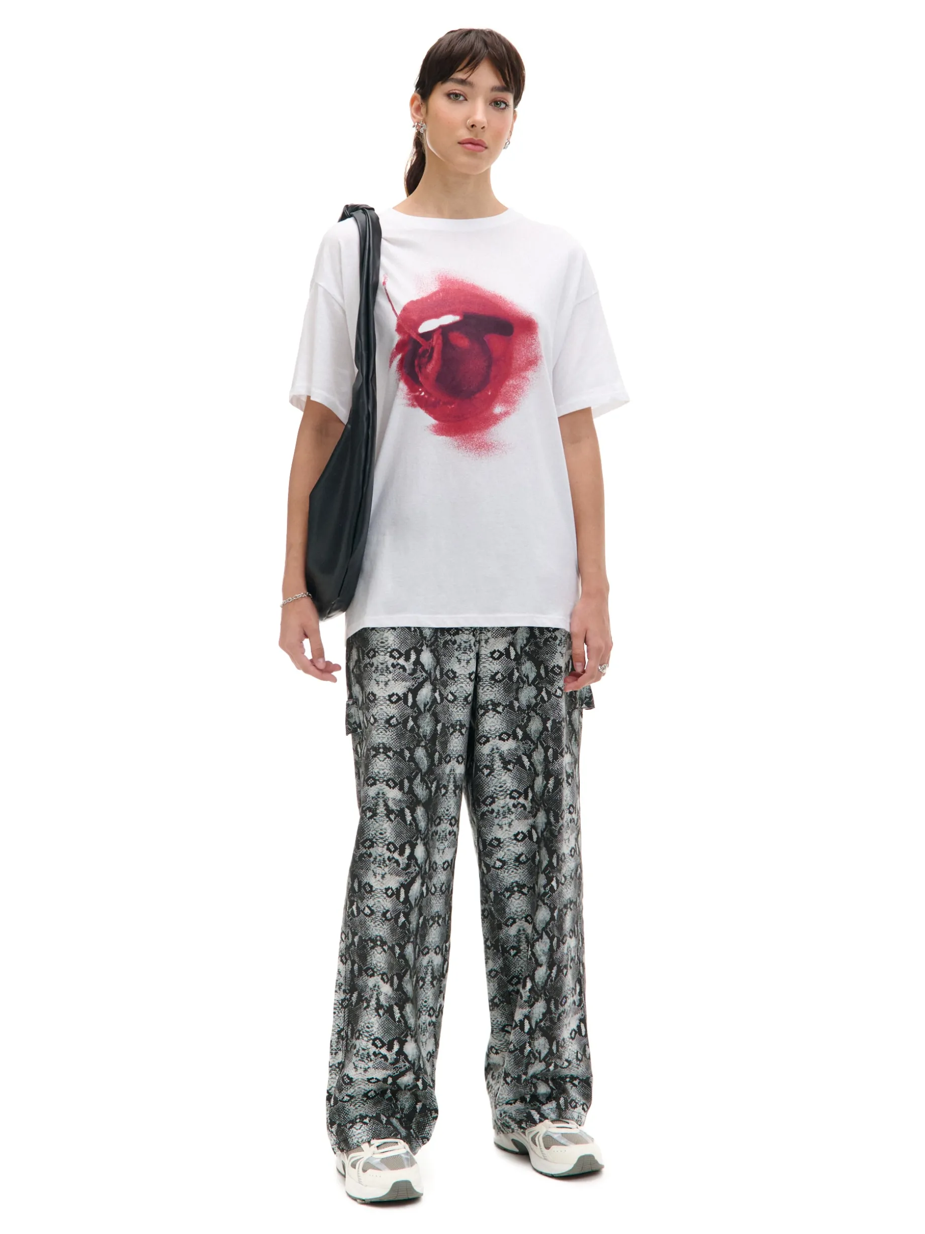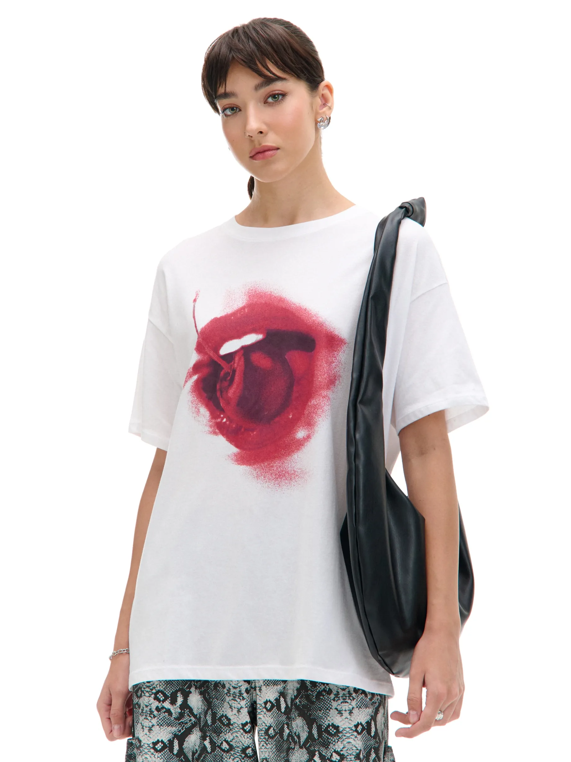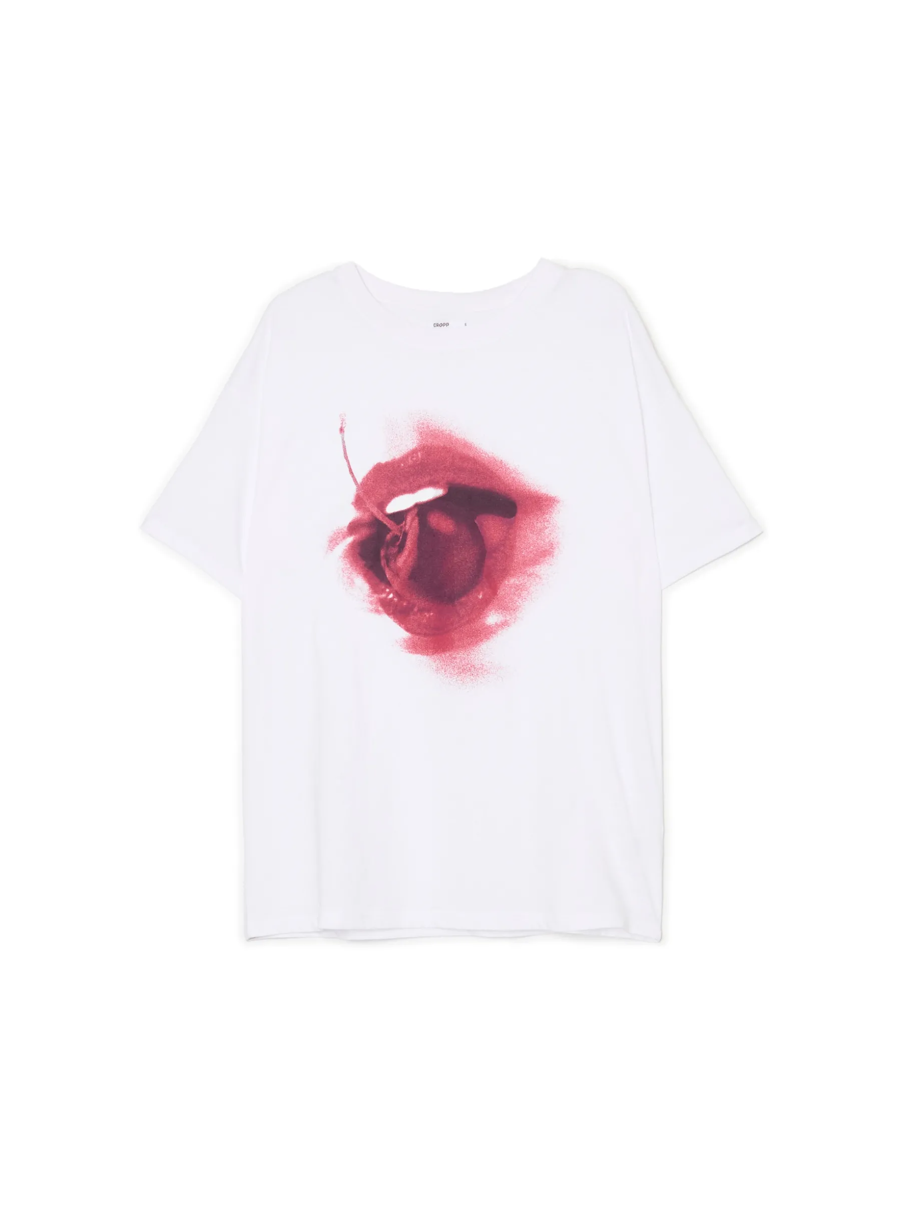 Bawełniana damska koszulka z krótkim rękawem o luźnym kroju z wyrazistym nadrukiem w czerwonym odcieniu z motywem wiśni i ust. 100% bawełny krój oversize krótkie, swobodne rękawy okrągły dekolt z lamówką oryginalny print