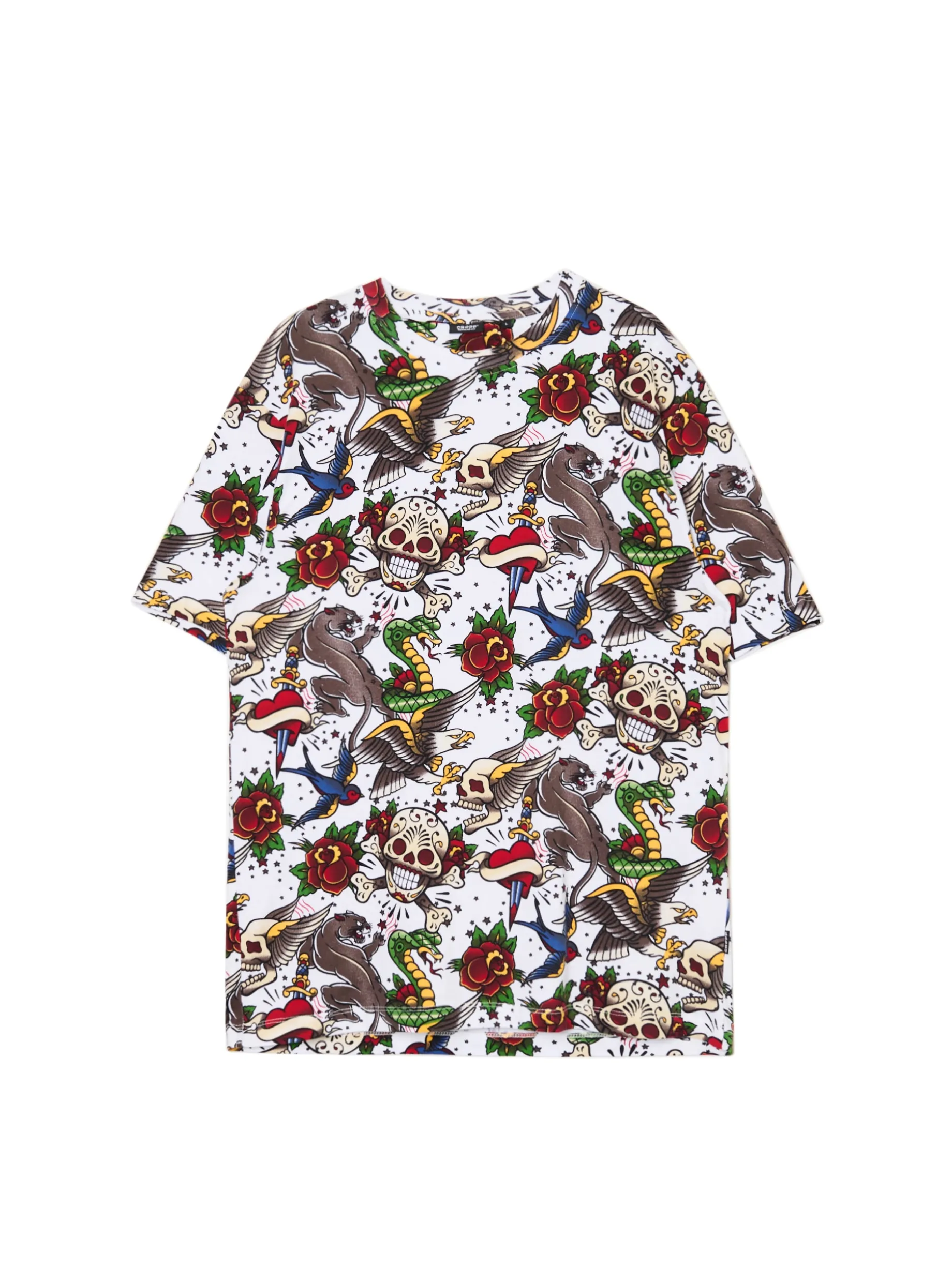 Męski T-shirt, uszyty z lekkiej bawełnianej dzianiny. Zakochasz się w tym oryginalnym nadrukiem w punkowym stylu! 100% bawełny regularny krój półokrągły dekolt krótkie, swobodne rękawy oryginalny print all over