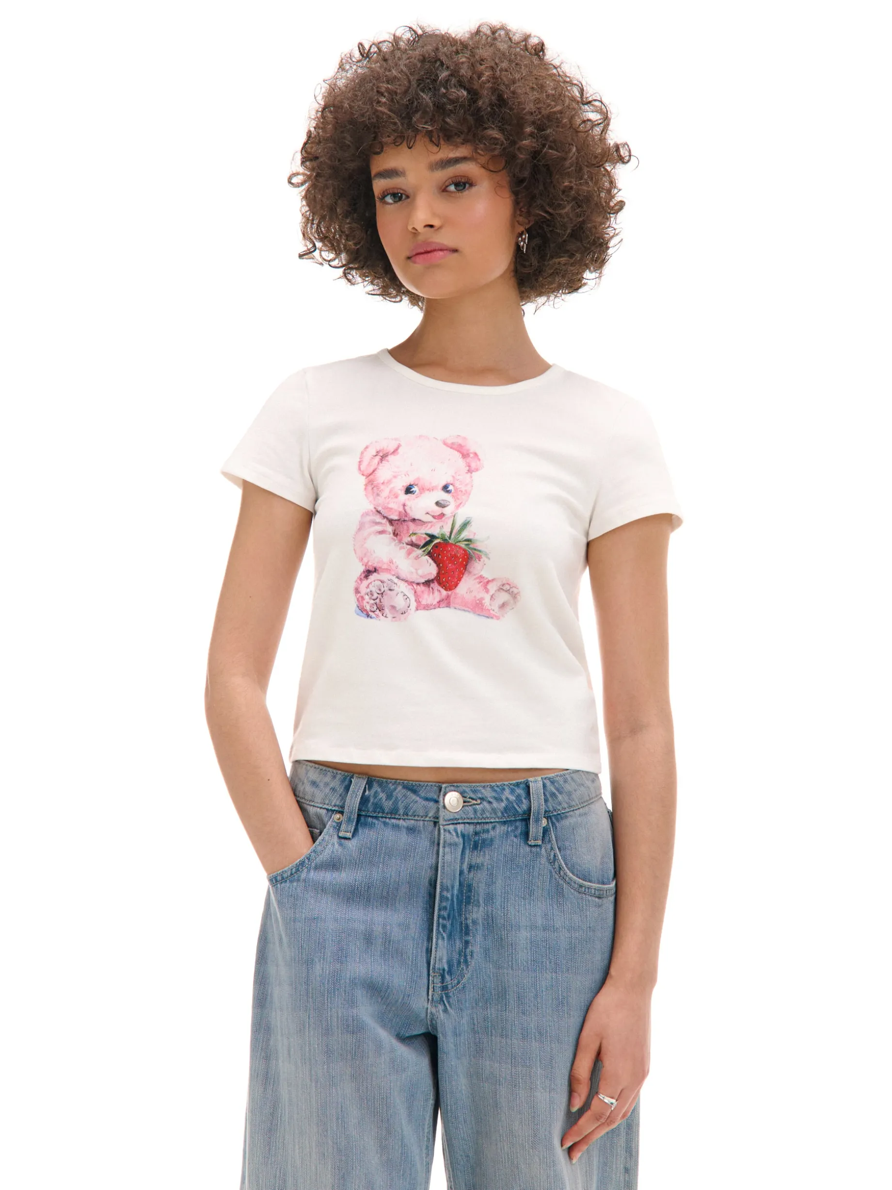 Damski T-shirt z krótkim rękawem uszyty z bawełnianej tkaniny z dodatkiem elastycznych włókien. Na przodzie duży nadruk z uroczym, różowym misiem trzymającym truskawkę. Wrzuć słodziaka do koszyka! bawełna z dodatkiem elastycznych włókien dopasowany krój podkreślający sylwetkę okrągły dekolt krótkie, ścięte rękawy oryginalny print