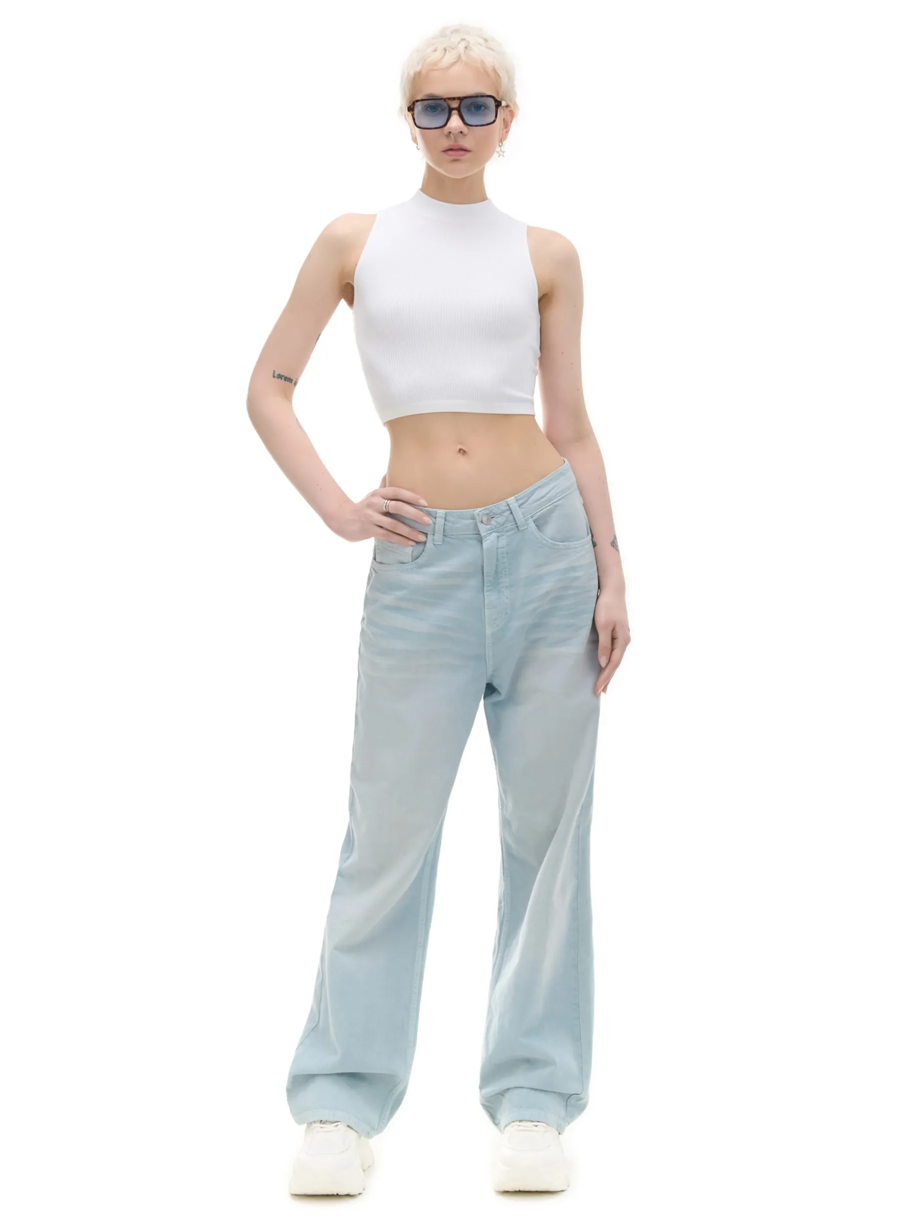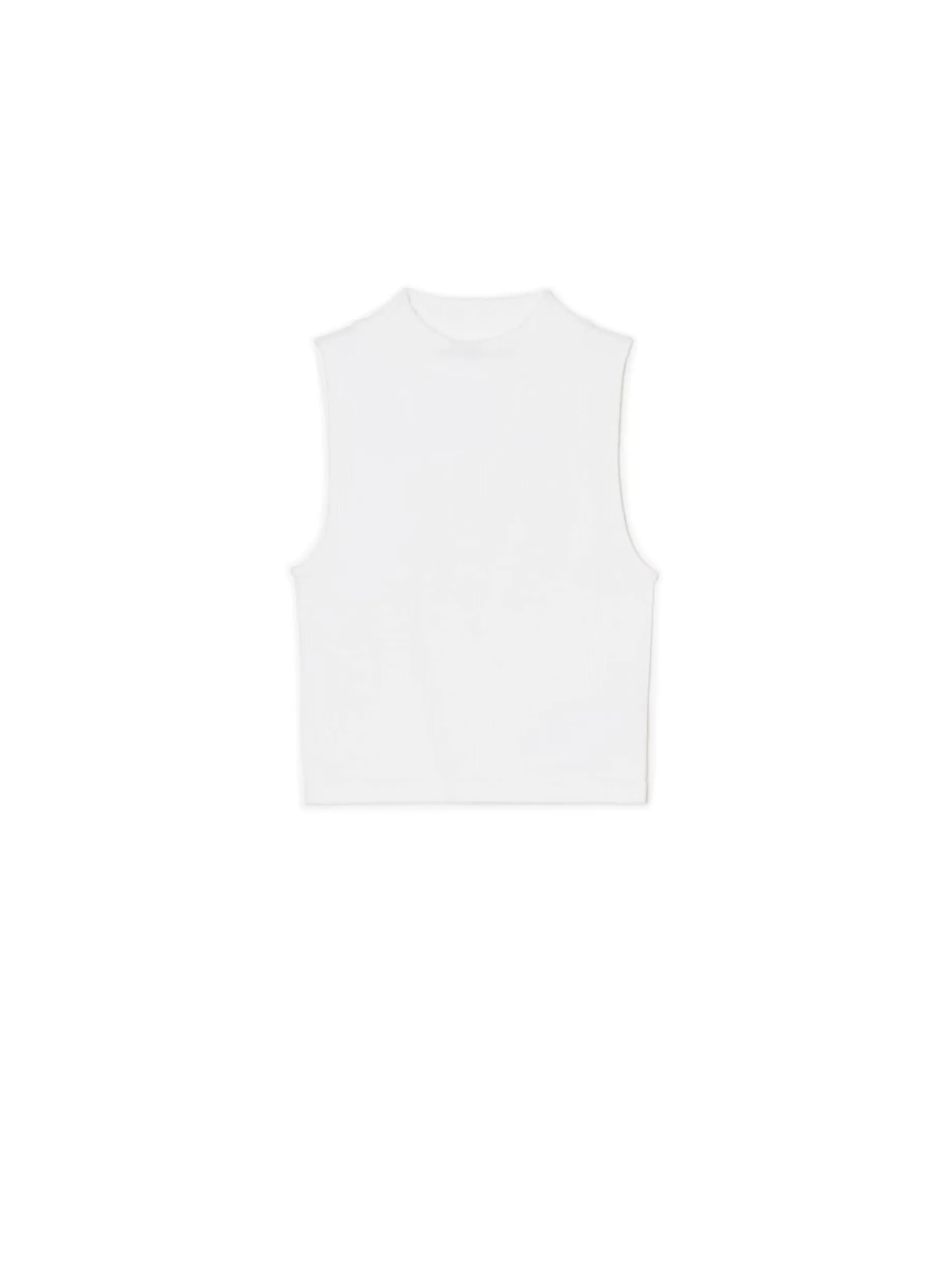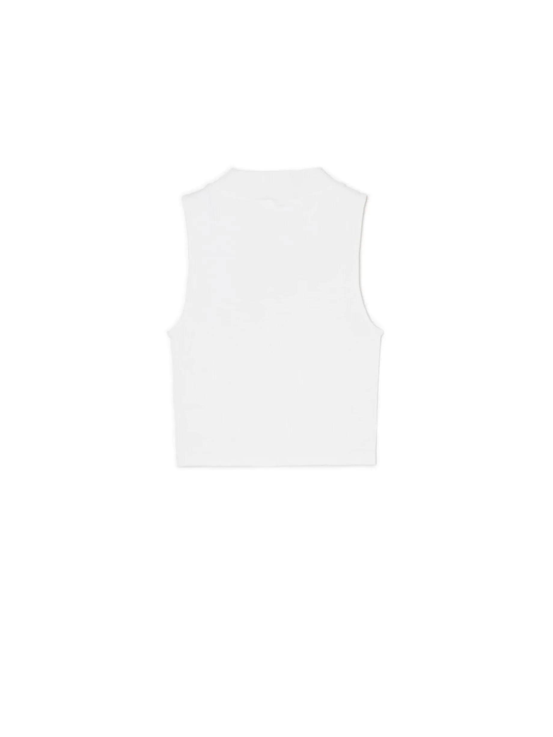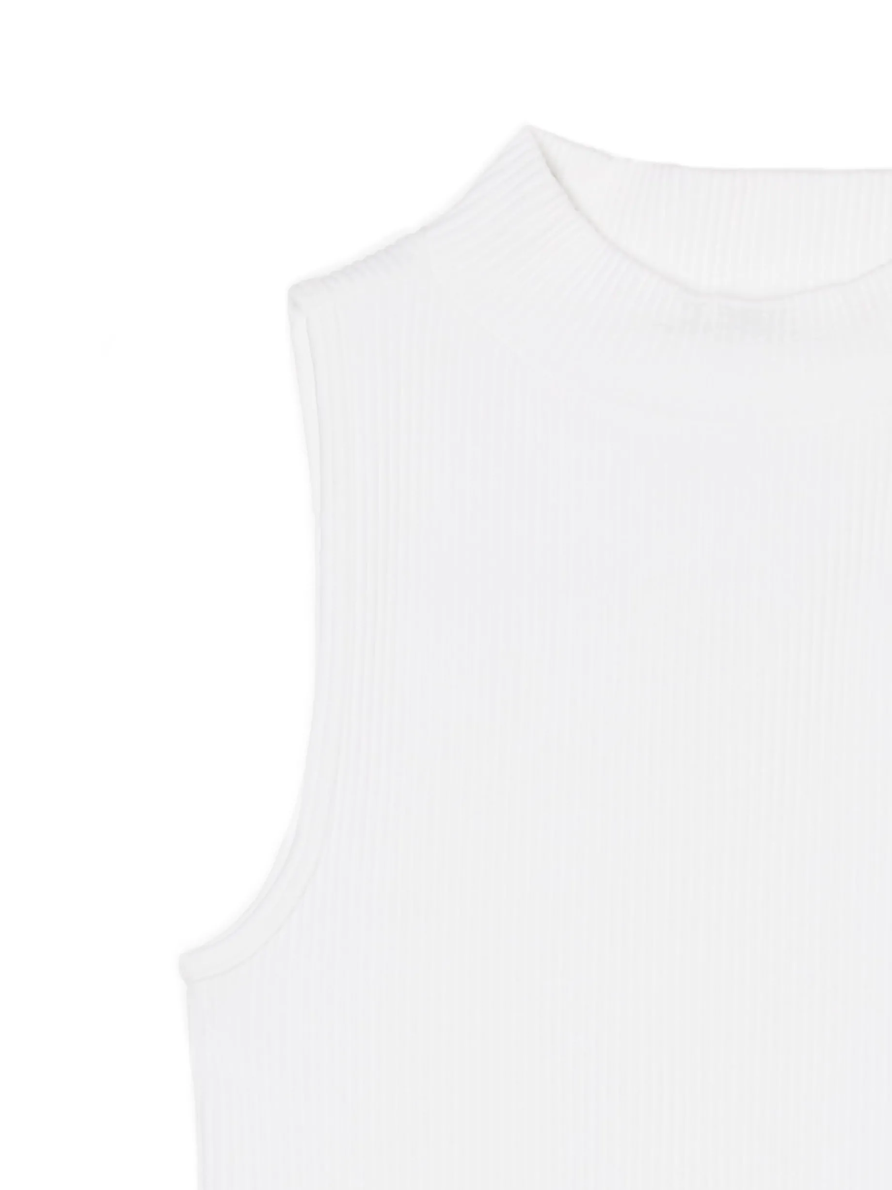 Damska biała koszulka prążkowana na całej długości, bez rękawów i ze stójką. Idealny dodatek do wielu stylizacji.