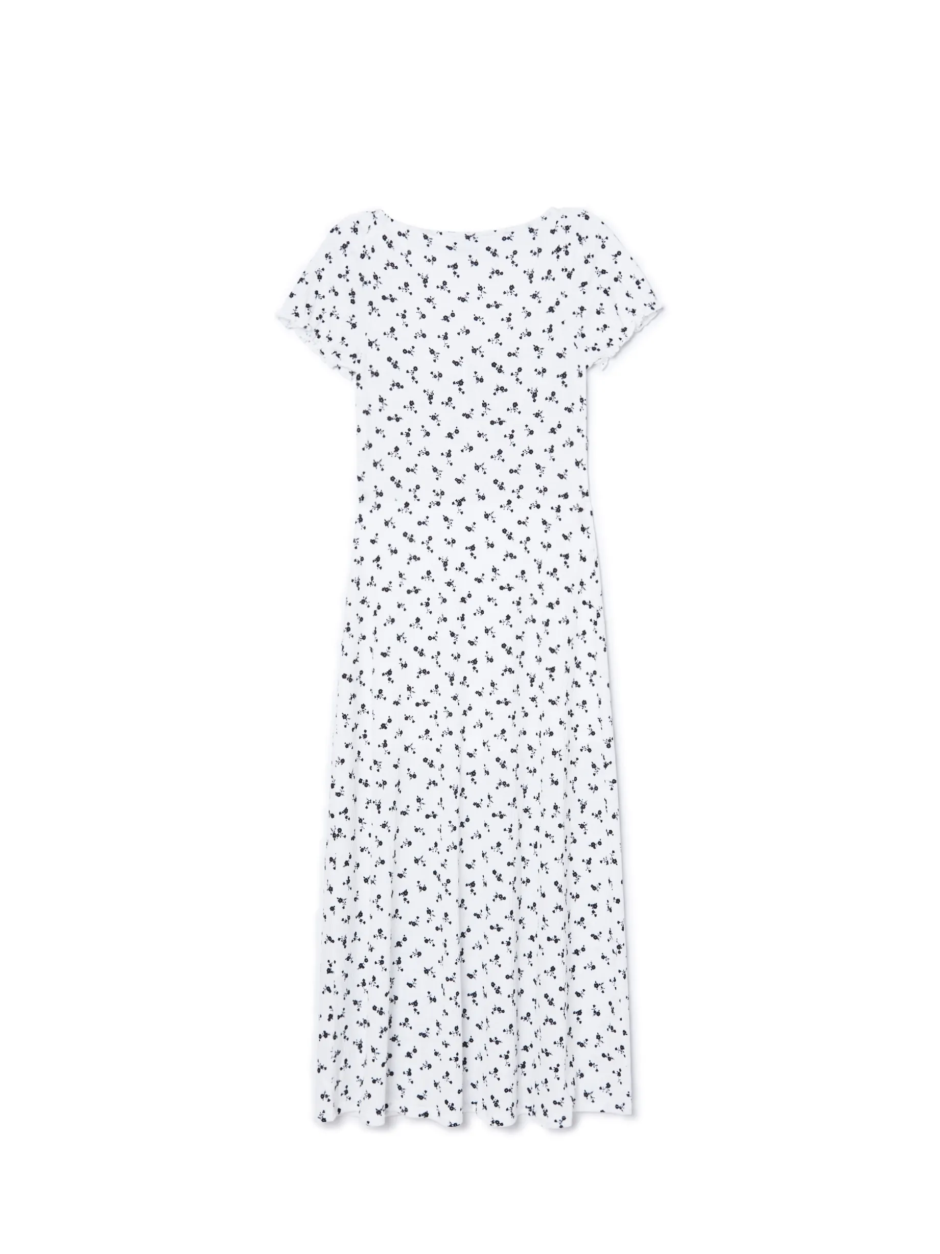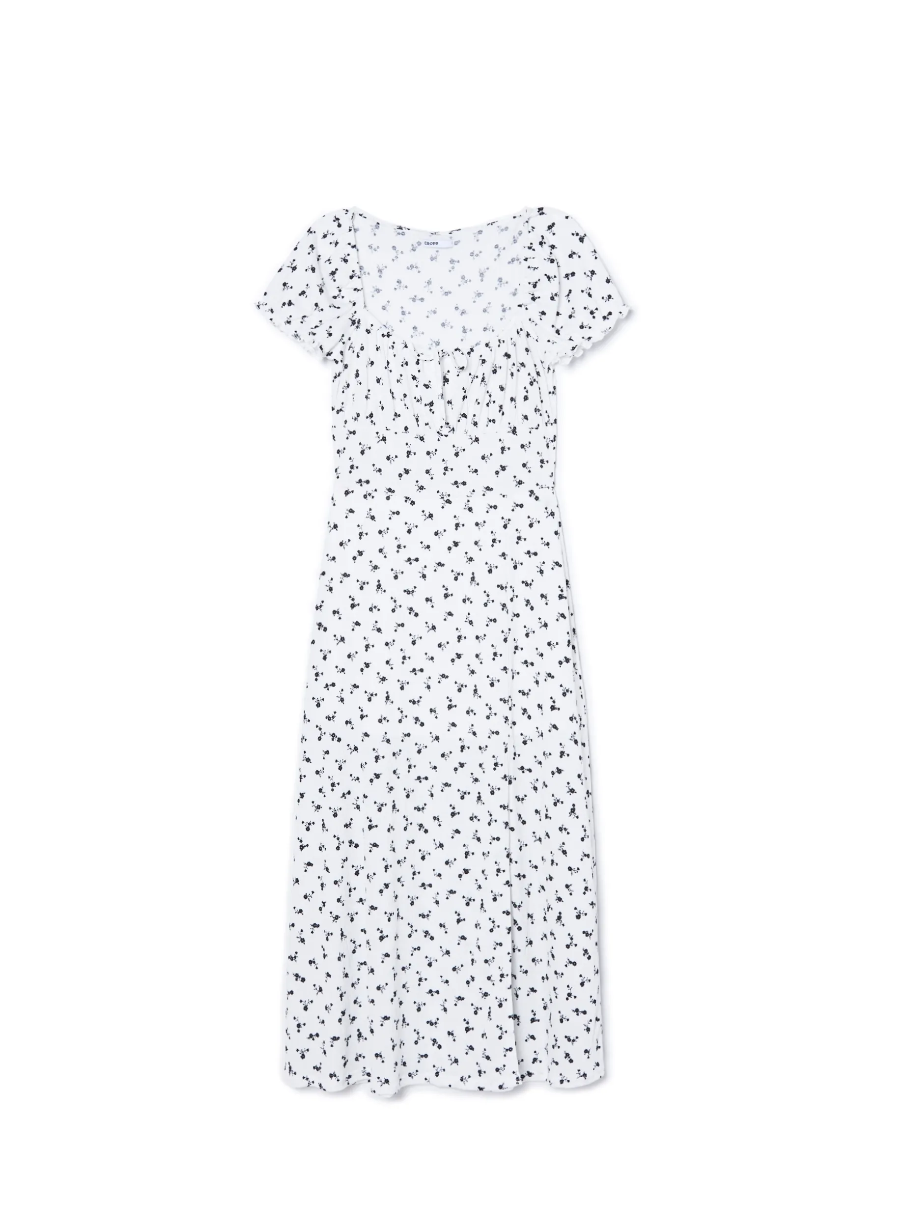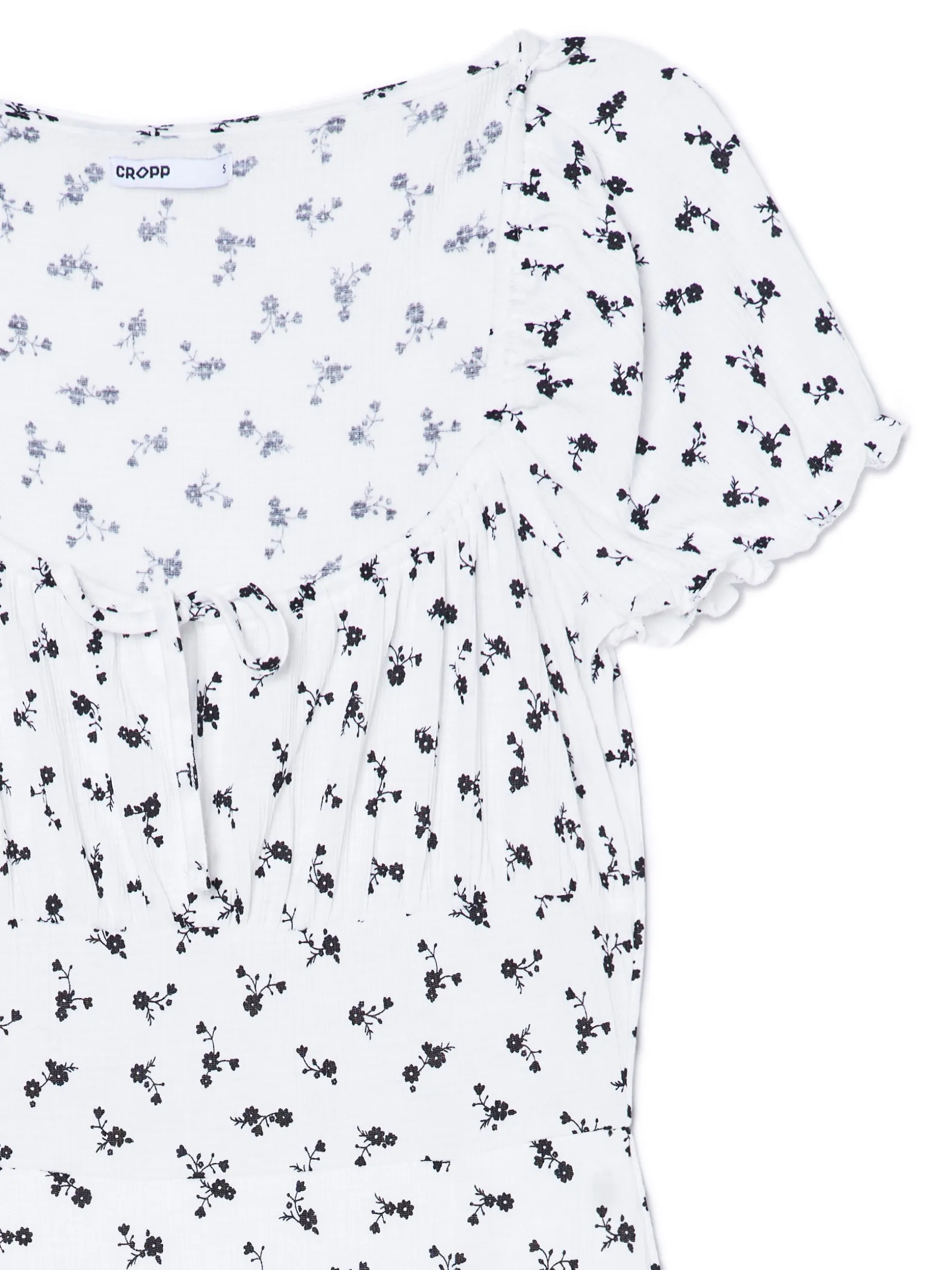 Lekka sukienka, uszyta z wzorzystej dzianiny z kwiatowym motywem. Dostępne inne warianty kolorystyczne. długość midi fason typu empire – odcięcie tuż po biustem krótkie, bufiaste rękawy dekolt z rozcięciem i wiązaniem lekko rozkloszowana spódnica z rozcięciem nadruk w kwiaty na całej powierzchni