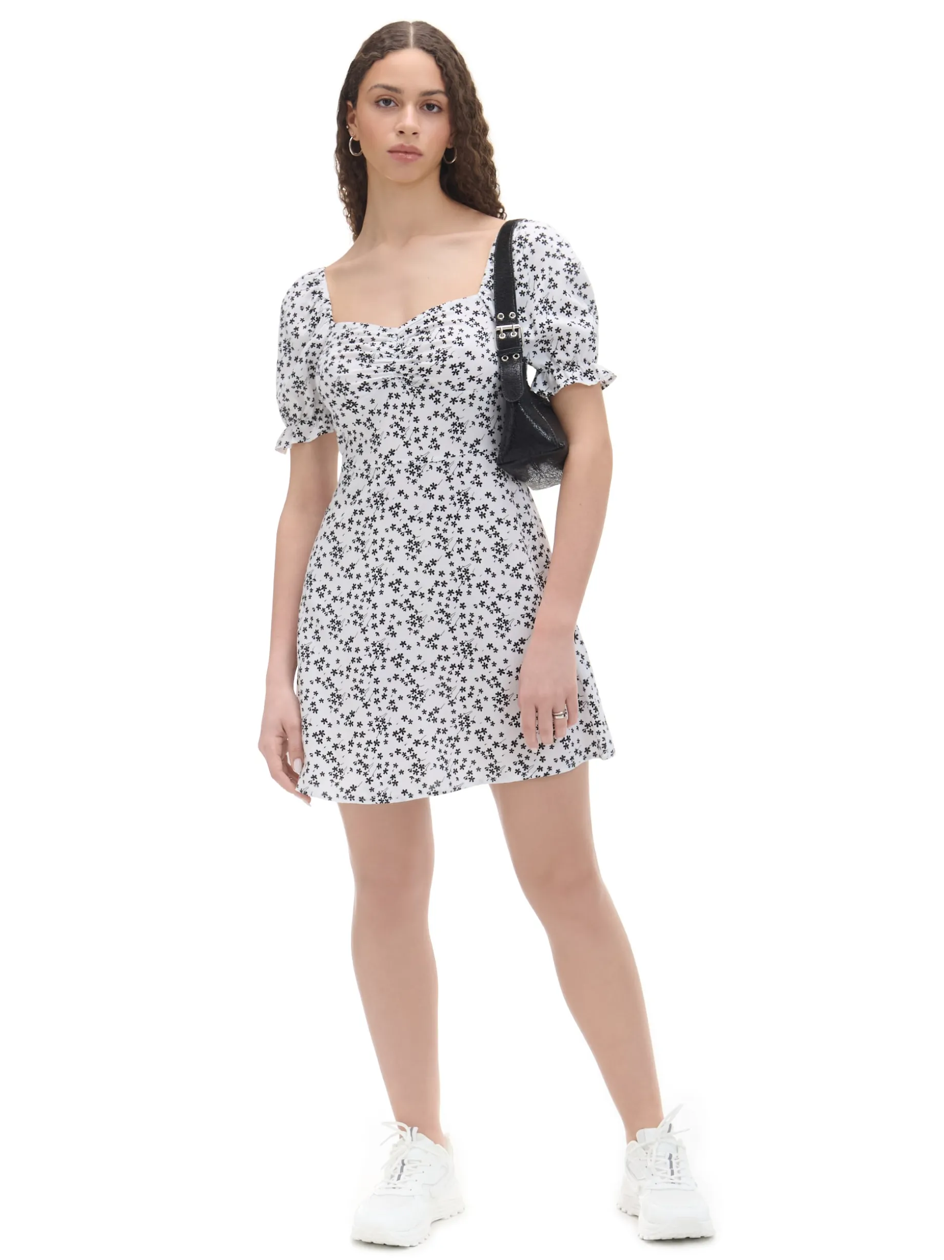 Krótka damska sukienka o swobodnym kroju, uszyta z wiskozy. Dostępna w różnych wersjach kolorystycznych. 100% wiskozy swobodny krój krótkie, bufiaste rękawy dekoracyjne marszczenie pod biustem autorski, kwiatowy print na całości zapięcie na kryty zamek produkt występuje w kilku kolorach Wzrost modelki: 170 cm
