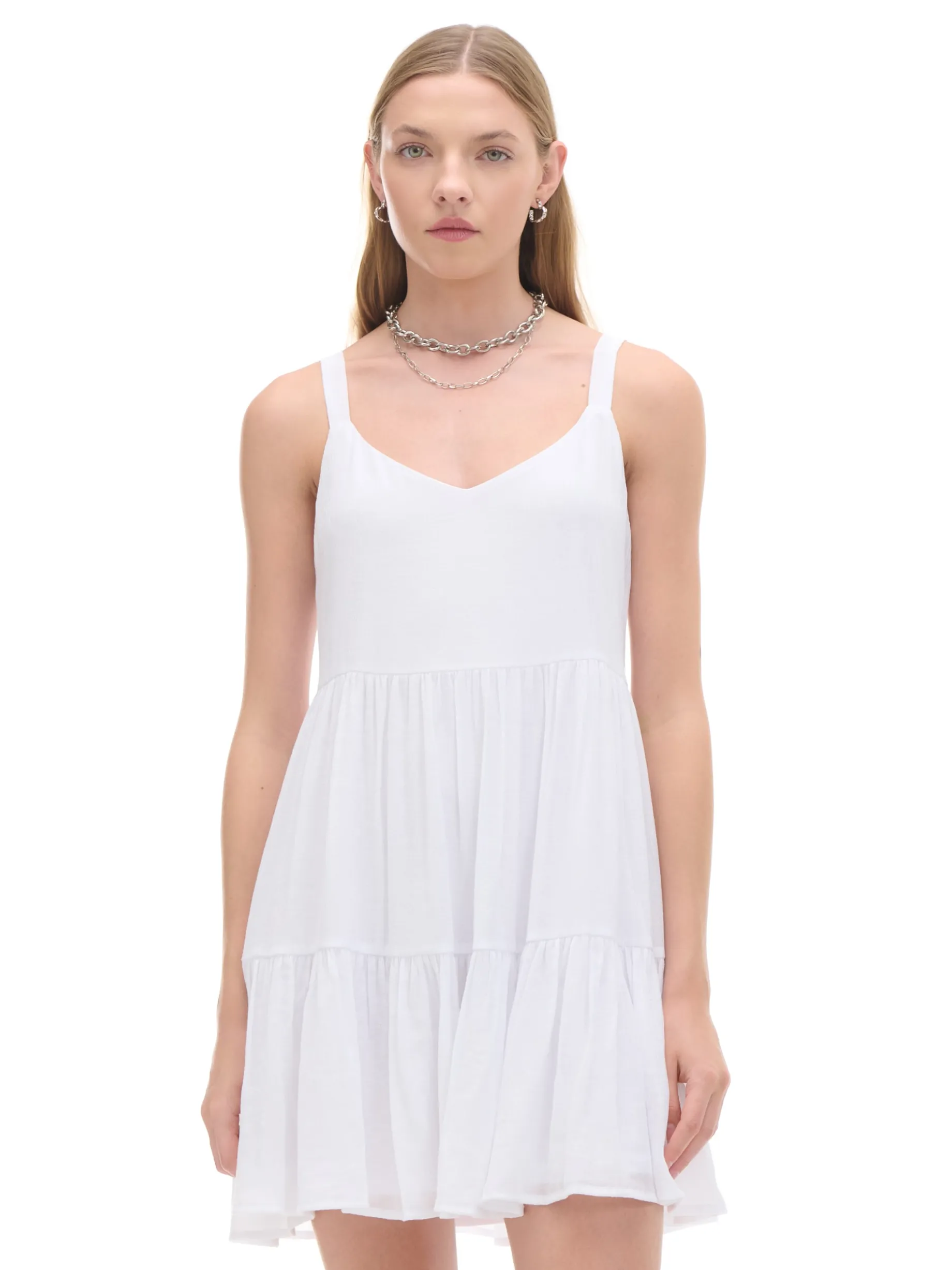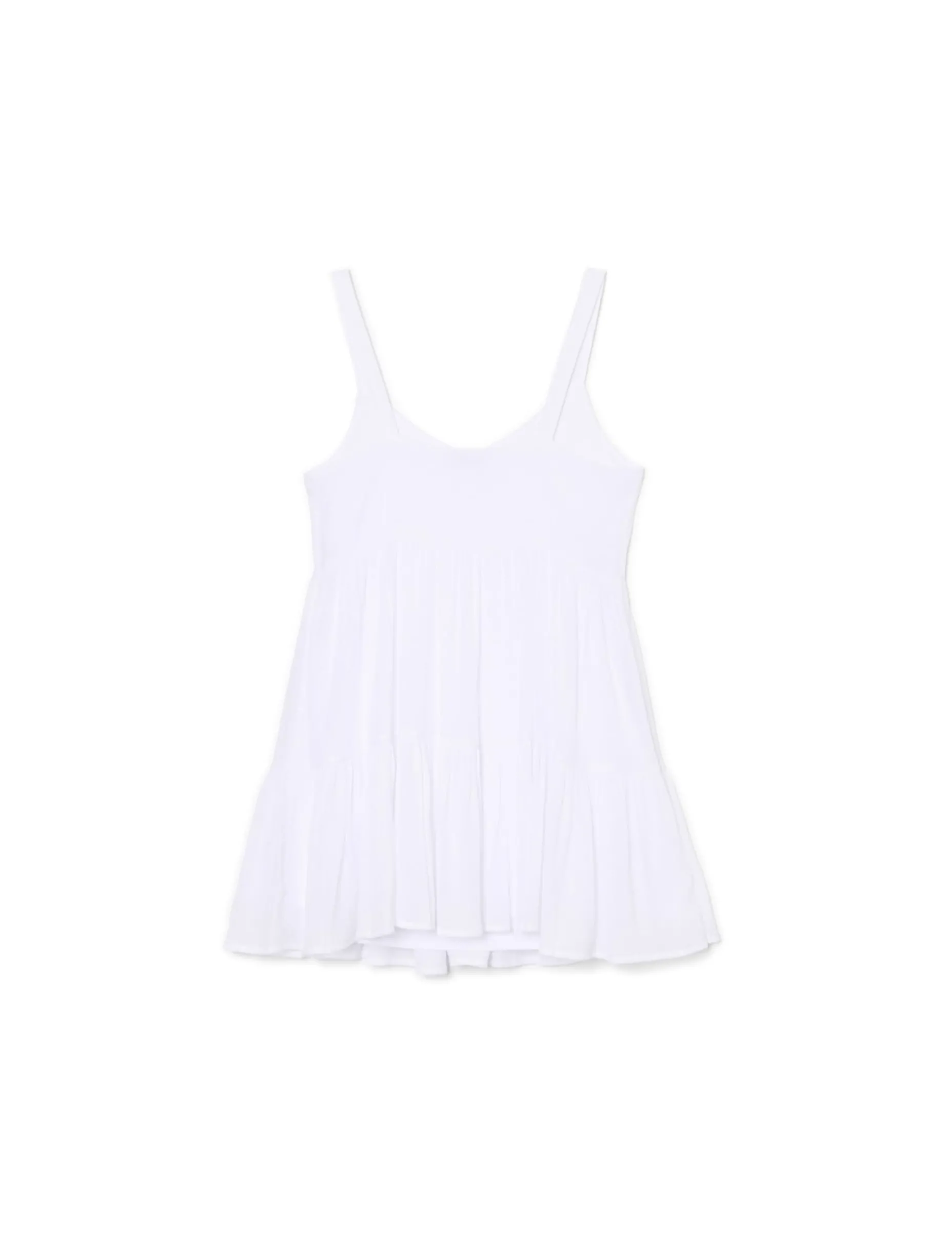 Krótka sukienka, uszyta z lekkiej tkaniny o bardzo wysokiej zawartości wiskozy. Idealna, by poczuć w niej summertime sadness. luźny, letni krój modna długość mini głęboki dekolt w kształcie litery V odcięcie pod biustem z elastyczną gumką cienkie ramiączka spódnica wykończona falbaną