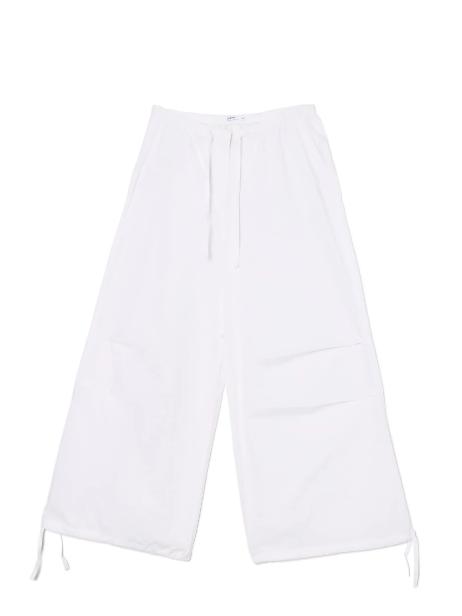 Szerokie damskie spodnie, uszyte w 100% z bawełny. w pasie sznurek do regulacji rozporek i zapięcie szeroka nogawka, zakończona wiązaniem z troczkami cztery kieszenie