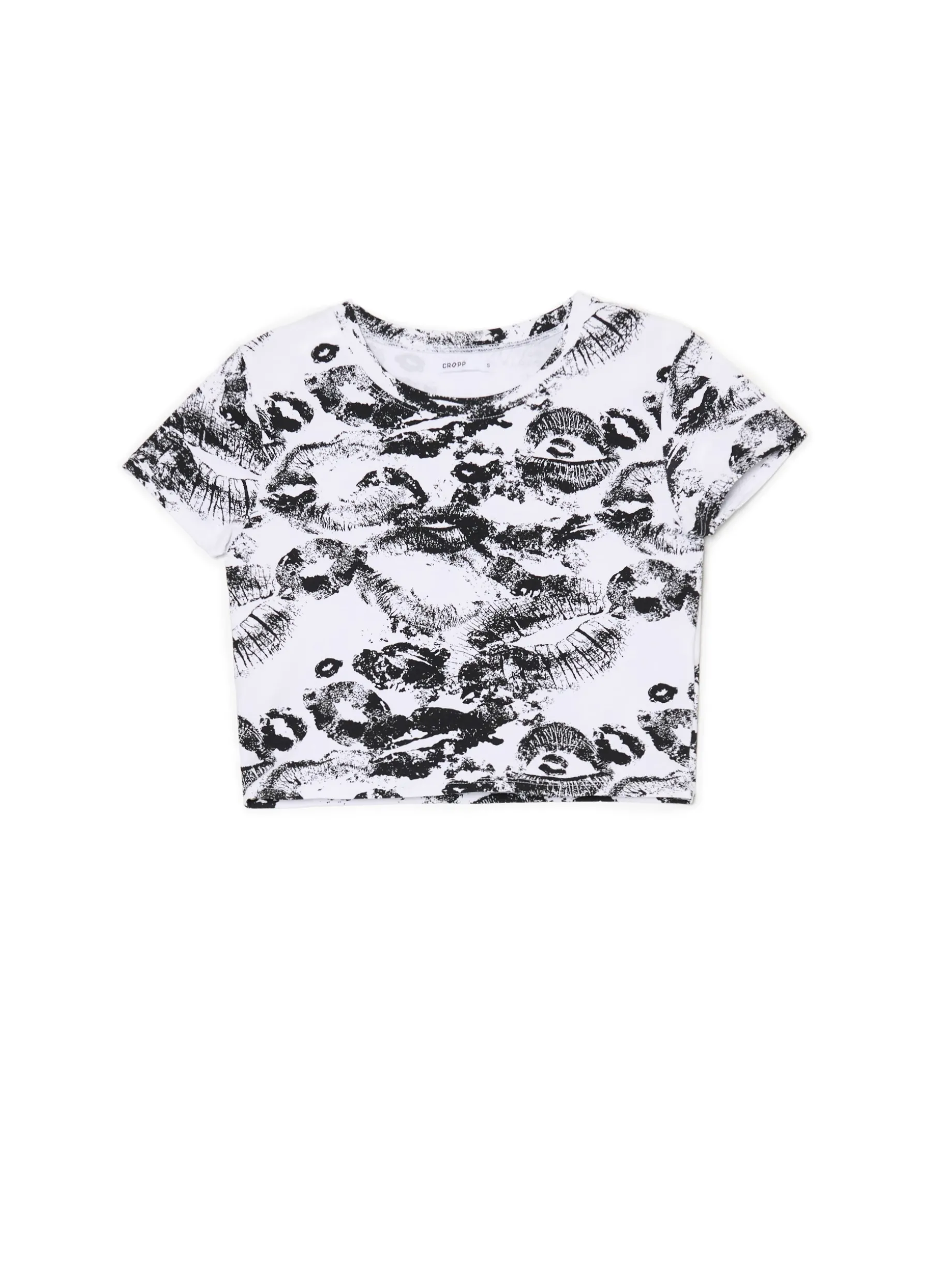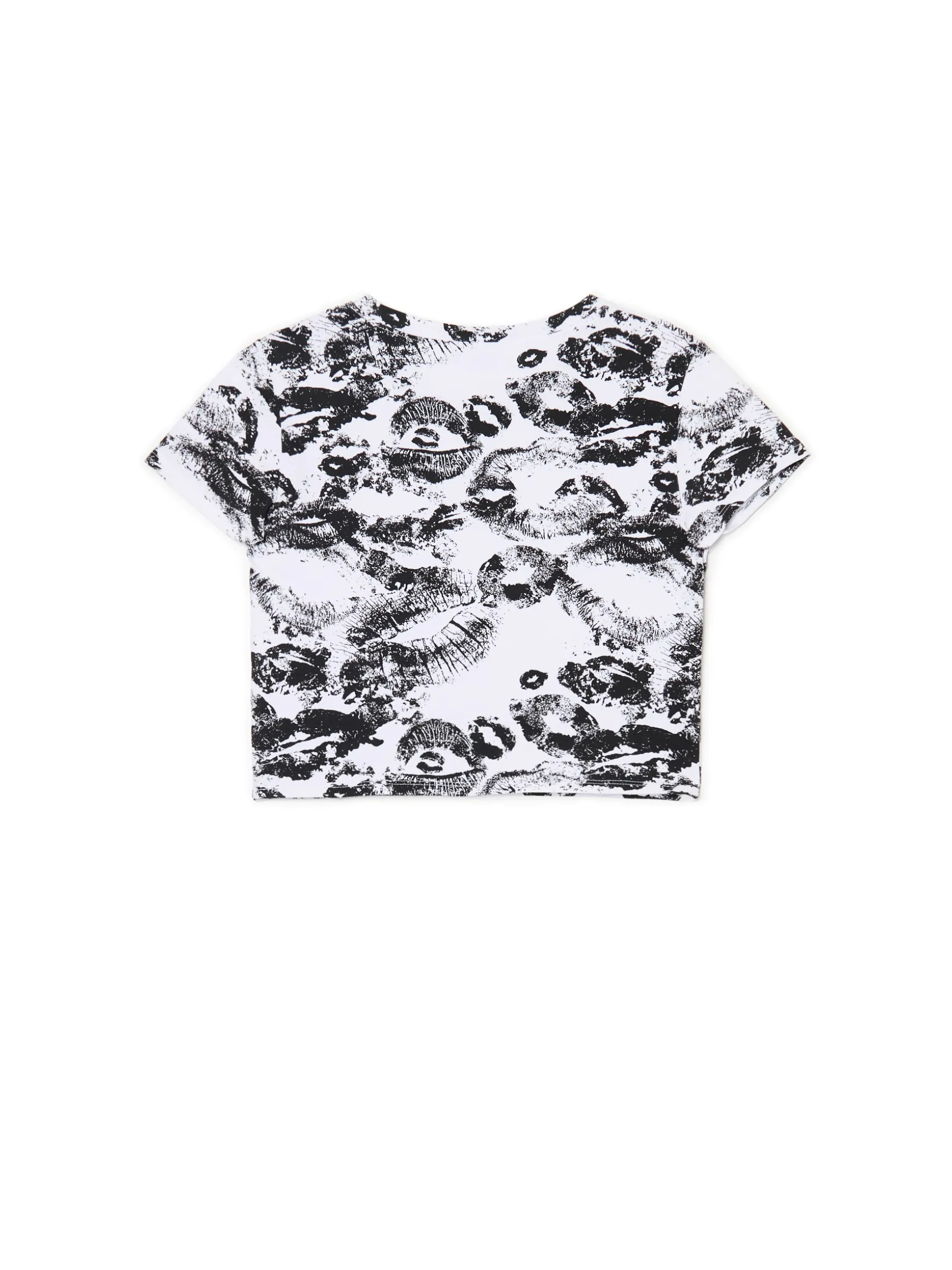Damski T-shirt, uszyty z mieszanki bawełny i elastycznych włókien. dopasowany, krótki krój zabudowany, półokrągły dekolt krótkie rękawy nadruk z motywem ust all over