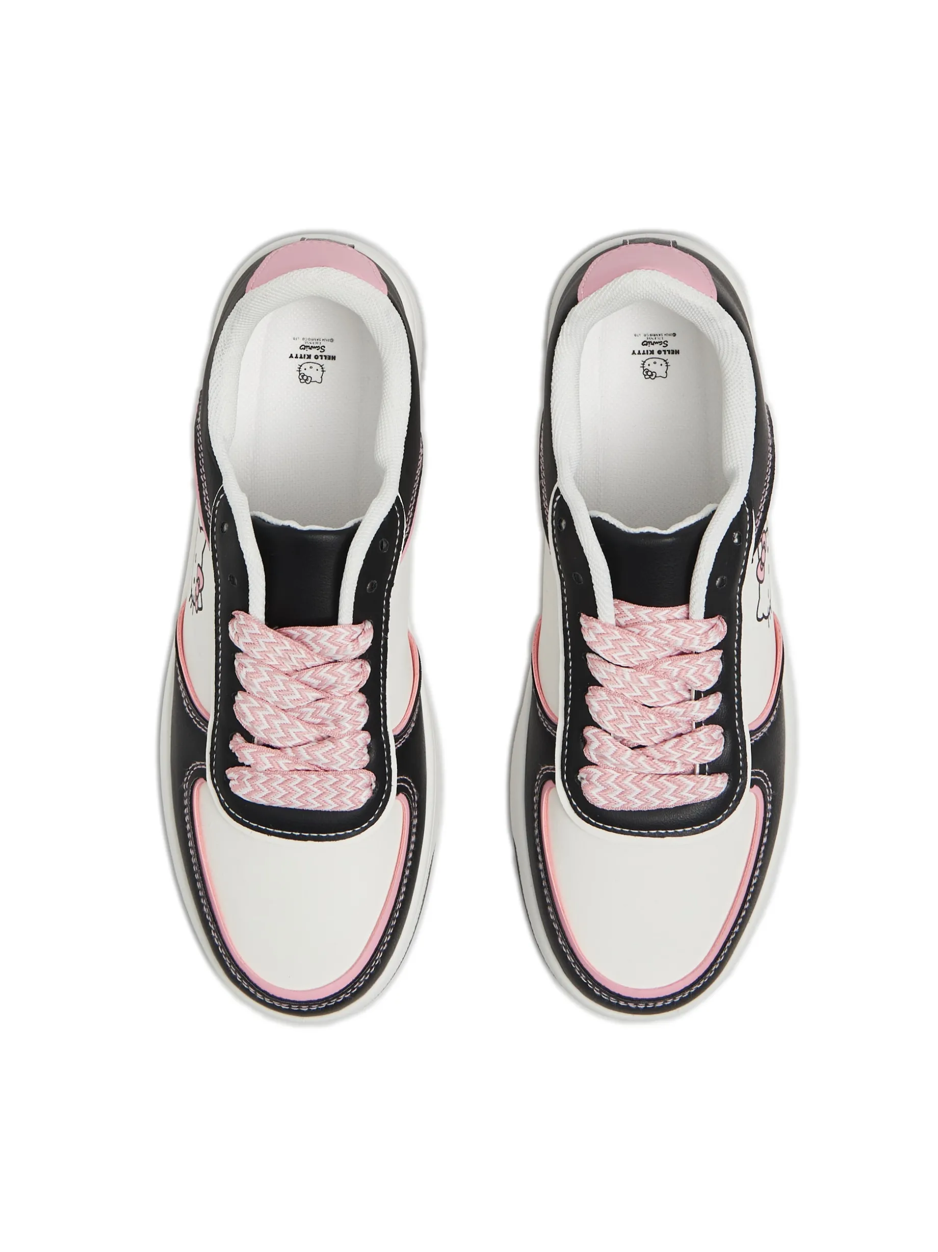 Biało-czarne sneakersy damskie wykonane z imiracji skóry. Gruba podeszwa z łączonych materiałów. Z boku nadruk z podobizną Hello Kitty. © Hello Kitty