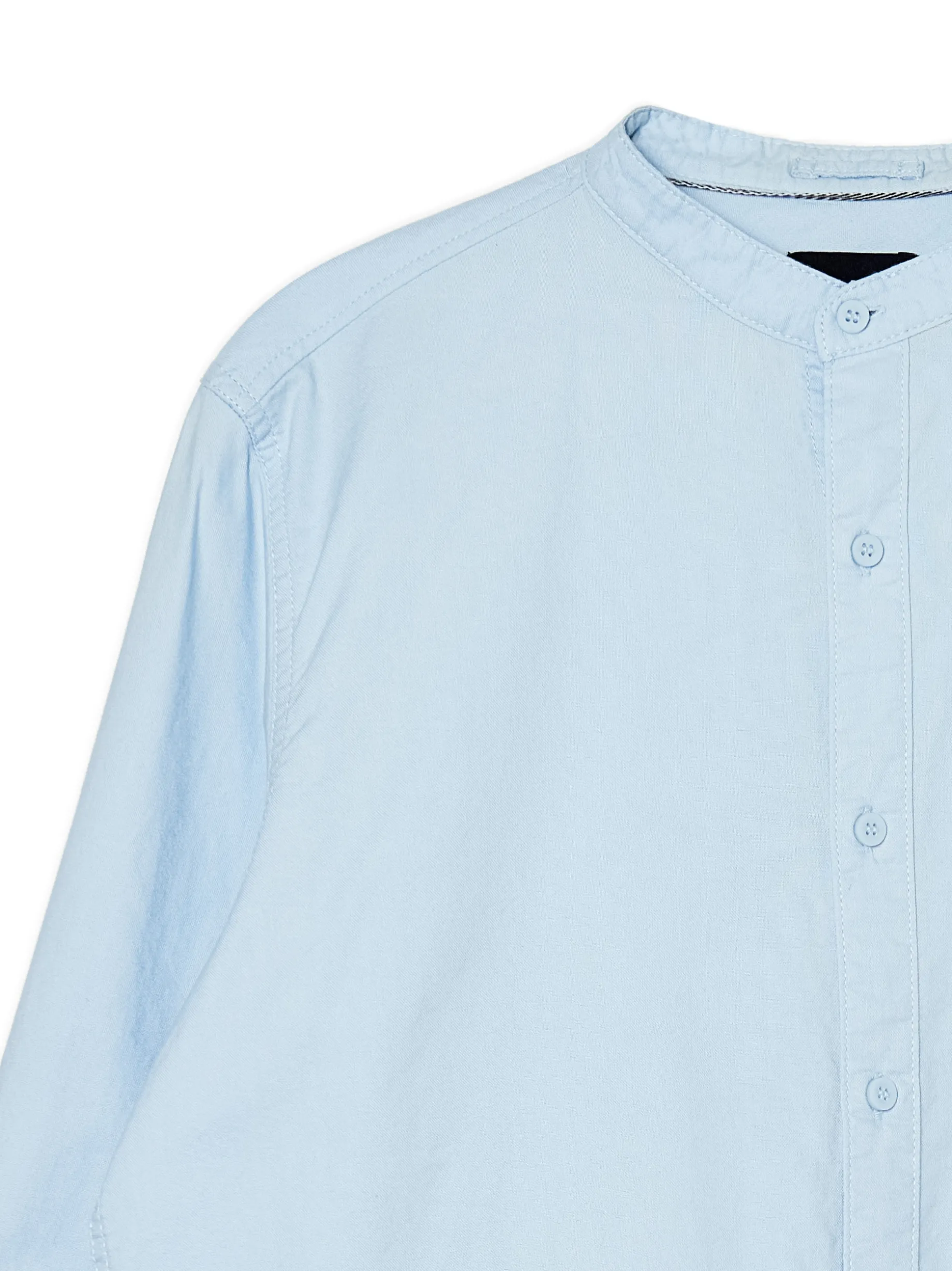 Błękitna męska koszula, uszyta w 100% z bawełny. regularny krój kołnierzyk typu mao zapięcie na guziki długie rękawy z mankietami zapinanymi na dwa guziki