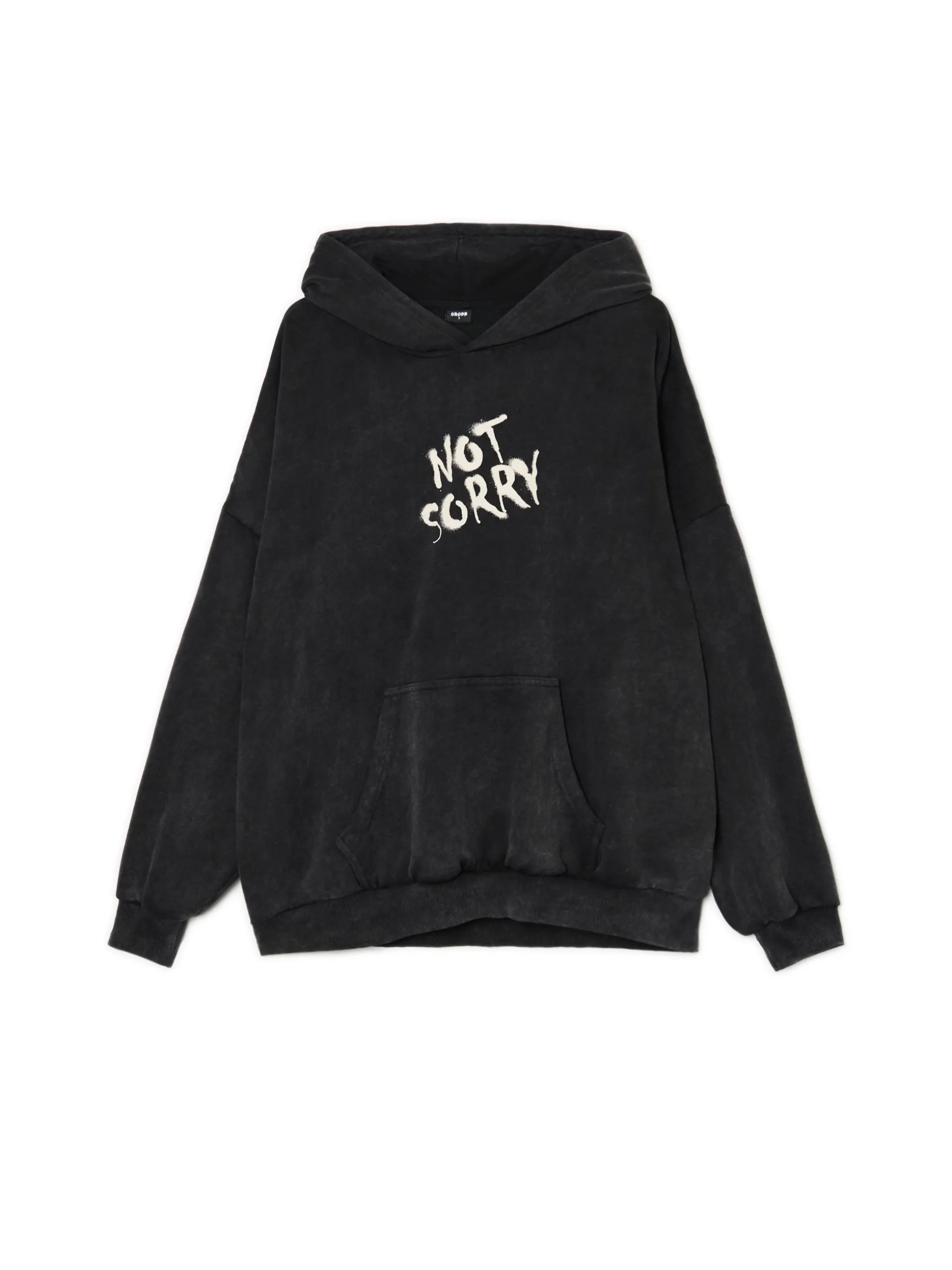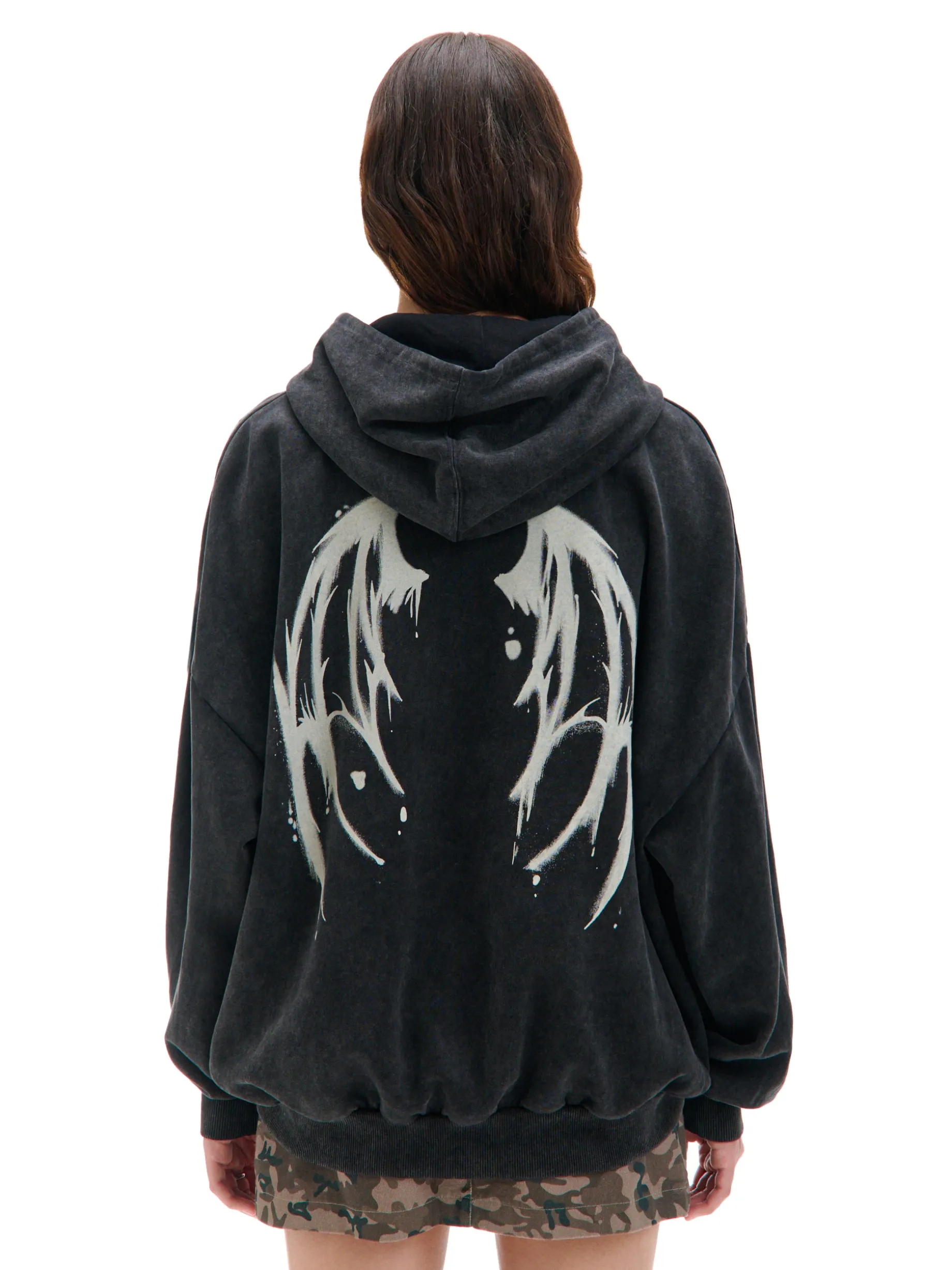 Damska bluza z kapturem uszyta z dzianiny o wysokiej zawartości miękkiej bawełny fleecy w kolorze szarym. Wyróżnikami tego modelu są napis z wielkich liter na przodzie i duży nadruk na plecach w kształcie skrzydeł. dzianinowy materiał z bawełną krój oversize lekkie ocieplenie miękki kaptur długie, swobodne rękawy lekko obniżona linia ramion dół i rękawy wykończone prążkowanym ściągaczem kieszeń kangurka na przodzie ozdobny nadruk tekstowy na piersi duży nadruk na plecach efekt sprania na całości Ten produkt należy do kolekcji UNISEX – zalecamy wybranie mniejszego rozmiaru niż zazwyczaj, jeśli chcesz uniknąć efektu oversize.