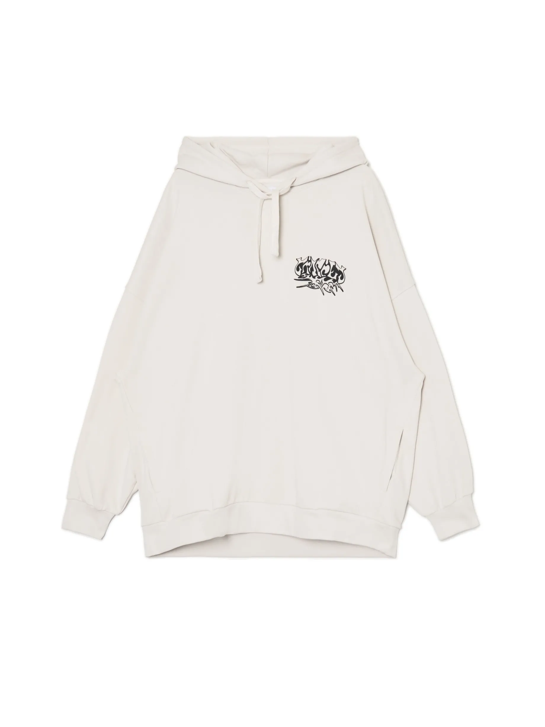 Damska bluza uszyta z dzianiny o wysokiej zawartości bawełny w kroju oversize. Jasnoszary kolor materiału i kontrastowy print będą fitowały z wieloma dodatkami! dzianinowy materiał z bawełną krój oversize długie rękawy z obniżoną linią ramion dół i rękawy wykończone ściągaczem dwie kieszenie z przodu szeroki kaptur z regulacją obwodu Wzrost modelki: 172 cm