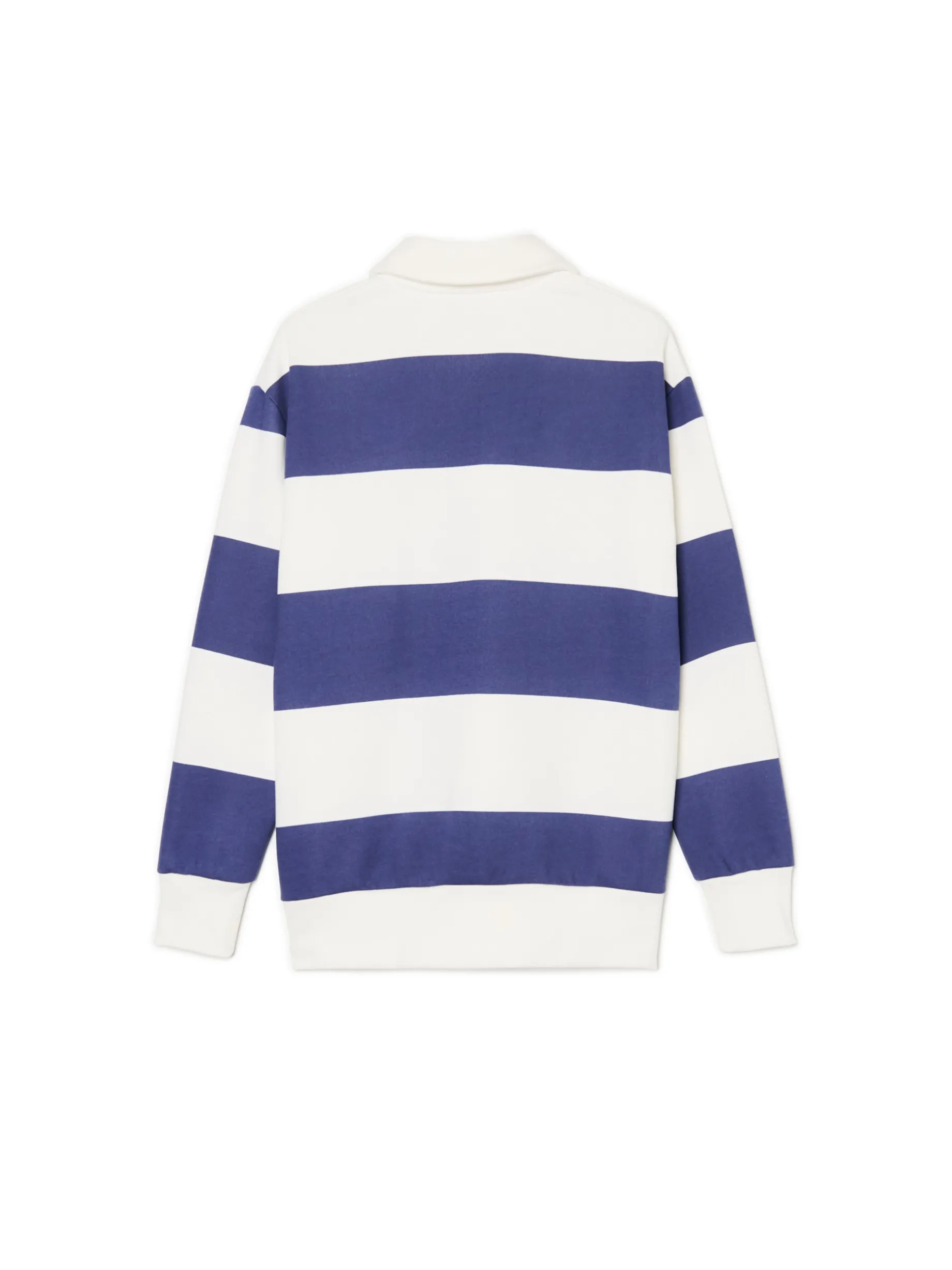 Damska bluza w wyjątkowym fasonie koszuli polo z klasycznym kołnierzykiem, uszyta z mieszanki dzianin z miękkim meszkiem. Na przodzie aplikacja w collegowym stylu. Klasyczny look w nowoczesnym designie, sprawdź! bluza o regularnym kroju uszyta z miękkiej dzianiny z bawełną góra zapinana na guziki klasyczny kołnierzyk długie rękawy z obniżoną linią ramion dół i rękawy wykończone ściągaczem wzór w paski na całości z przodu aplikacja Wzrost modelki: 177 cm