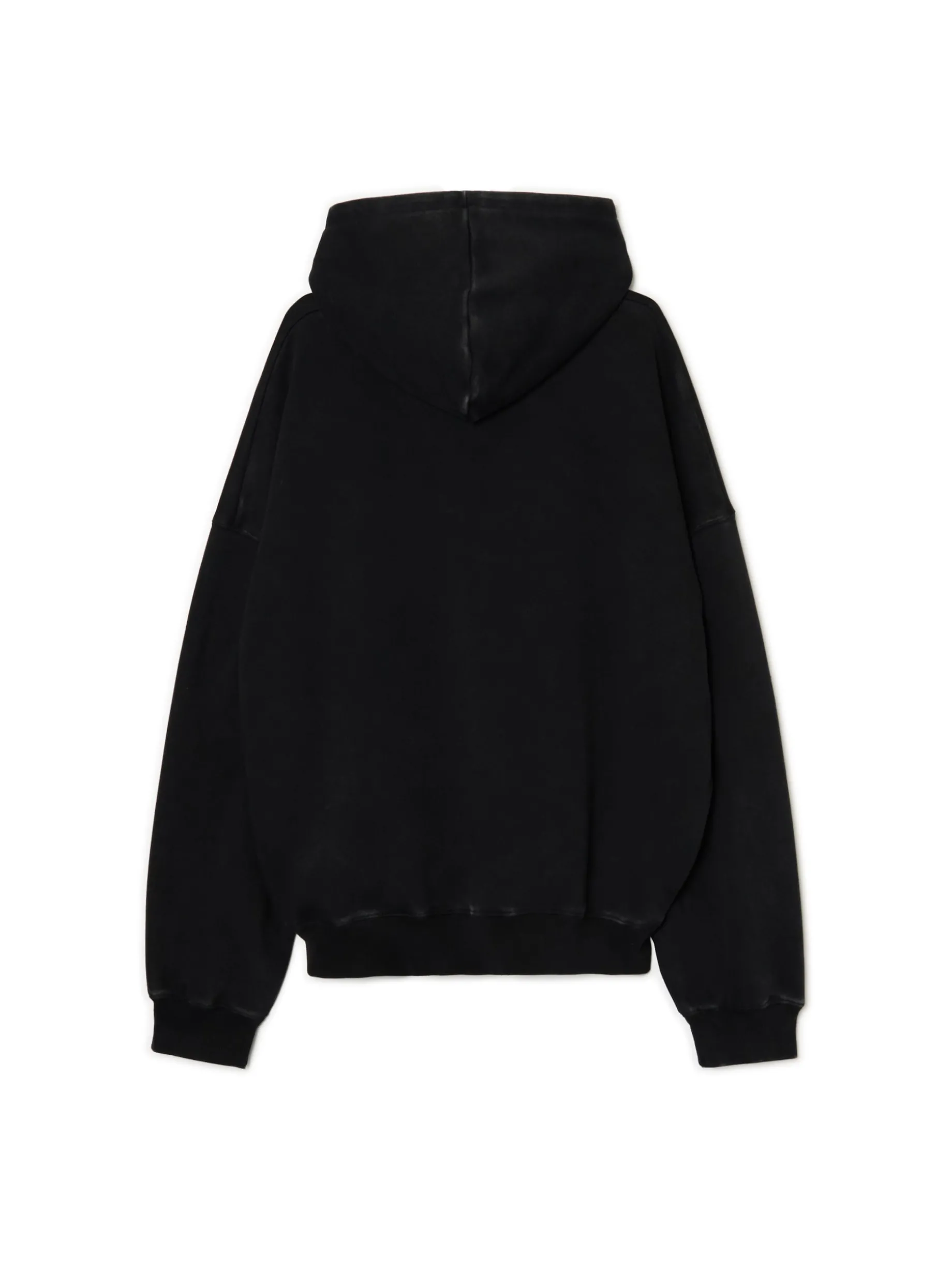 Jeśli szukasz casualowego outfitu na halloweenowy event, to mamy dla Ciebie tę czarną bluzę typu hoodie. Na całości nieregularny efekt odbarwienia i nadruk jak z horroru. Trick or treat? uszyta z miękkiej dzianiny z bawełną obszerny krój boxy szeroki kaptur dół i rękawy wykończone prążkowanym ściągaczem kieszeń kangurka na przodzie delikatny efekt sprania nadruk z motywem Halloween