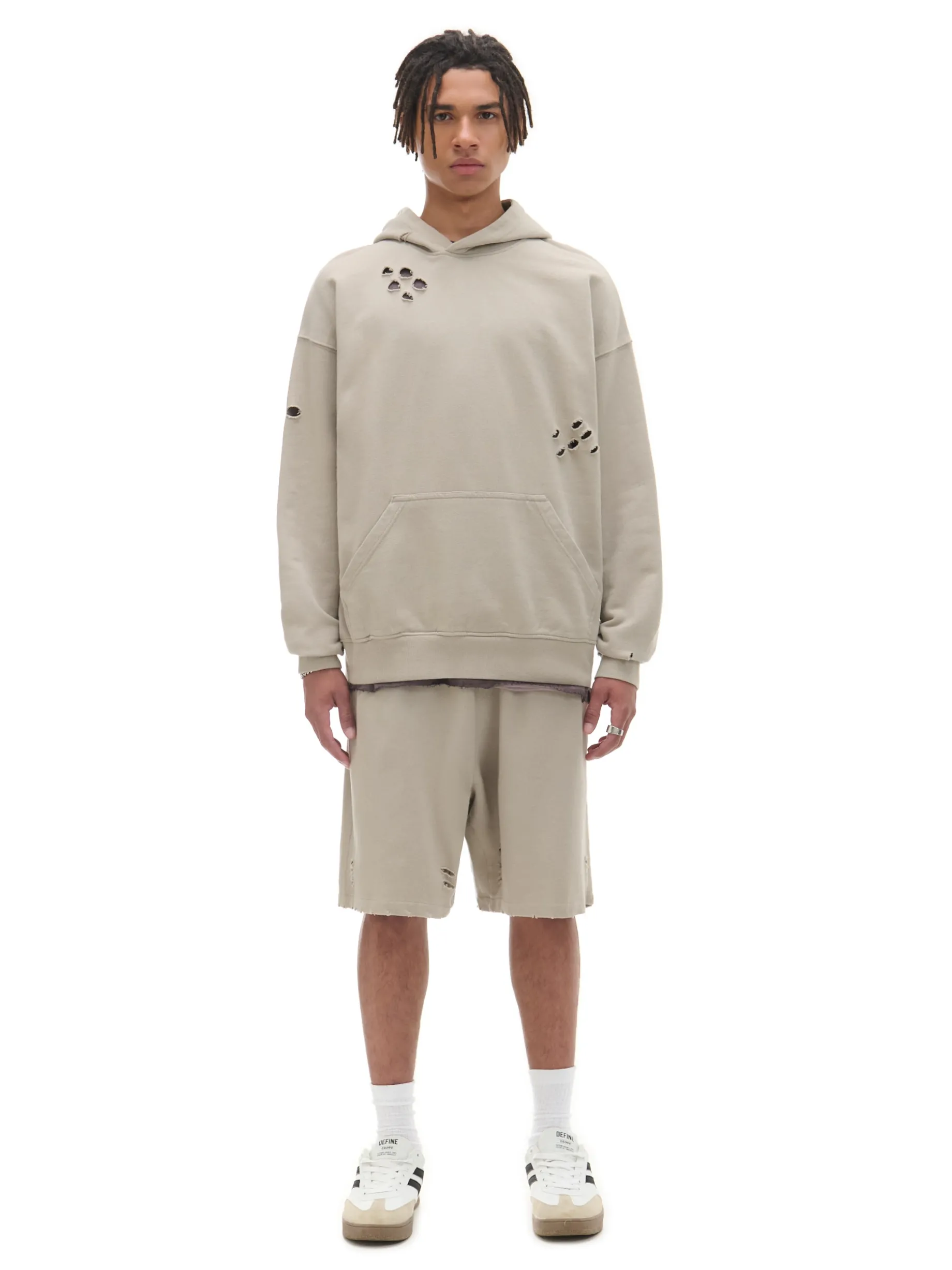 Męska beżowa bluza z kapturem typu hoodie. Dziury i poszarpane krawędzie przy mankietach od rękawów nadają jej charakteru. Look & vibe! 100% oddychającej bawełny swobodny krój loose duża kieszeń typu kangur ściągacze na biodrach i mankietach poszarpane krawędzie przy mankietach asymetryczne dziury na materiale