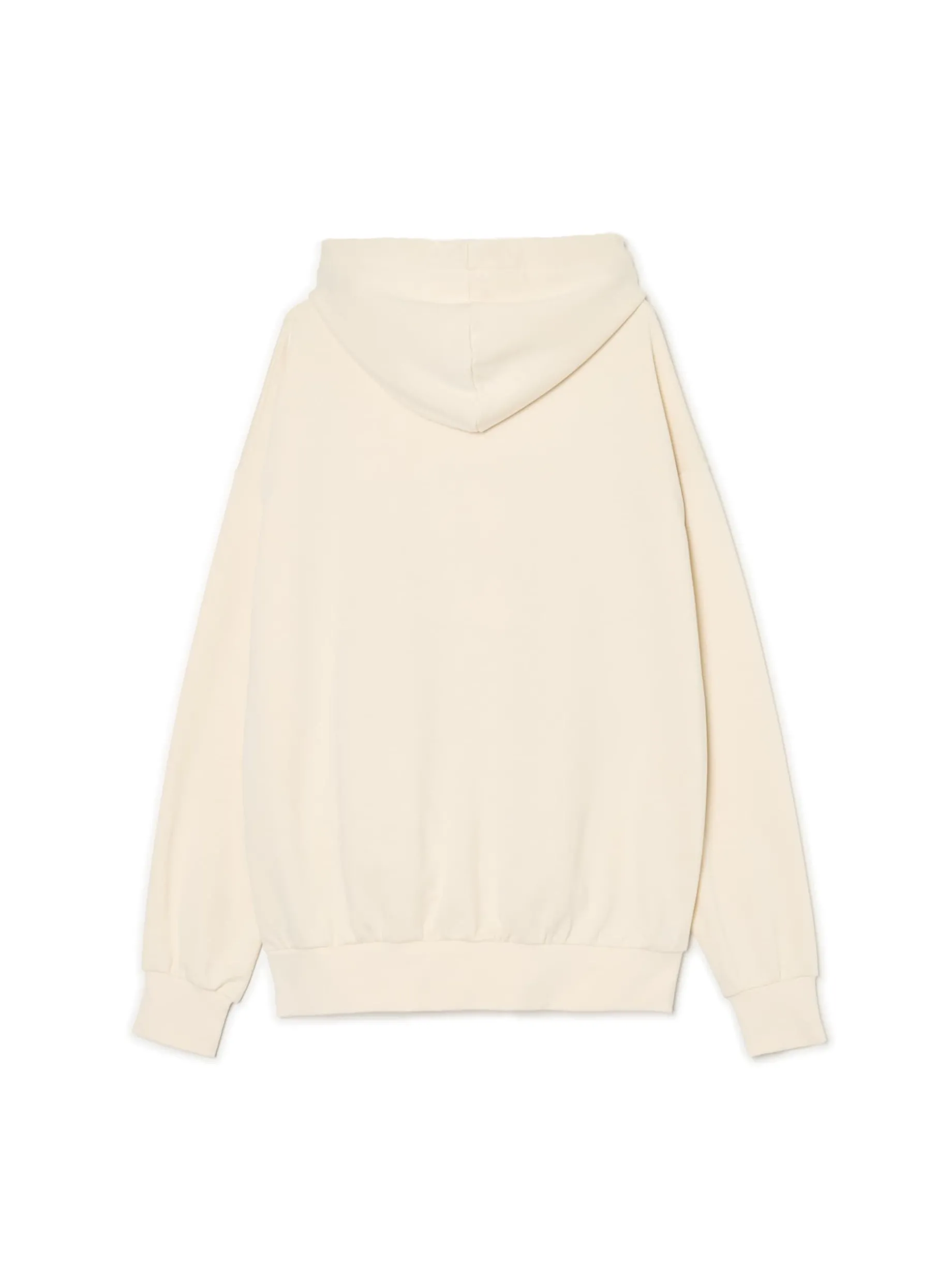 Kremowa męska bluza typu hoodie uszyta z mieszanki dzianin. Praktyczne kieszenie, duży kaptur i nadruk z owocowym motywem na przodzie. uszyta z miękkiej dzianiny z bawełną luźny krój z obniżoną linią ramion miękki kaptur dwie kieszenie boczne nadruk z motywem wiśni Wzrost modela: 185 cm
