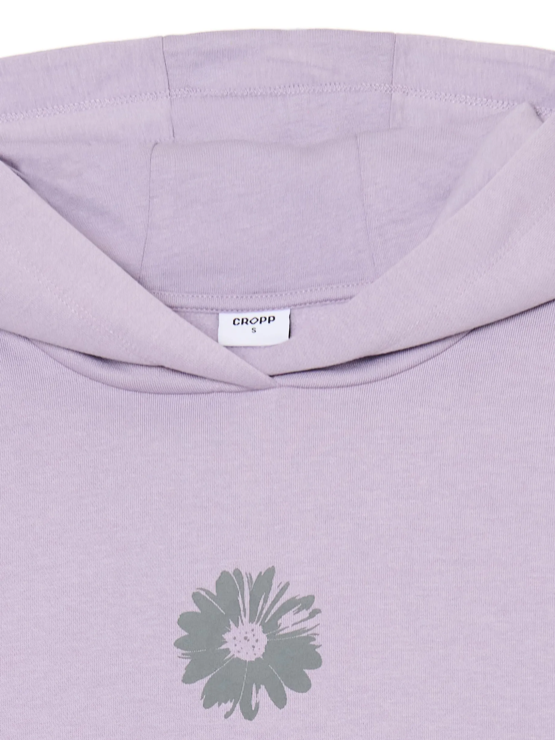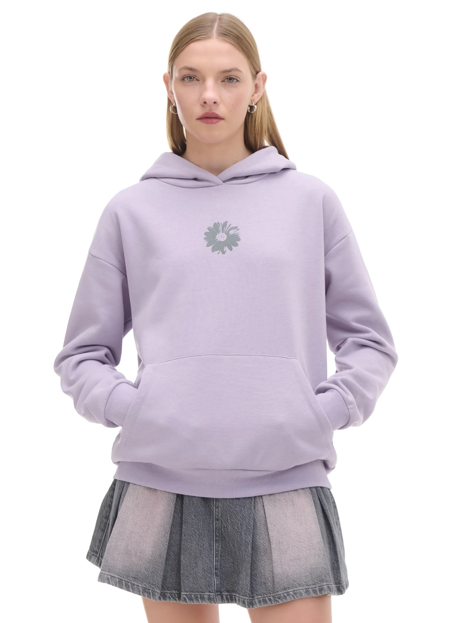 Ciepła damska bluza z kapturem uszyta z trwałej mieszanki dzianin w liliowym kolorze. Item, który otuli Cię w chłodne wieczory. uszyta z miękkiej dzianiny z bawełną regularny krój obszerny kaptur długie rękawy z obniżoną linią ramion z przodu duża kieszeń typu kangurka dół i rękawy wykończone prążkowanym ściągaczem niewielki nadruk z przodu