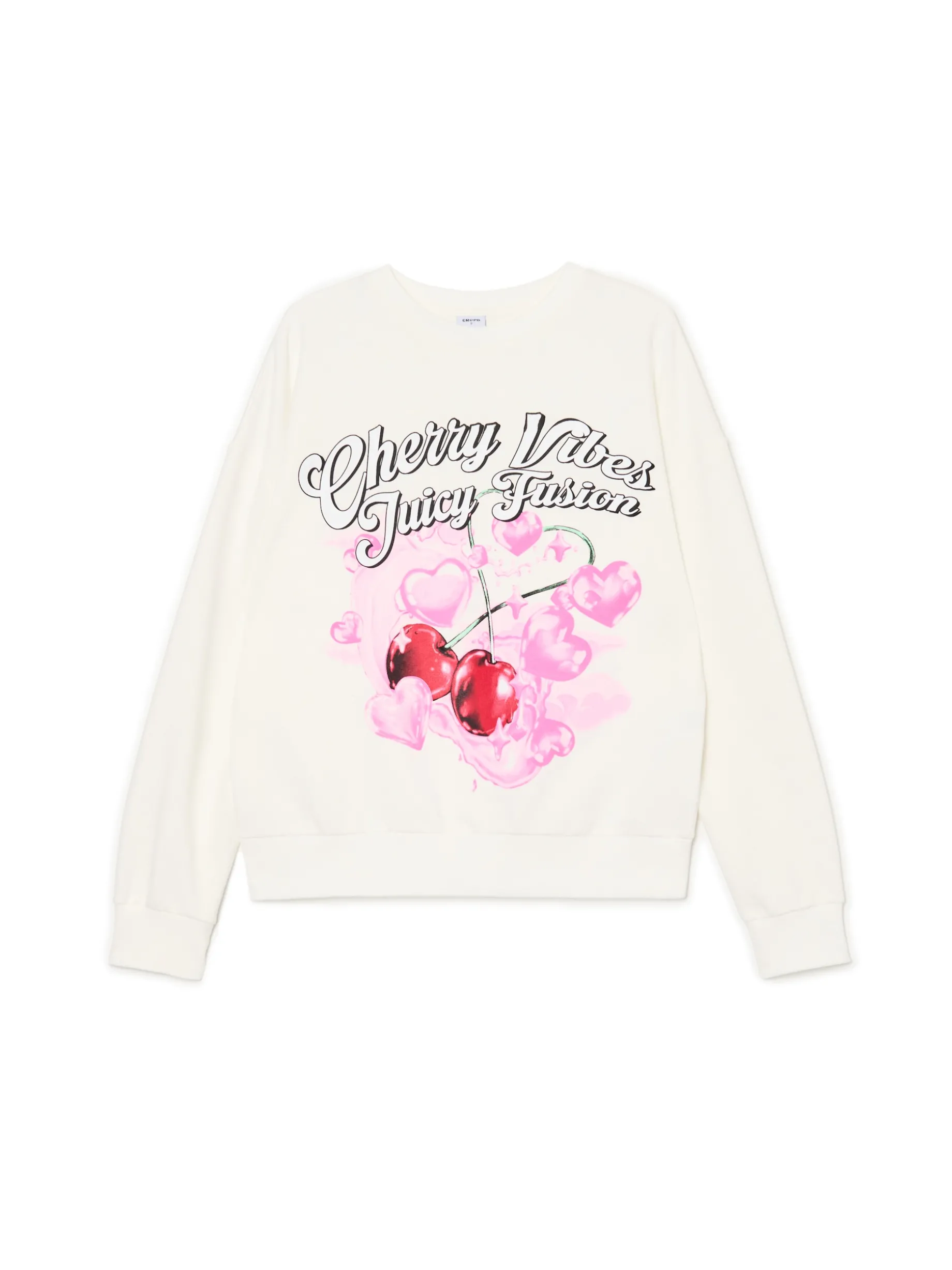 Damska bluza z długim rękawem uszyta z materiału o dużej zawartości bawełny. Na przodzie nadruk z motywem wiśni i serc w intensywnej kolorystyce. Wyróżnij się w tłumie! dzianinowy materiał z bawełną swobodny krój długie rękawy wykończone ściągaczami półokrągły dekolt z lamówką oryginalny print
