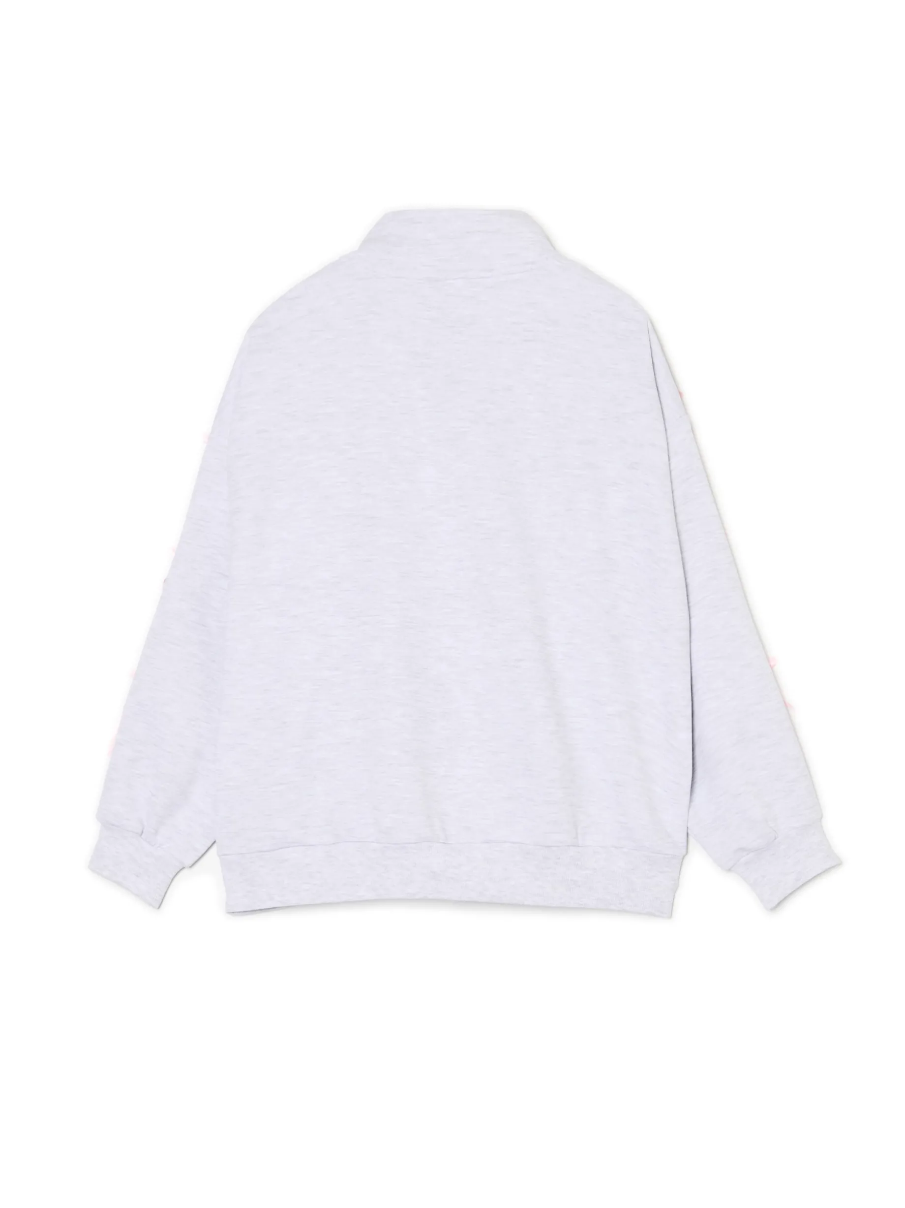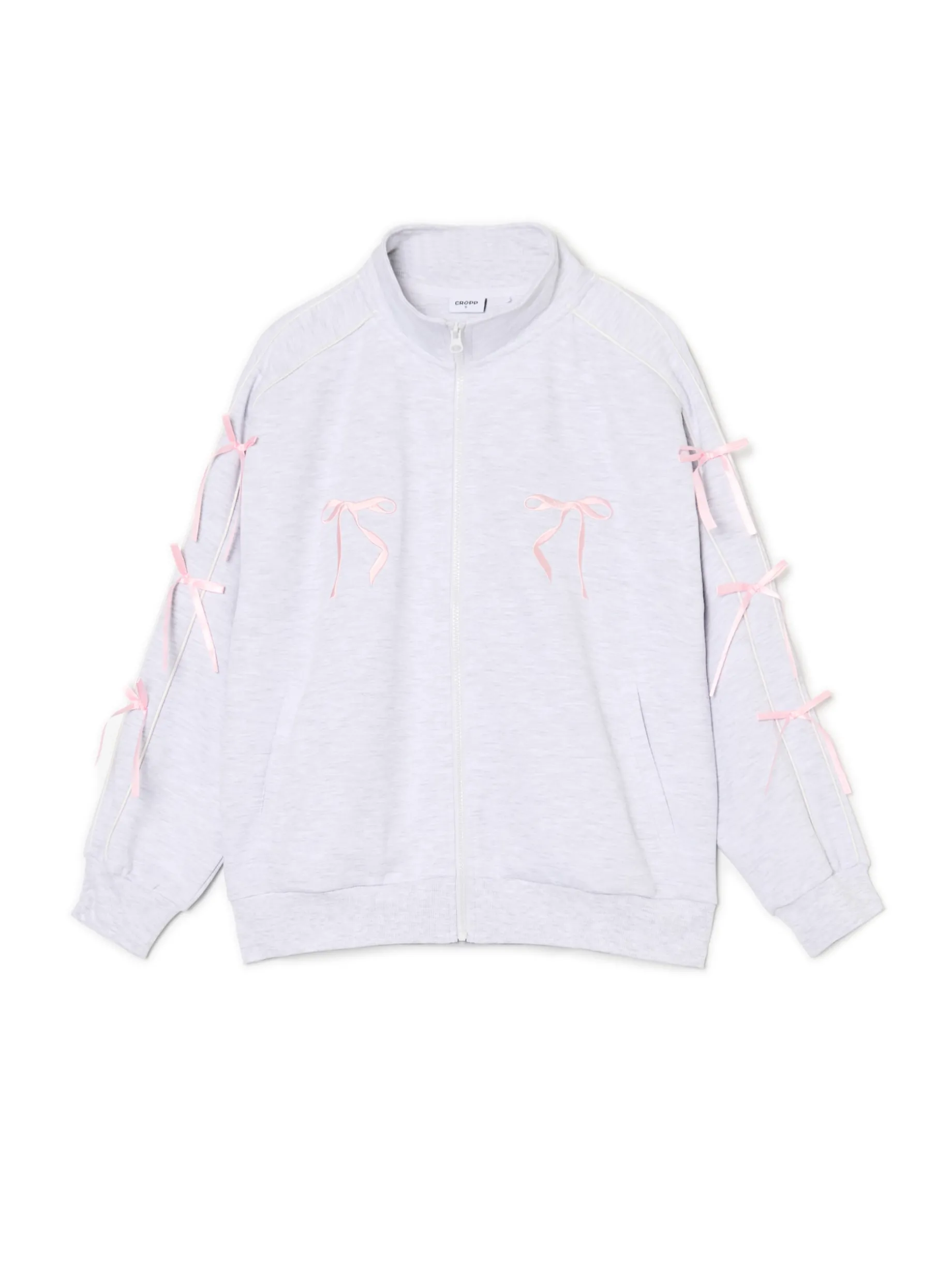Rozpinana damska bluza ze stójką uszyta z mieszanki dzianin w jasnoszarym odcieniu. Dekoracyjne lamówki i kokardki nadają jej uroczego charakteru. Łap dla siebie albo dla Bestie!