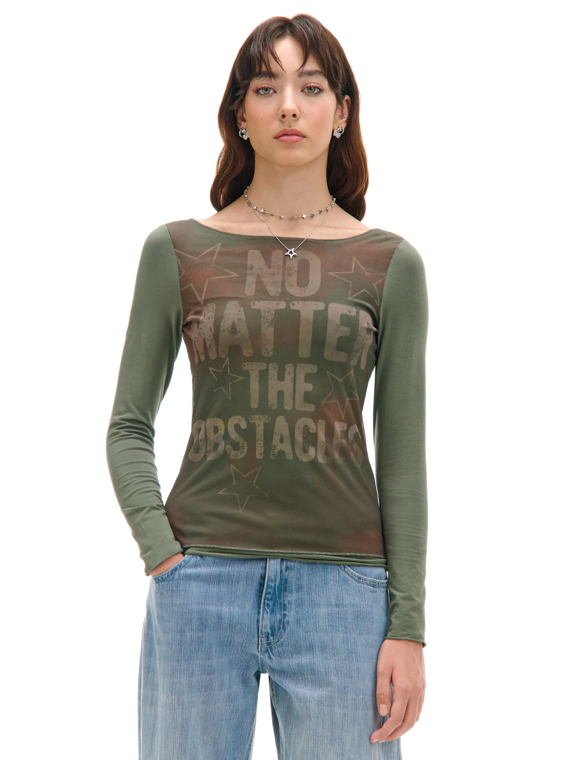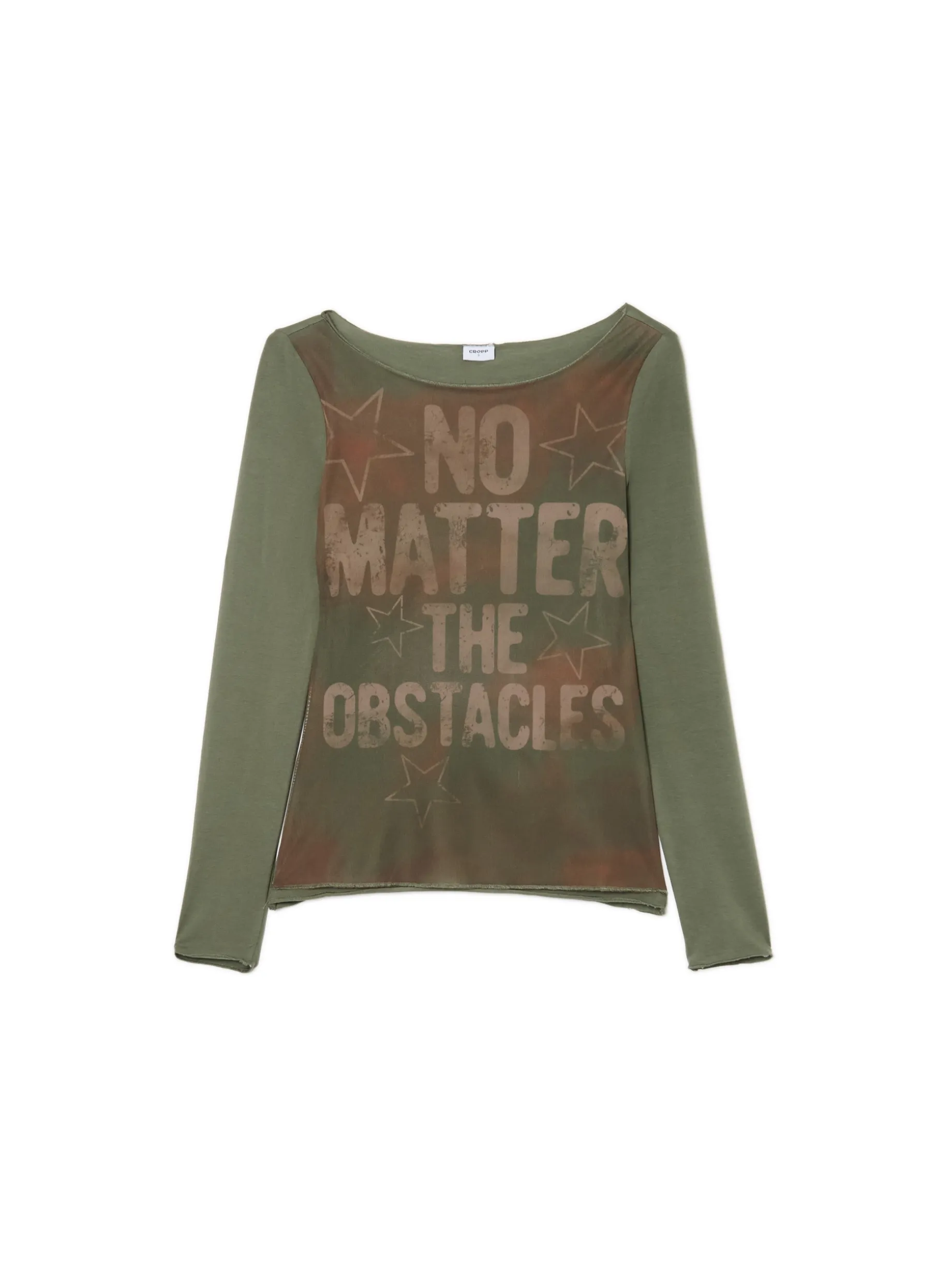 Bluzka damska typu longsleeve o dopasowanym kroju, uszyta z elastycznej mieszanki dzianin. Ozdobą tego modelu są rękawy w innym odcieniu i duży nadruk z przodu stylizowany na dziki zachód. bawełna z dodatkiem elastycznych włókien dopasowany krój długie, proste rękawy dekolt w łódkę surowe wykończenie brzegów duży nadruk z przodu
