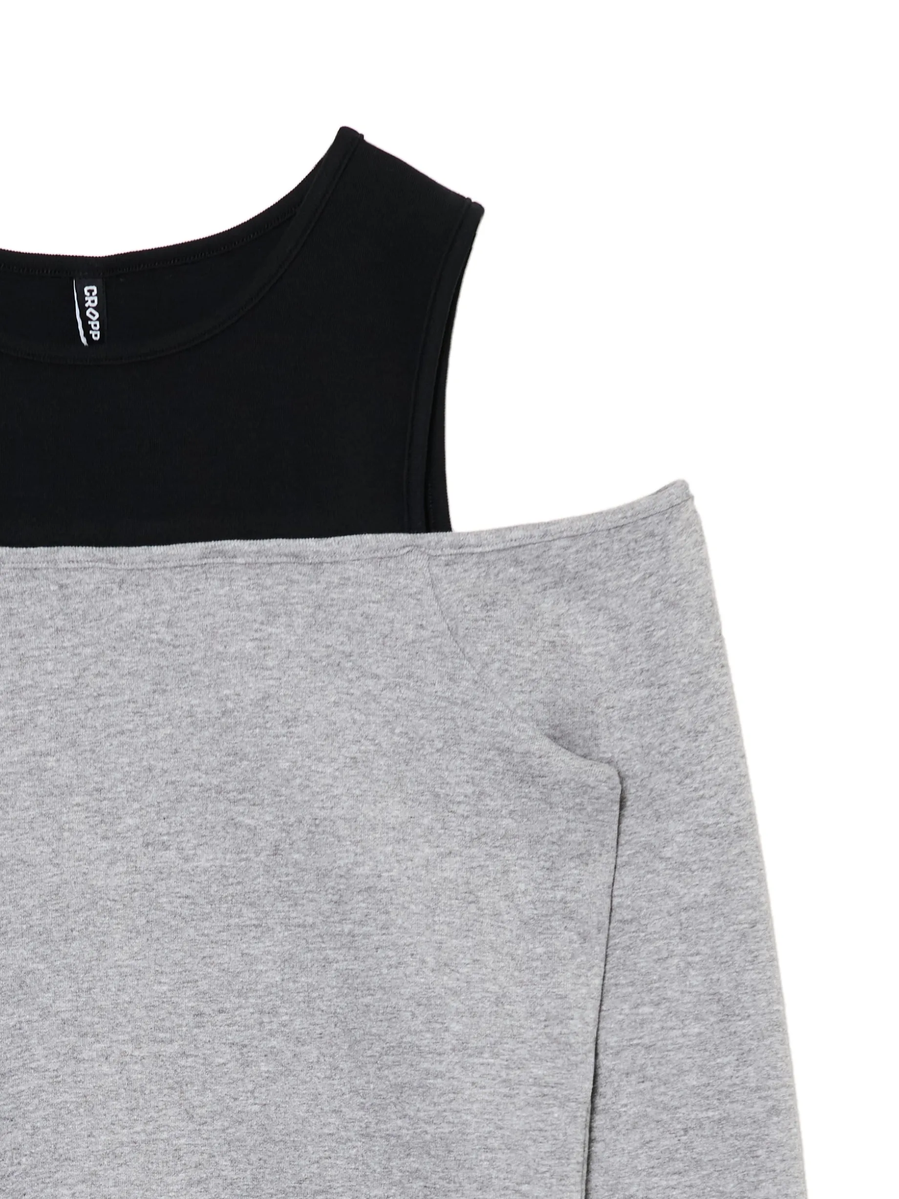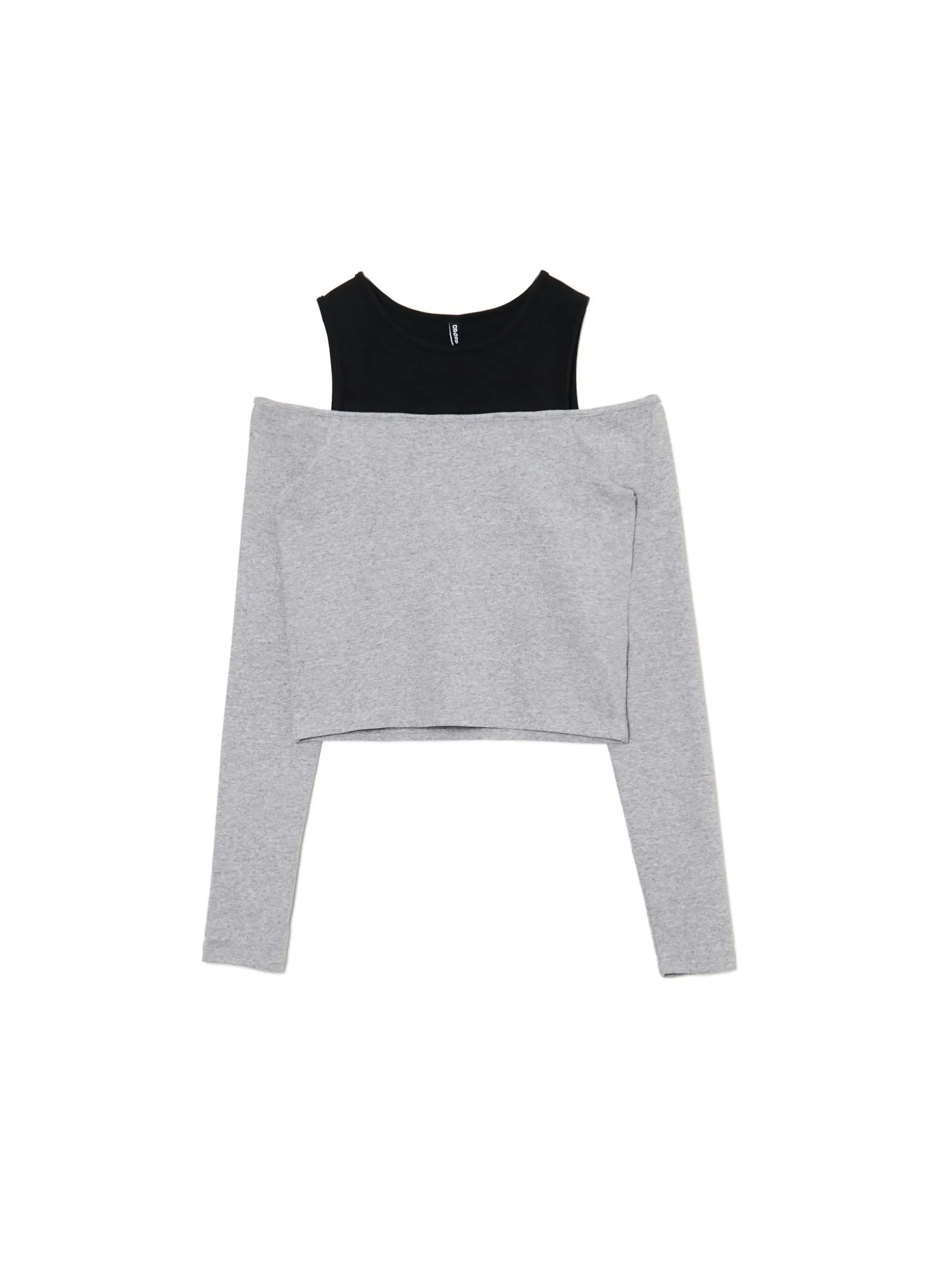 Szara bluzka z wszytym wewnątrz topem w czarnym kolorze. Ponadczasowy fason w stylu Y2K! bawełna z dodatkiem elastycznych włókien dopasowany krój podkreślający sylwetkę okrągły dekolt długie, dopasowane rękawy opadające ramiona gładkie wykończenie brzegów
