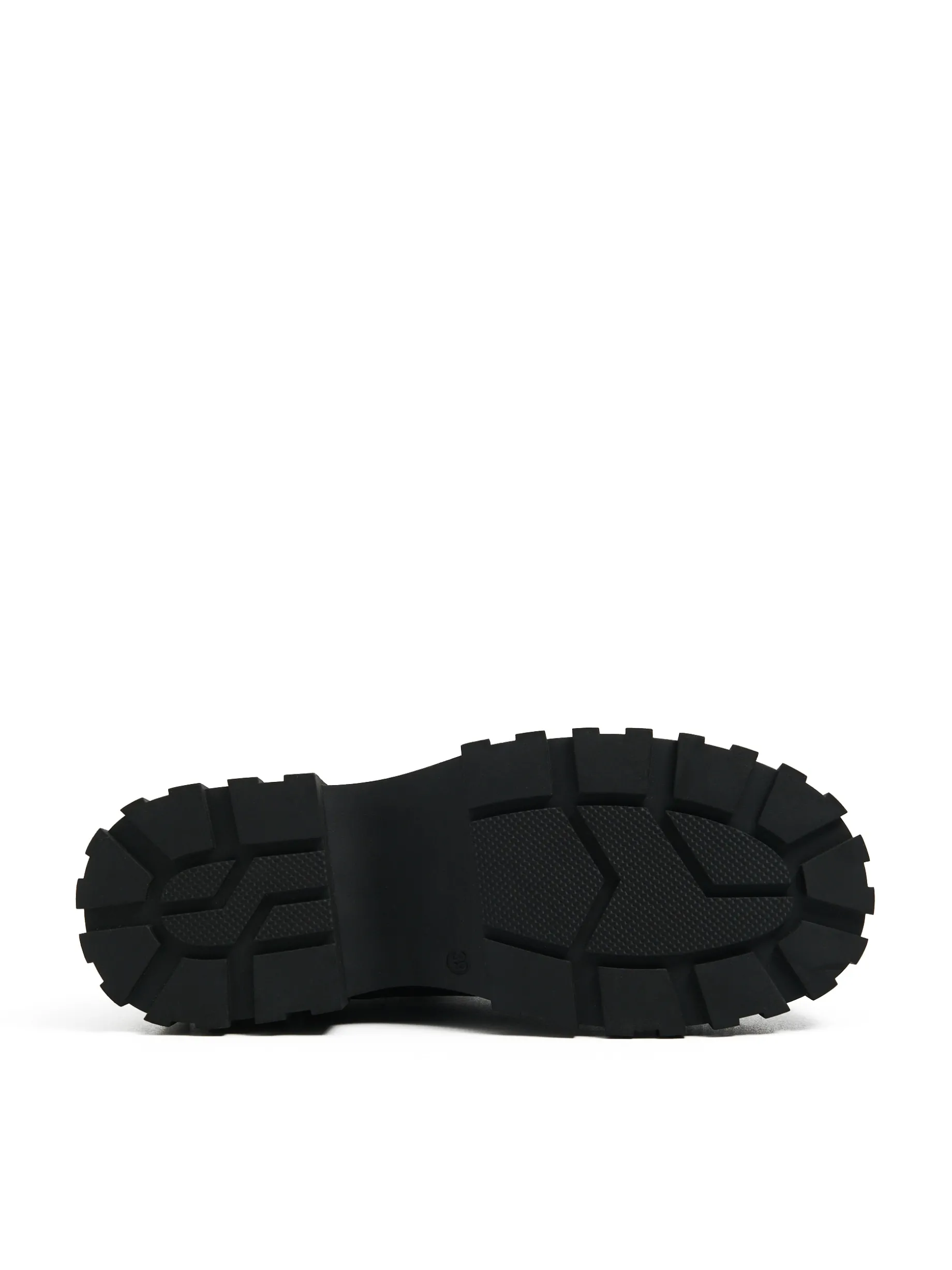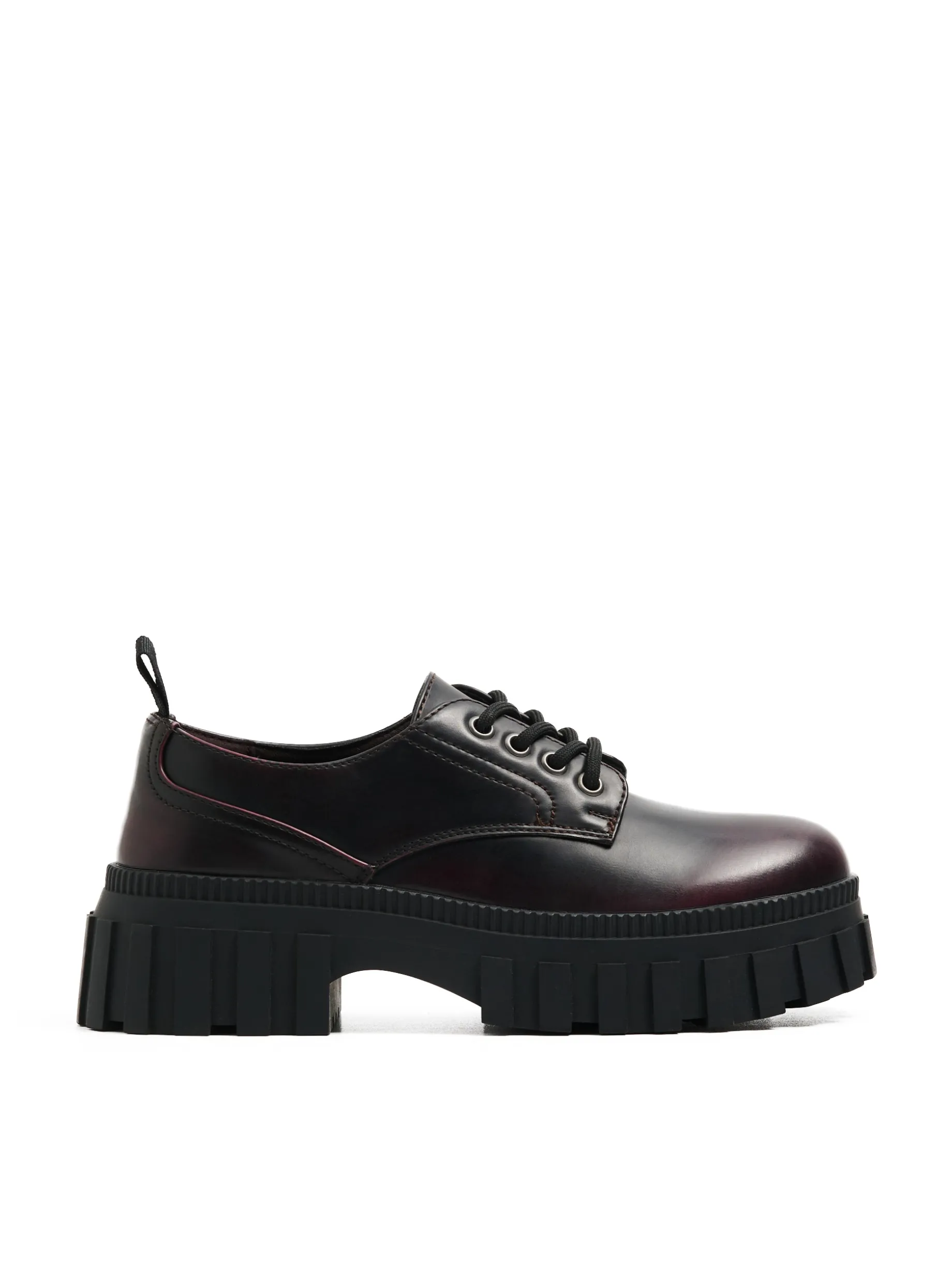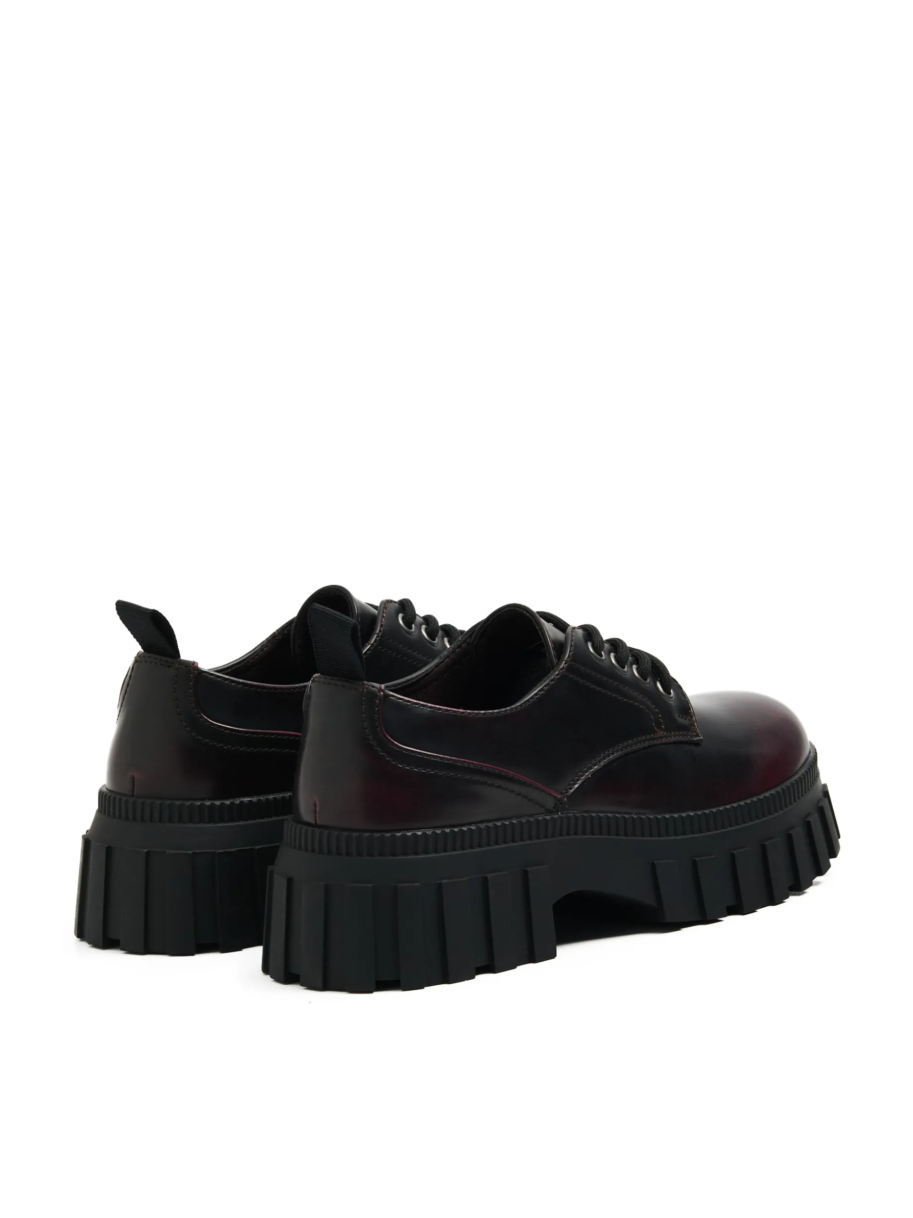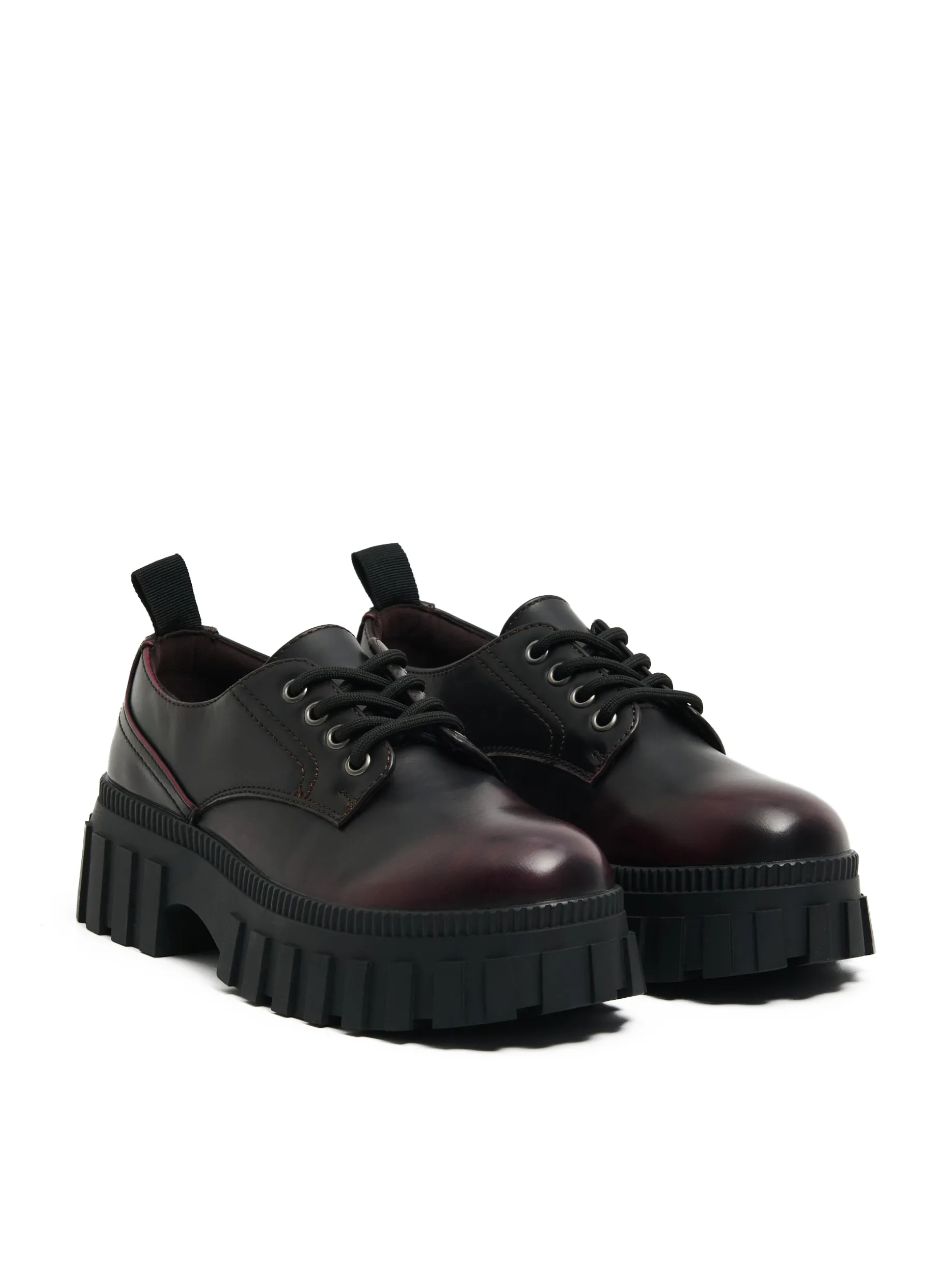 Damskie półbuty typu derby wykonane z imitacji skóry. Solidna podeszwa z gumy termoplastycznej chroni przed różnego typu powierzchniami. Wyjątkowy bordowo-czarny kolor będzie idealnym dodatkiem jesiennych stylizacji. wykonane z łączonych materiałów przejściowe półbuty z imitacji skóry traperowa podeszwa wykonana z gumy termoplastycznej wiązane na elastyczne, prążkowane sznurówki wygodny uchwyt do wkładania i zdejmowania butów ozdobne przeszycia