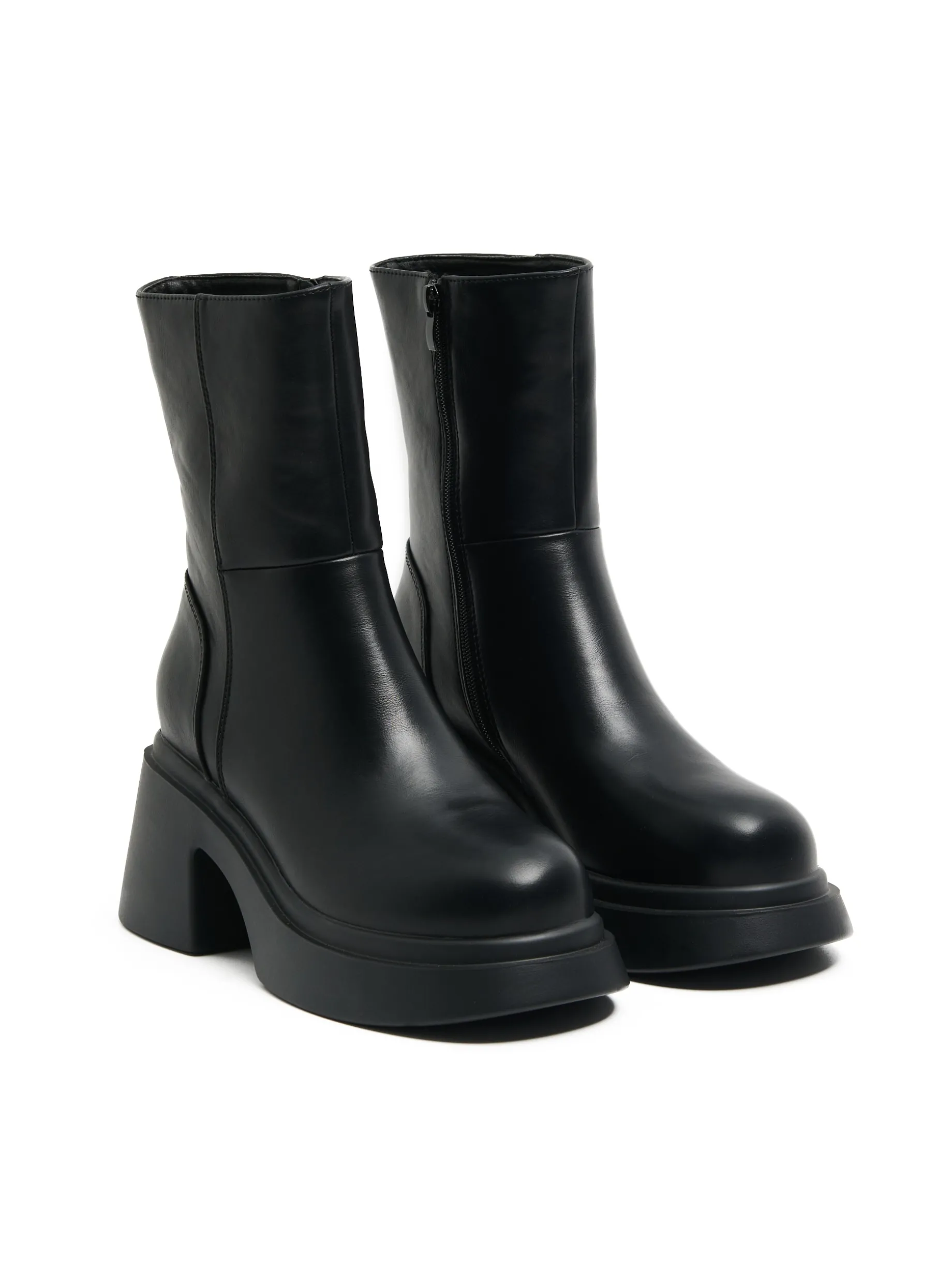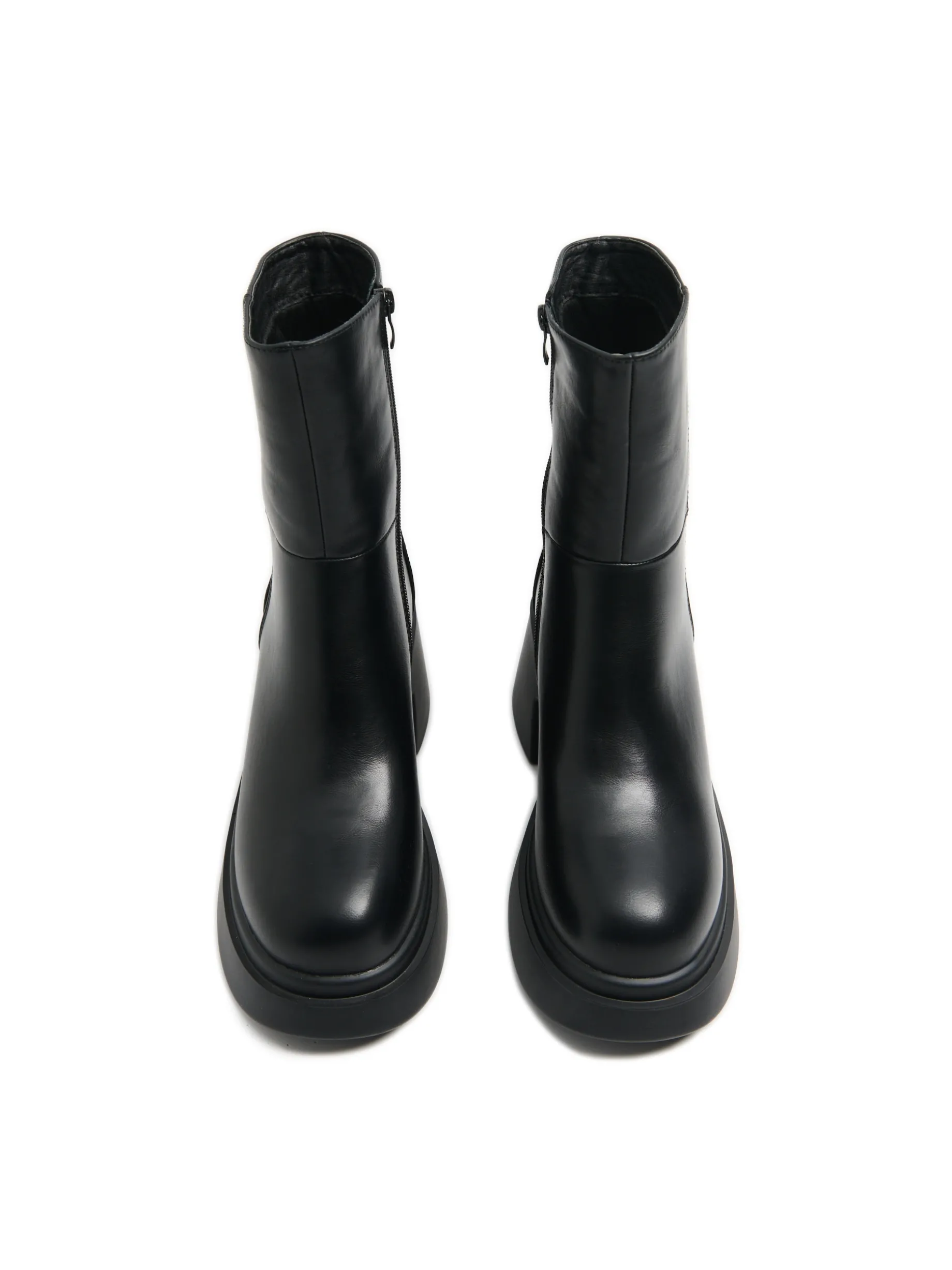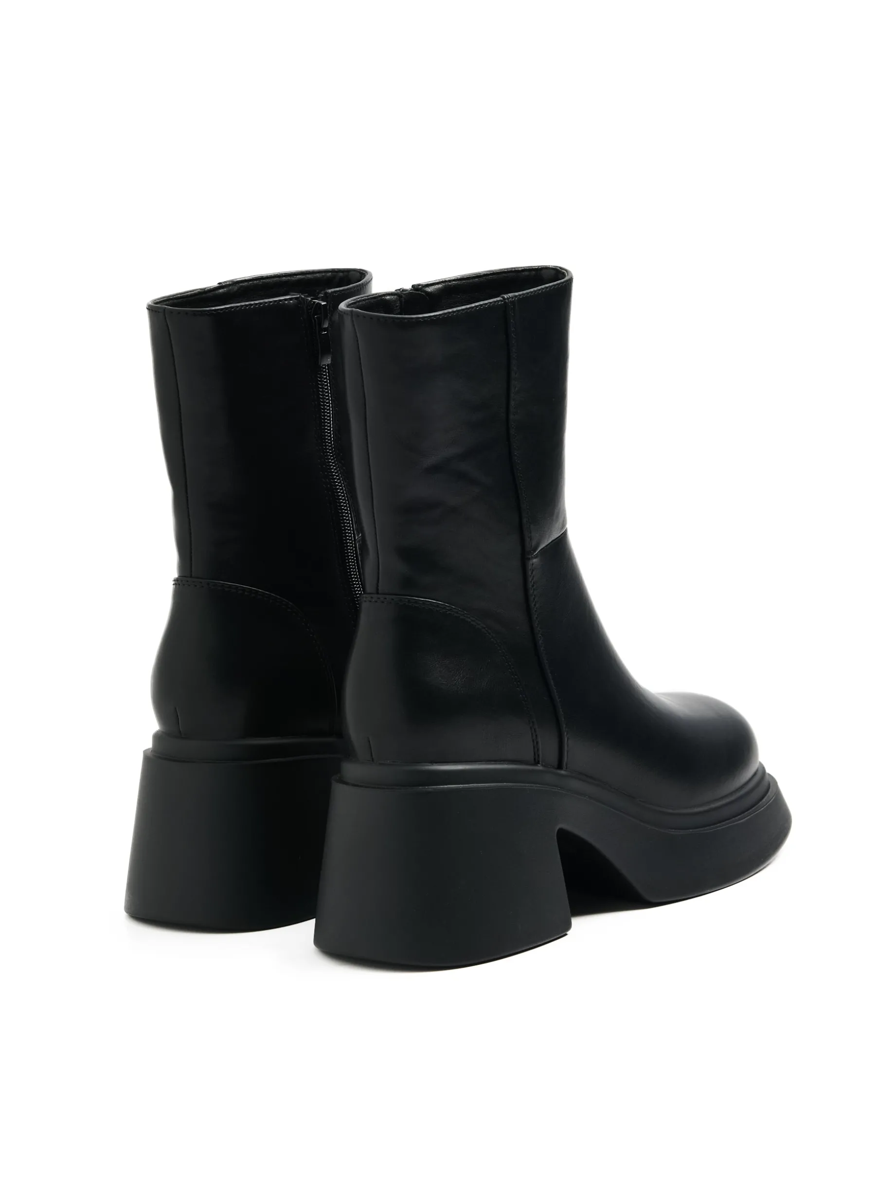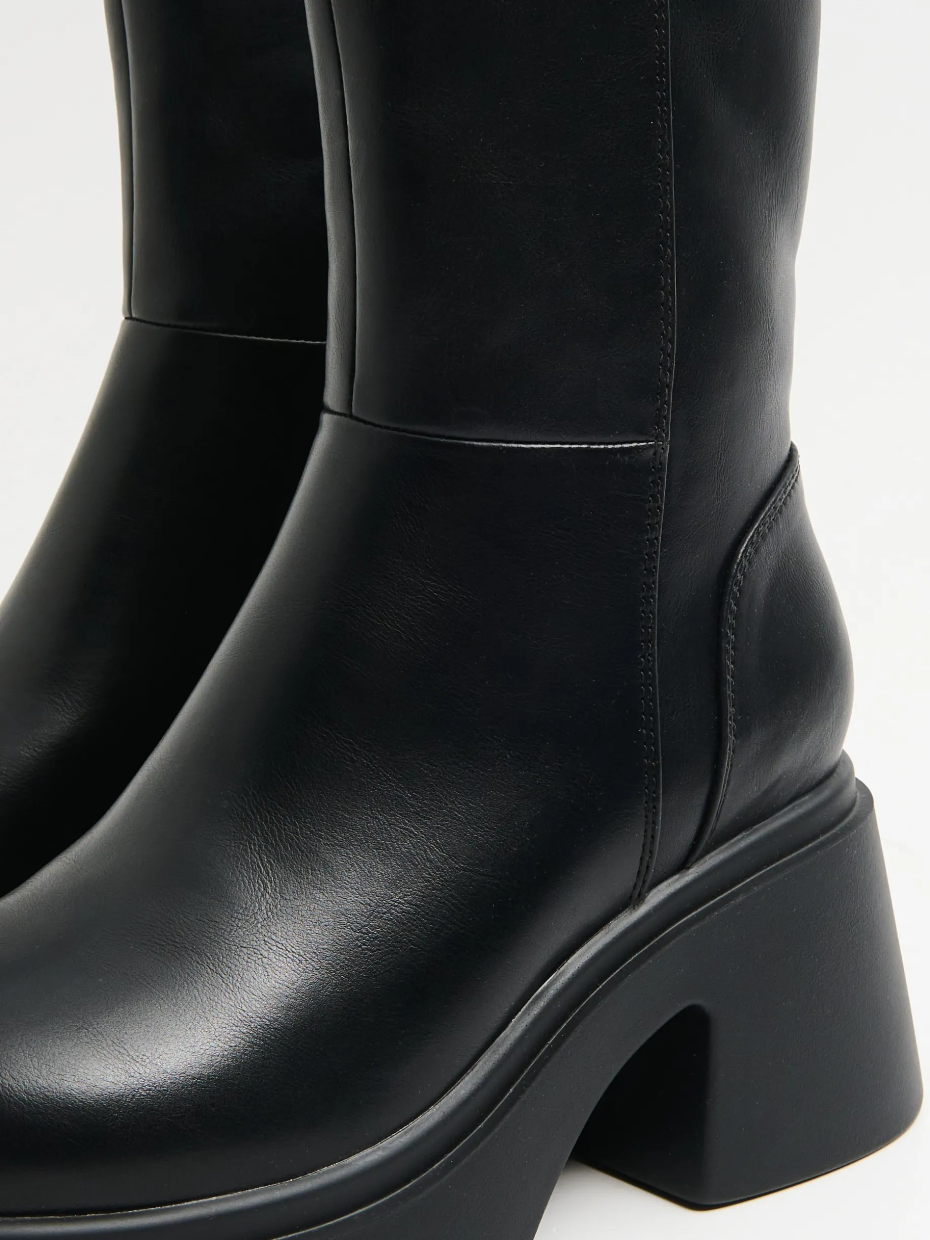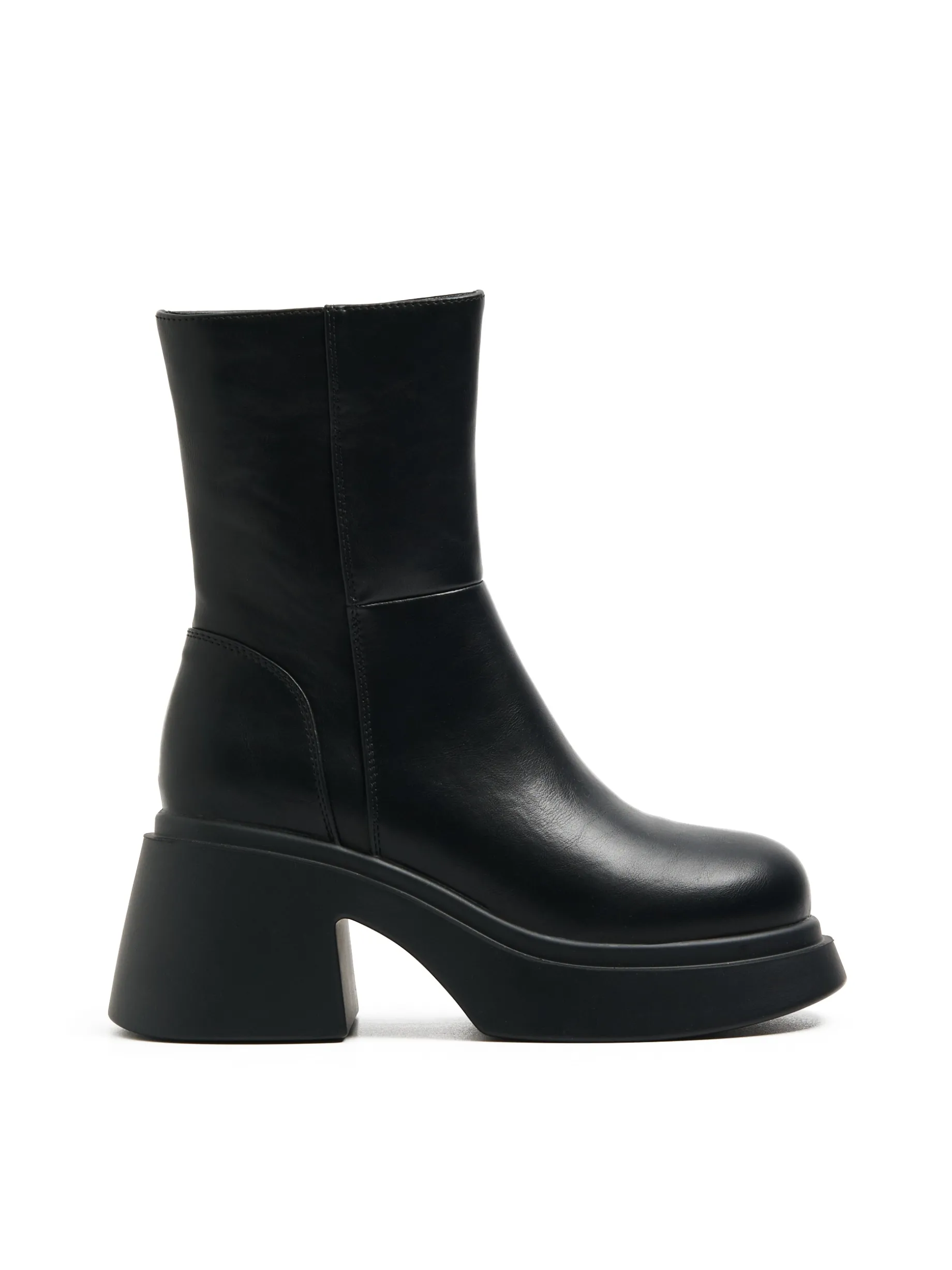 Buty damskie typu botki wykonane z materiału imitującego skórę. Ten czarny klasyk na platformie i słupku to must have sezonu jesienno-zimowego! botki z wysoką cholewką uszyte z imitacji skóry gruba, solidna podeszwa na platformie obcas w formie słupka ozdobne przeszycia