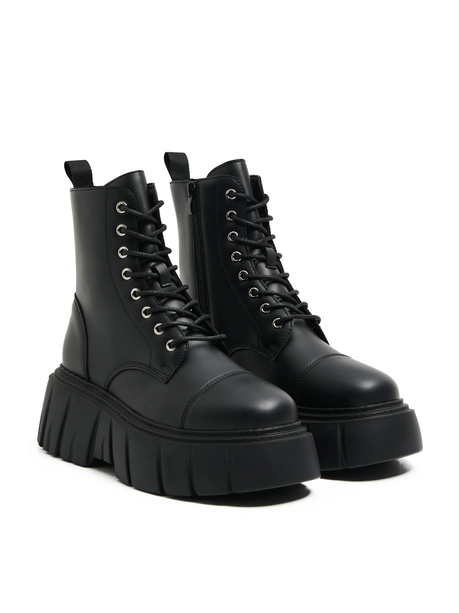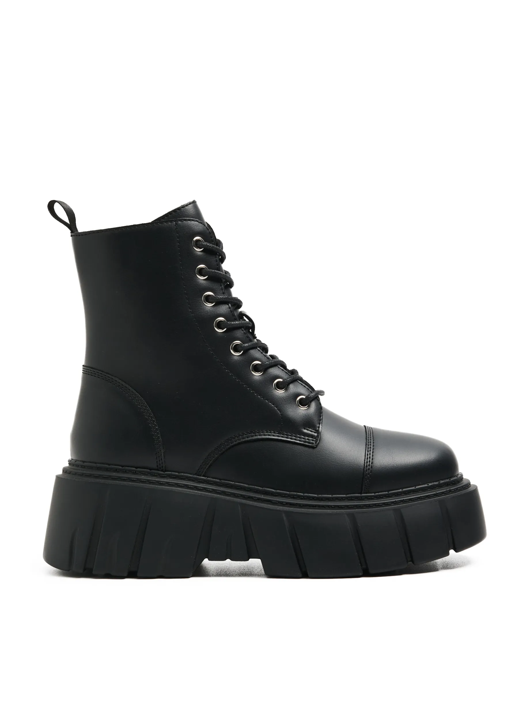 Damskie botki z wysoką cholewką, wykonane z materiału imitującego skórę. Wyposażone w solidne podeszwy, idealne na sezon jesienno-zimowy. botki za kostkę cholewka z imitacji skóry traperowa, masywna podeszwa wiązane na czarne sznurowadła metalowe detale wygodny uchwyt do wkładania i zdejmowania butów
