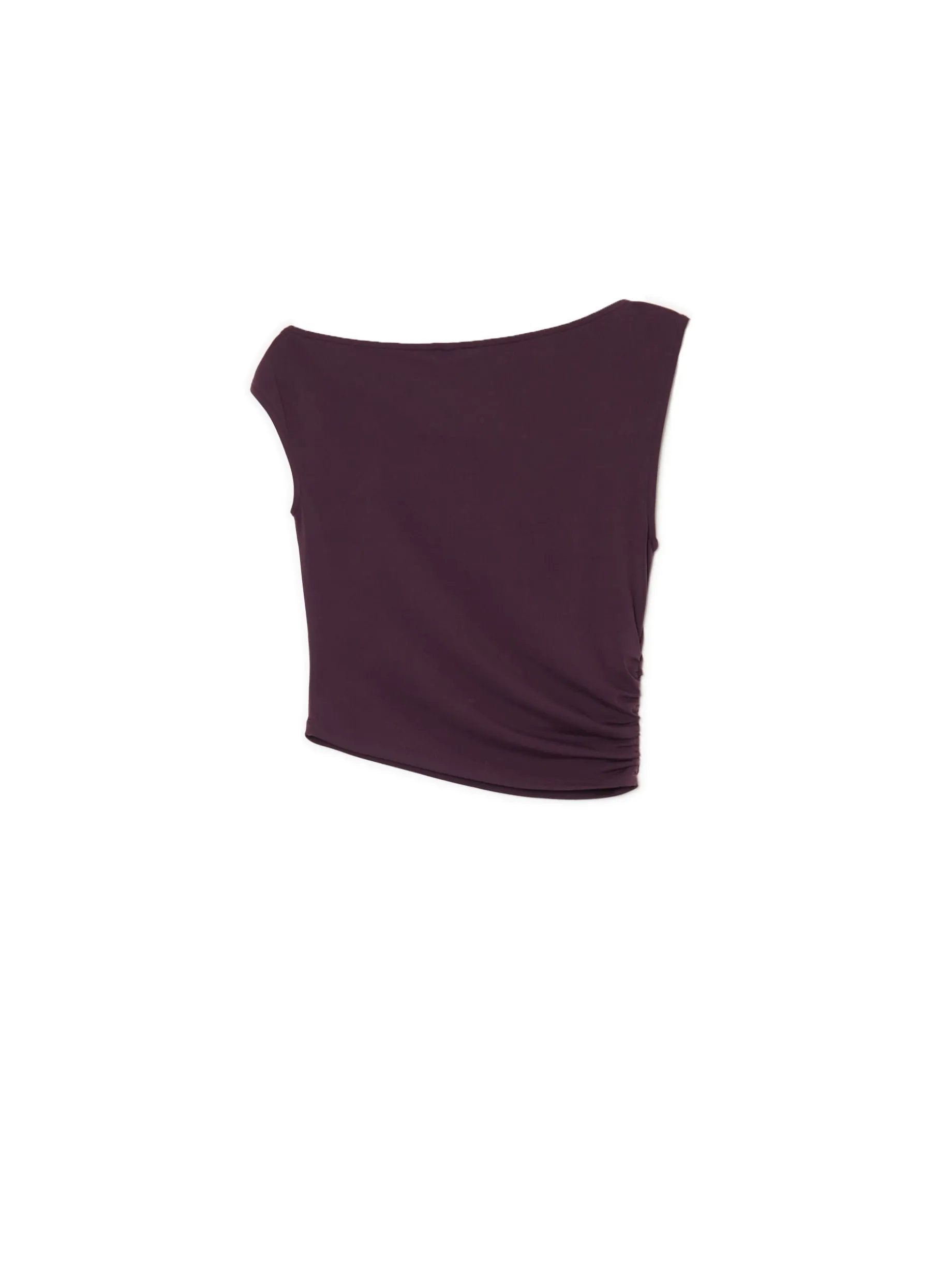 Damski top, uszyty z dzianiny z domieszką elastanu. krótki, dopasowany krój dekolt typu łódka w talii marszczenia Wzrost modelki: 177 cm