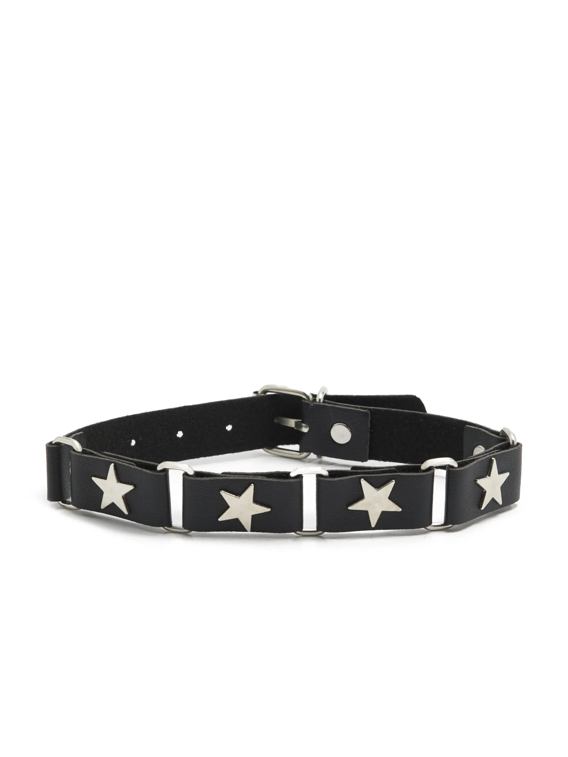 Damski naszyjnik typu choker, wykonany z czarnej imitacji skóry, ozdobiony detalami w kształcie gwiazdek w kolorze srebrnym. Możliwość regulacji obwodu.
