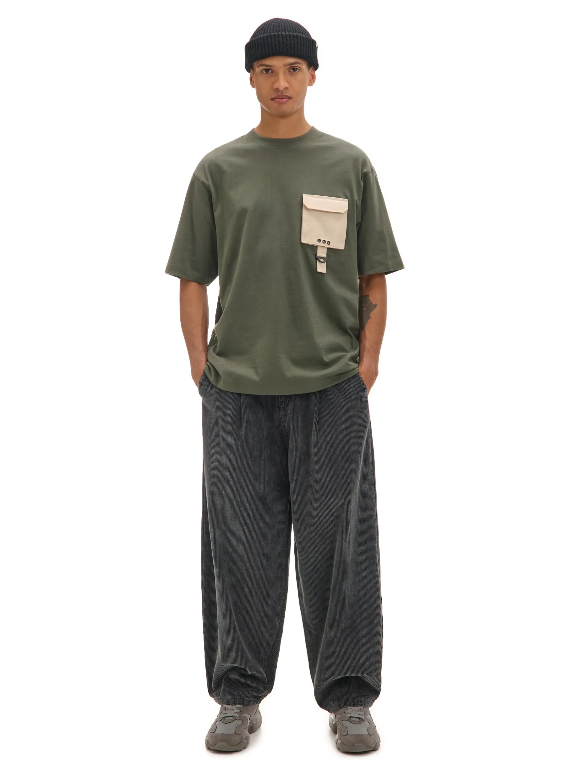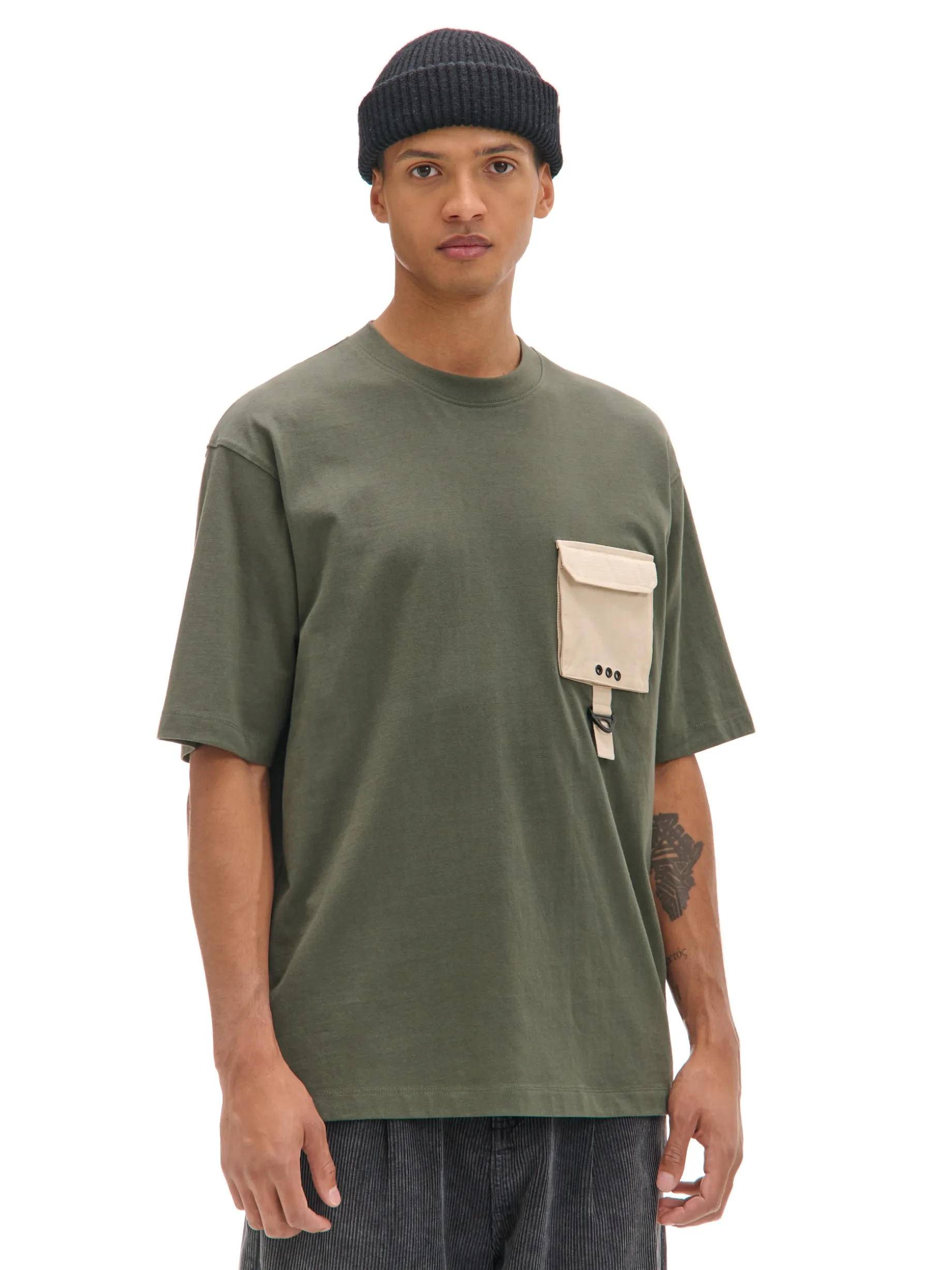 T-shirt męski w kolorze zielonym, uszyty z bawełnianego materiału. Wyróżnikiem tego modelu jest kieszonka typu cargo na przodzie w jaśniejszym odcieniu. 100% bawełny wygodny krój comfort krótkie, swobodne rękawy lekko obniżona linia ramion naszywana kieszeń na piersi dekoracyjne rozcięcia po bokach