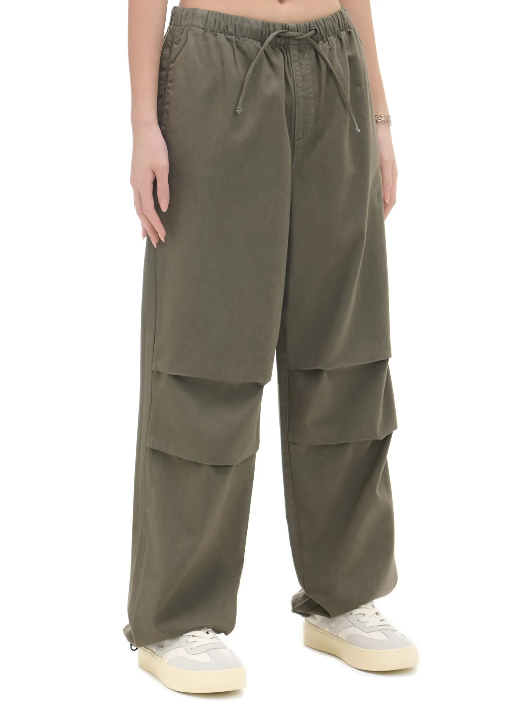 Damskie spodnie jeansowe o swobodnym fasonie parachute, uszyte z bawełny. W pasie gumka i sznurek do regulacji, boczne kieszenie, szeroka nogawka z regulacją u dołu. Wzrost modelki: 168 cm