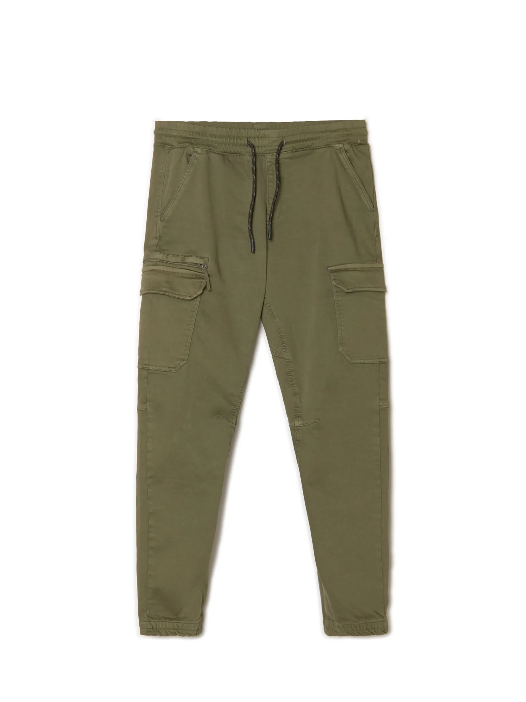 Spodnie męskie o kroju slim jogger, uszyte z tkaniny o wysokiej zawartości bawełny. w pasie gumka i sznurek do regulacji liczne kieszenie, w tym kieszenie typu cargo nogawka ze ściągaczem dostępne inne warianty kolorystyczne Model prezentuje produkt w rozmiarze M/L. Wzrost modela: 185 cm