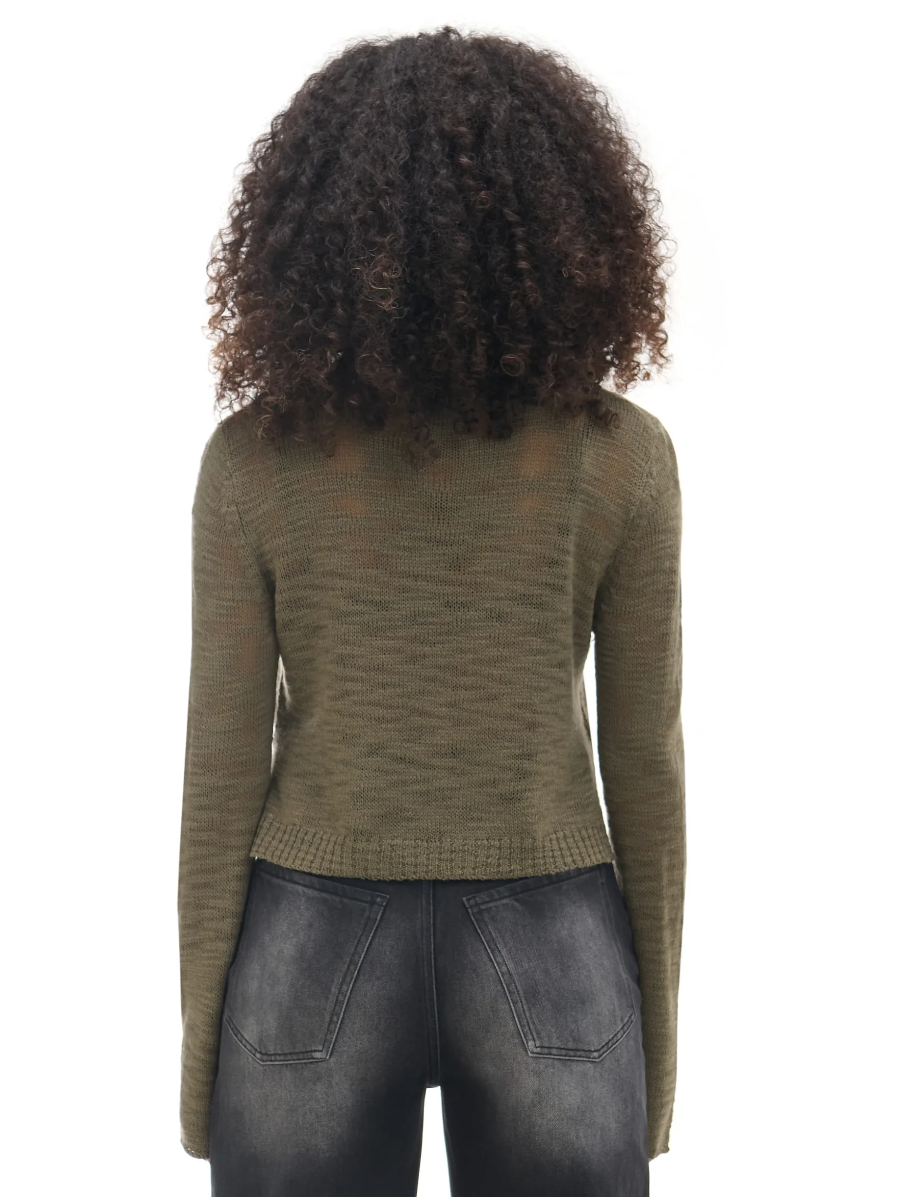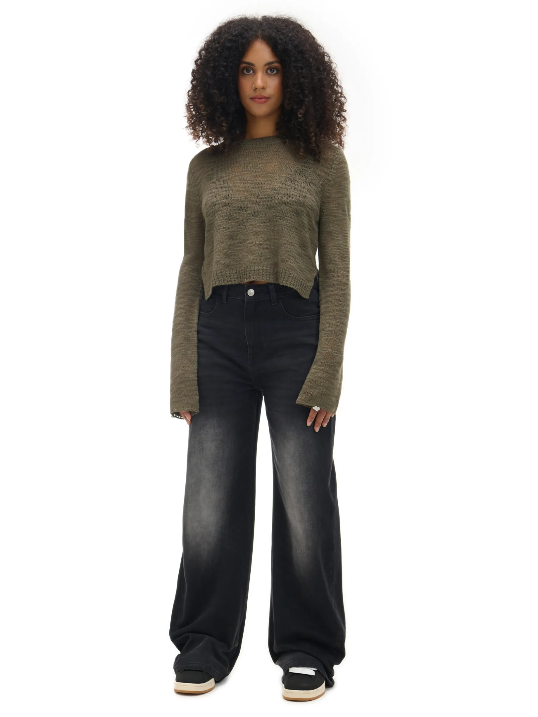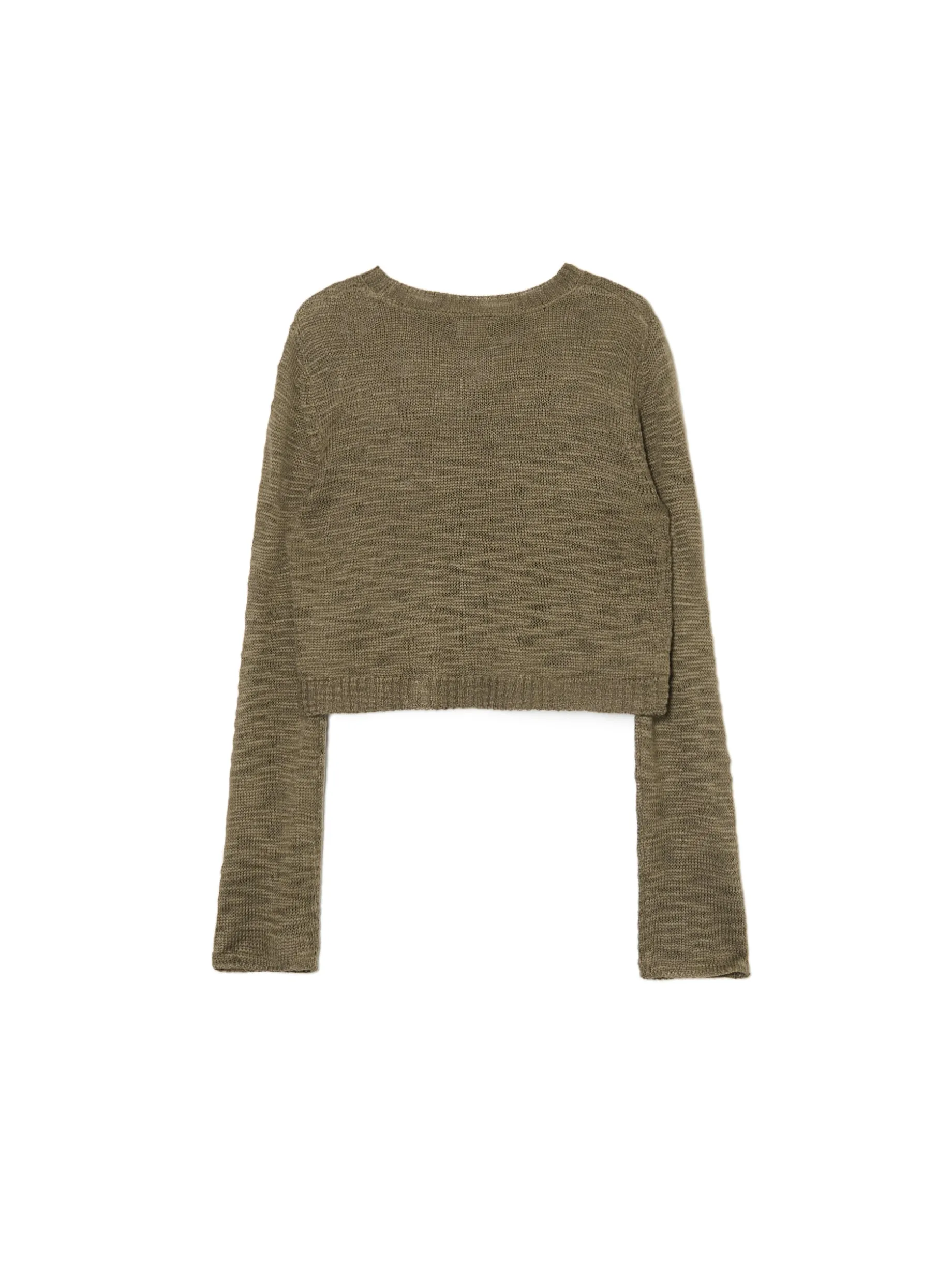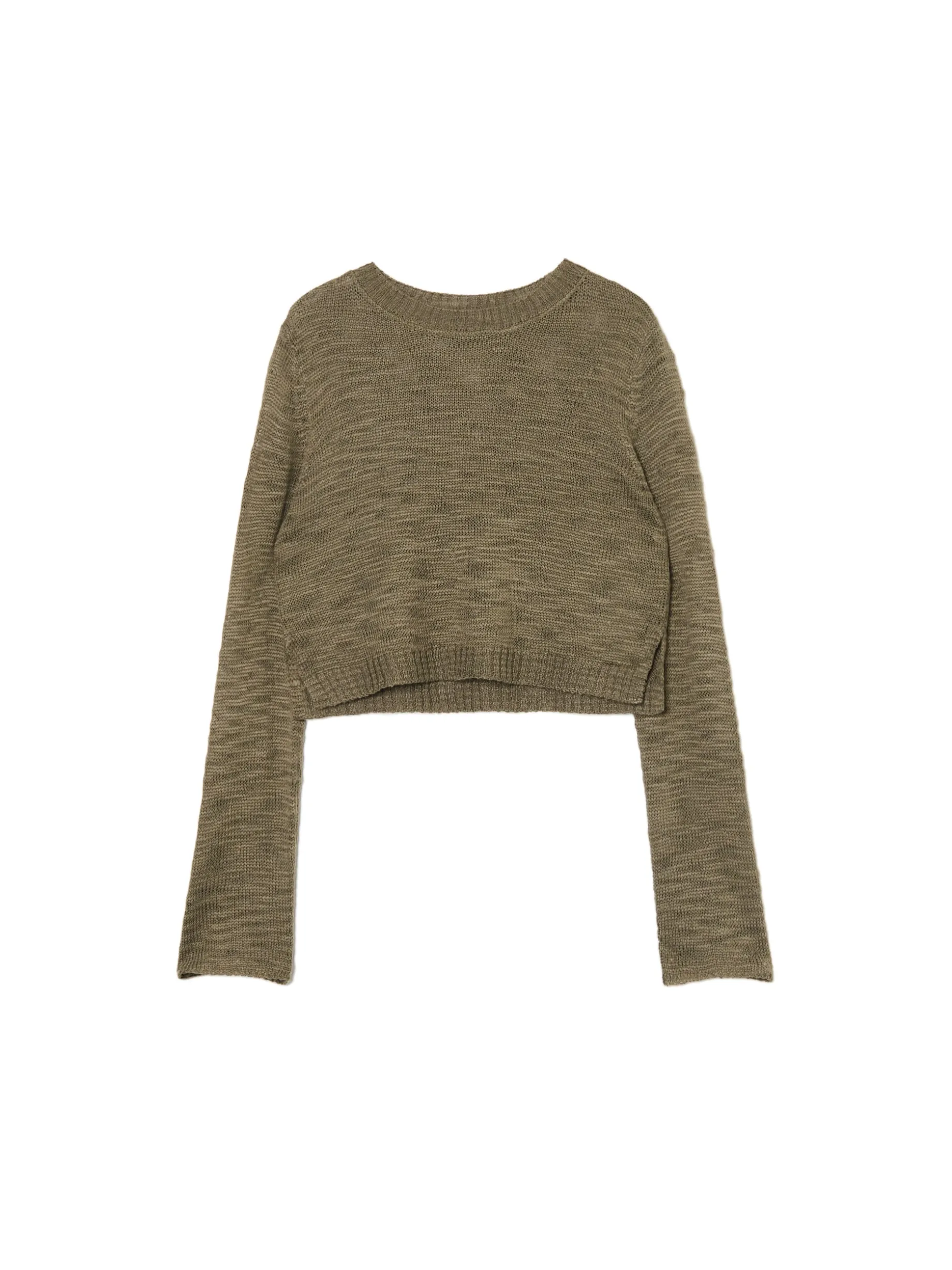 Damski sweter o krószym kroju z długimi rękawami, uszyty z prześwitującego materiału. Fituje z różnego typu koszulkami na ramiączkach i topami. wyjątkowo mocny, a jednocześnie wygodny materiał regularny krój półokrągły dekolt z lamówką długie, swobodne rękawy dekoracyjne rozcięcia po bokach