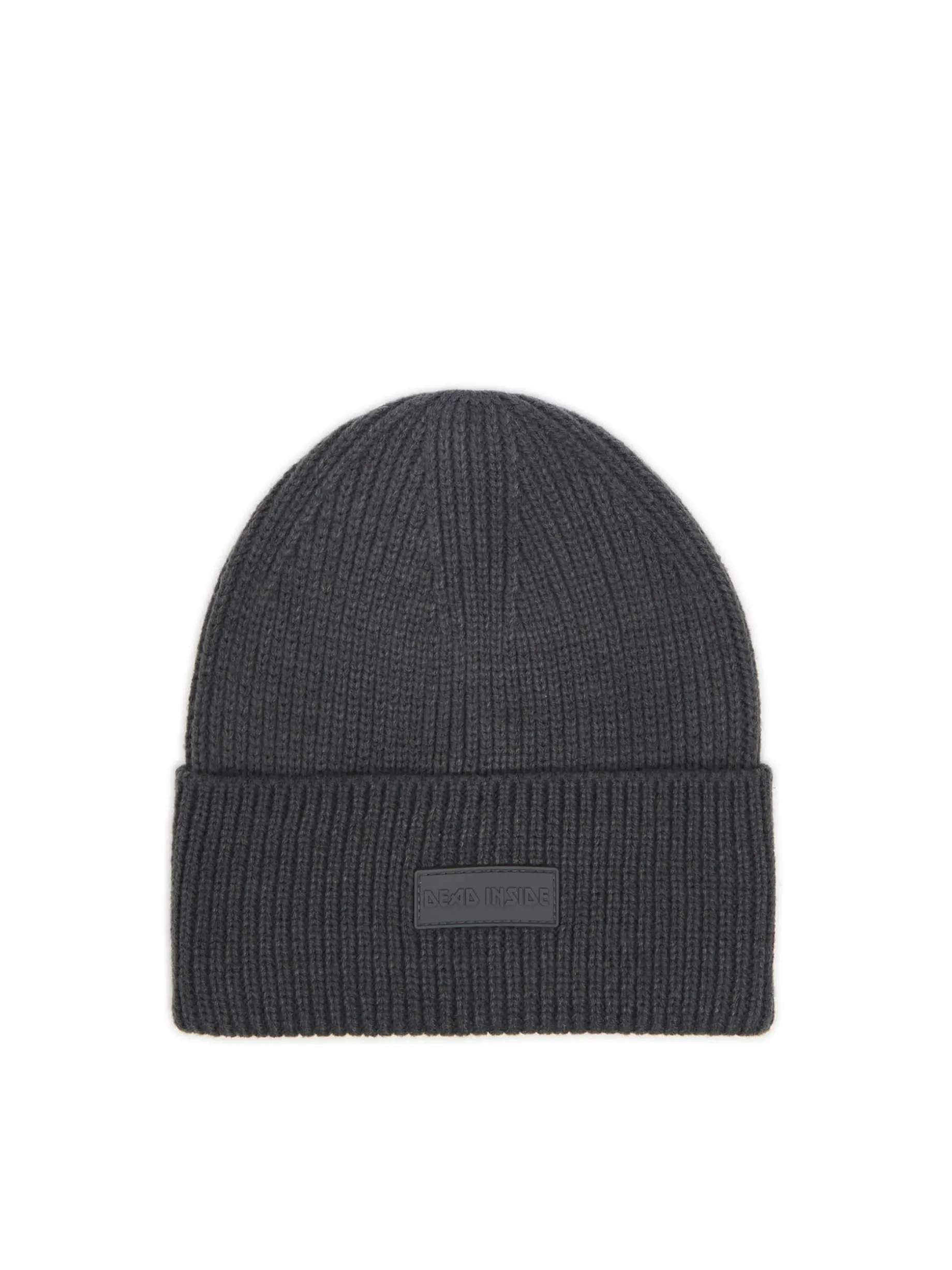 Damska czapka beanie, uszyta z szarej dzianiny. Z przodu gumowa naszywka.