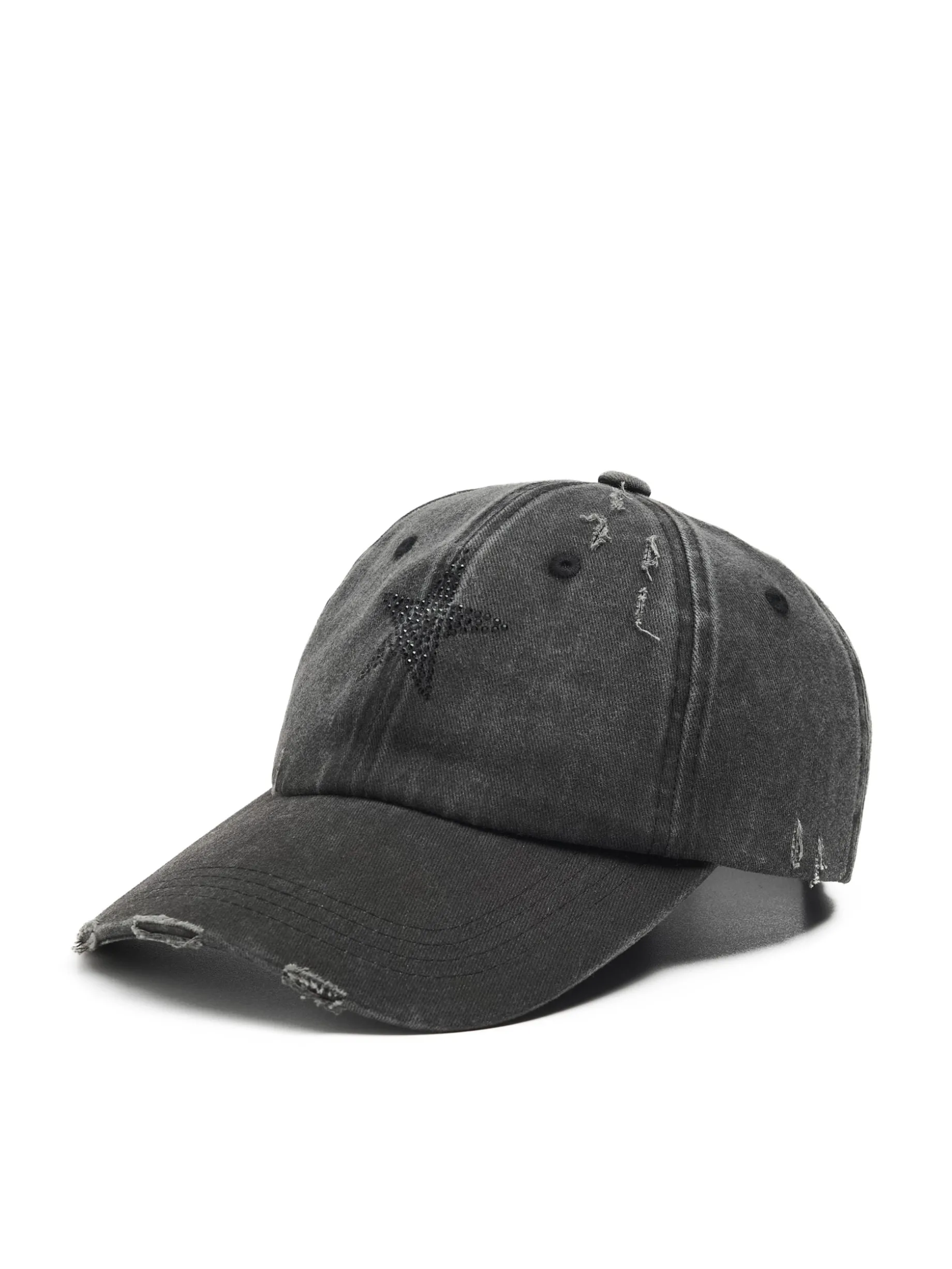 Damska czapka z daszkiem uszyta z dzianiny z efektem sprania, przetarciami i ozdobną aplikacja z przodu. Idealna na letnie, ciepłe dni! wykonana z łączonych materiałów dół z regulacją obwodu efekt sprania na całości delikatne postrzępienia i przetarcia z przodu aplikacja