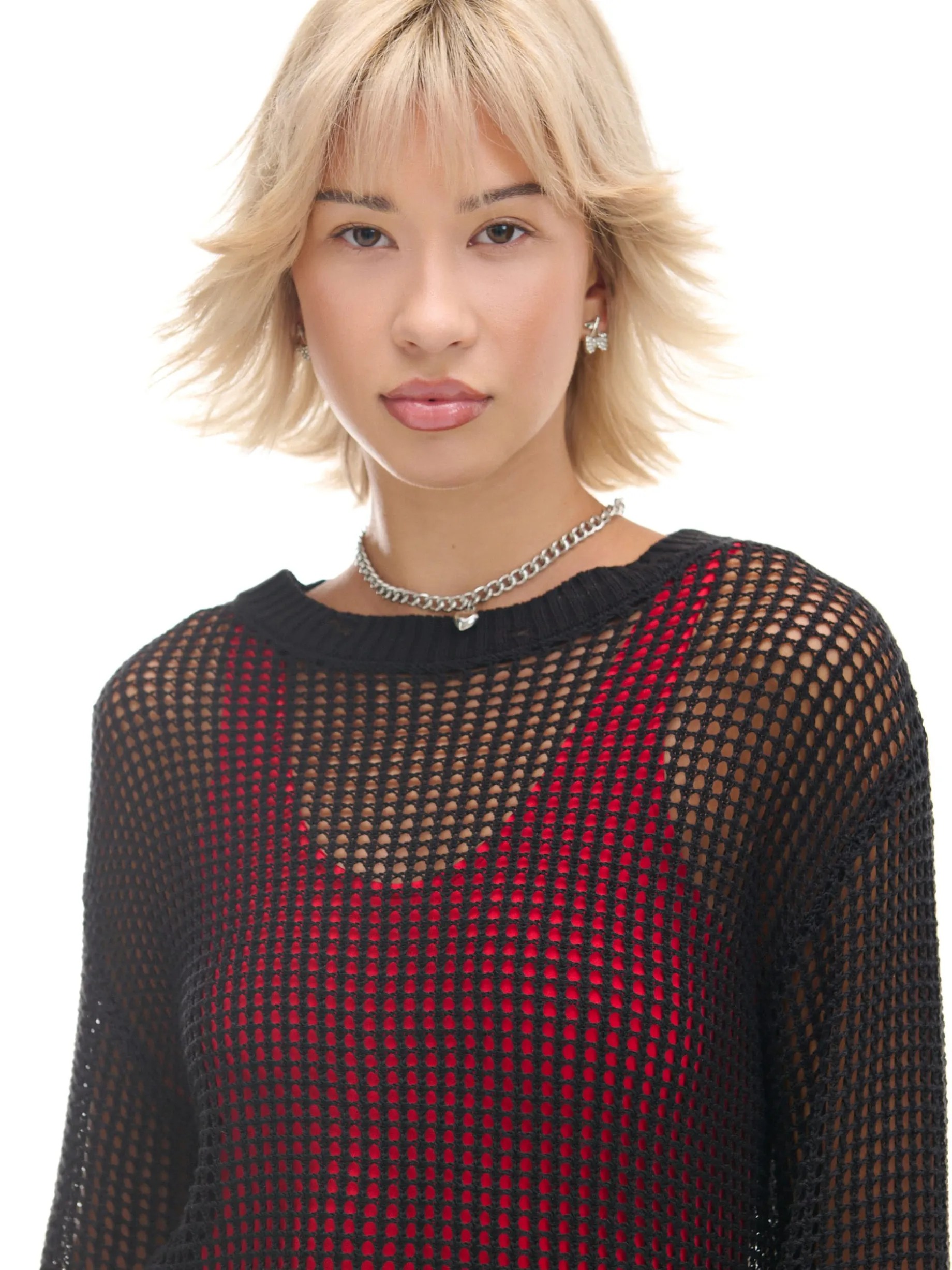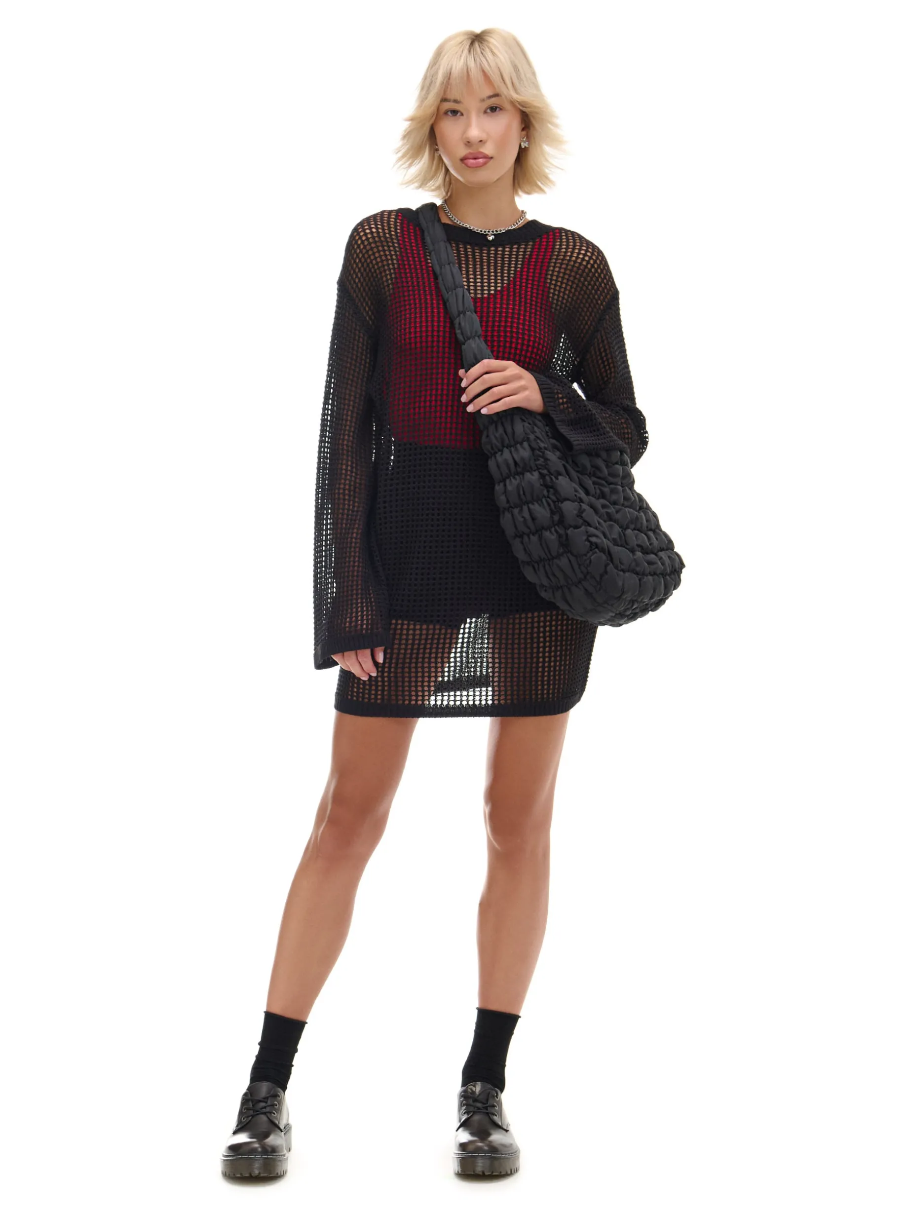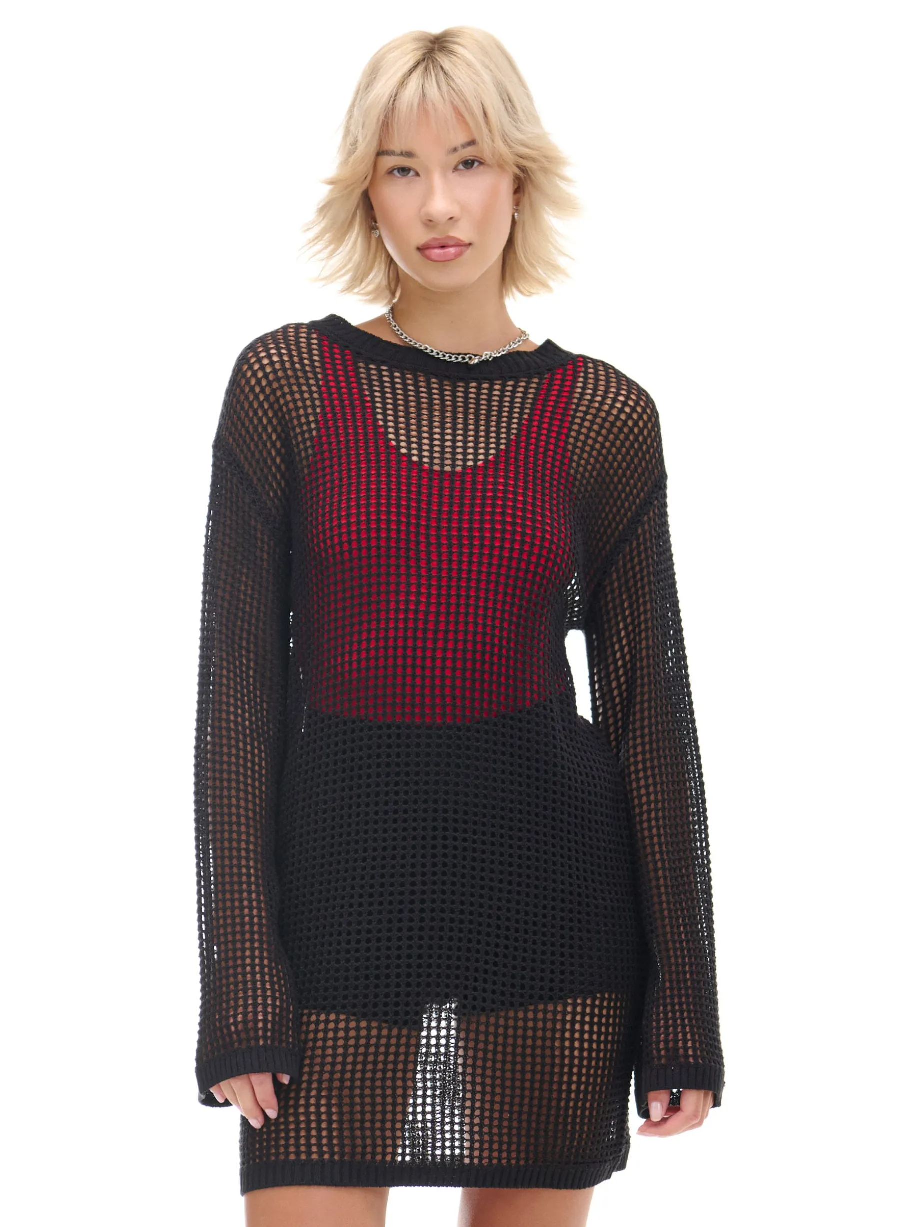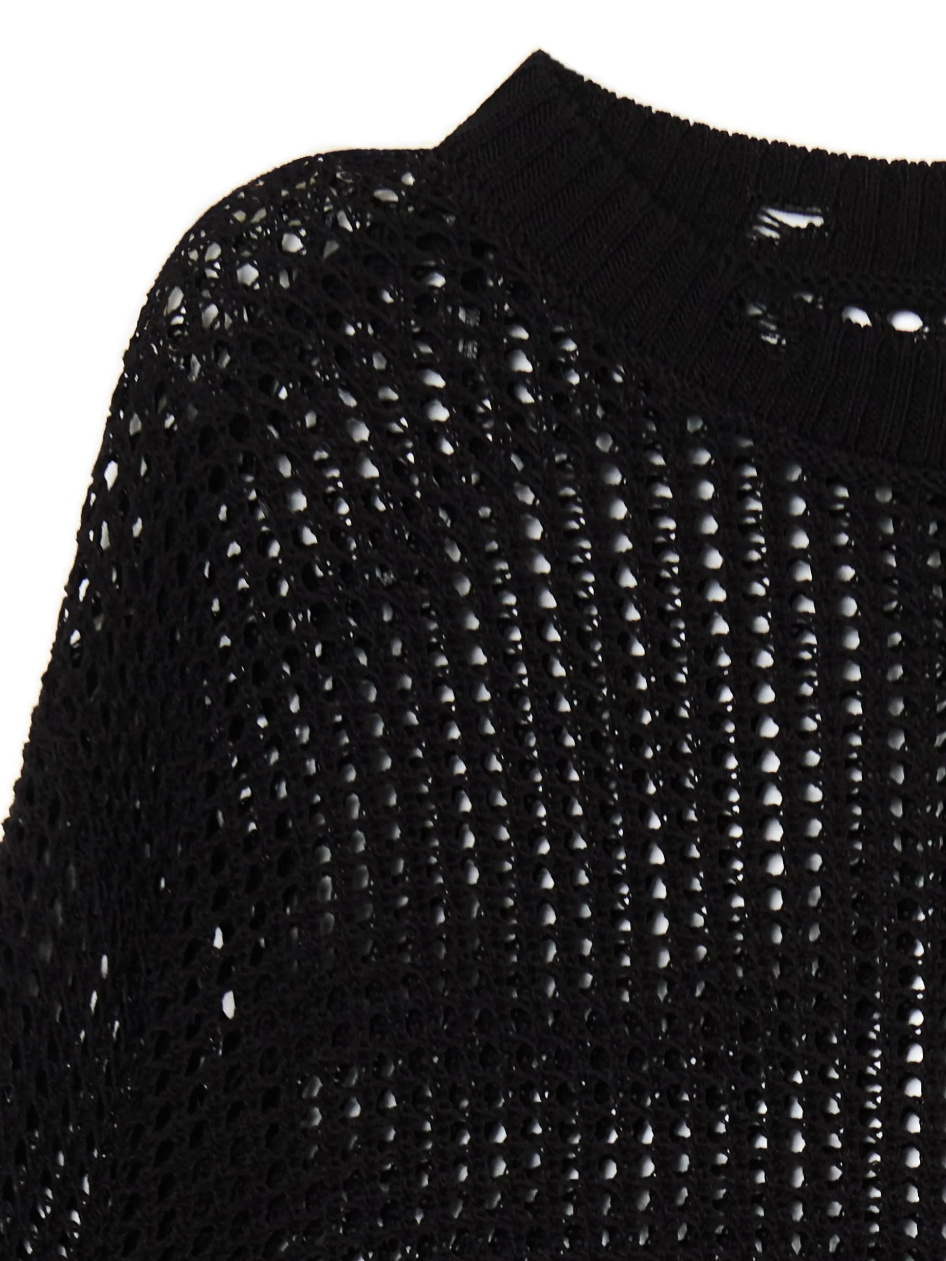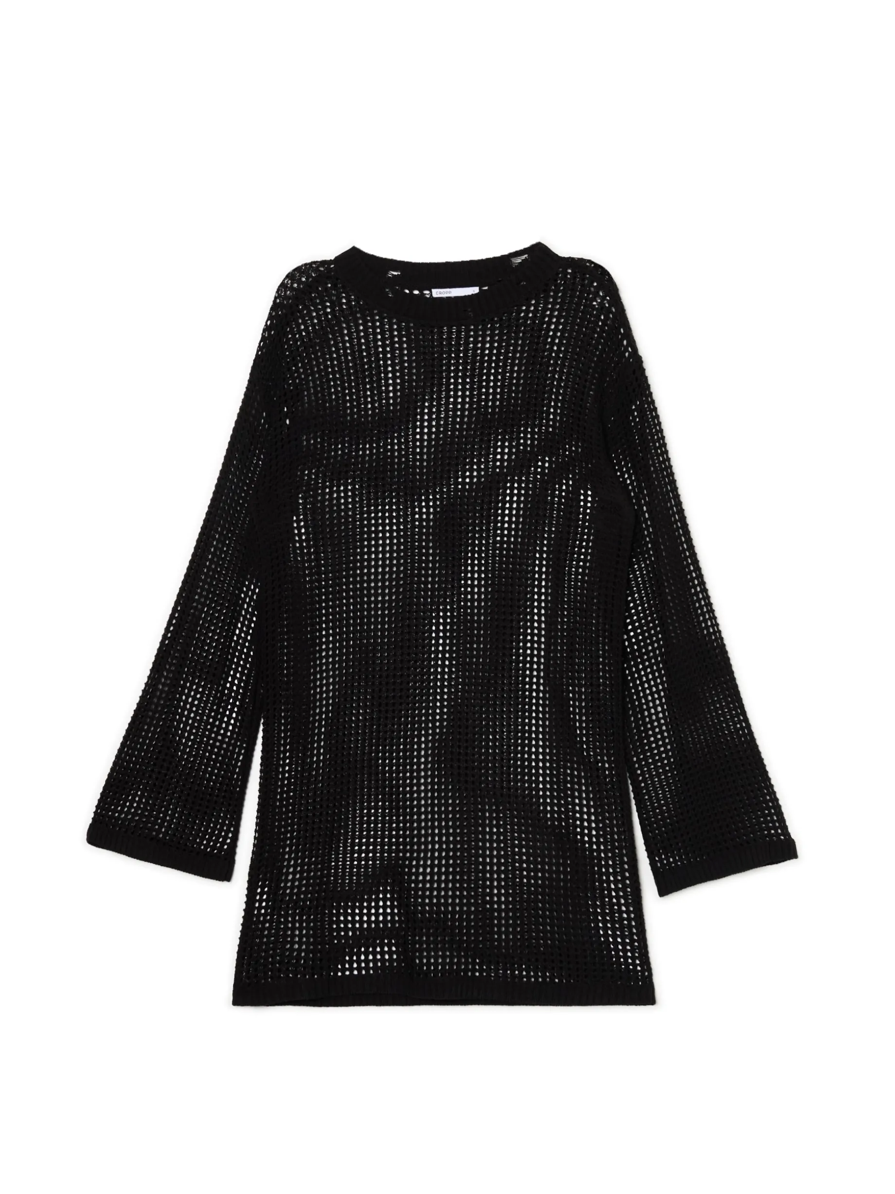 Damska szydełkowa sukienka wykonana z dzianiny w kolorze czarnym. Idealny dodatek do body, topów, sukienek, a nawet strojów kąpielowych. Stwórz własne stylizacje z tym itemem! uszyty z gładkiej dzianiny dłuższy, prosty krój długie, swobodne rękawy półokrągły dekolt z lamówką ażurowy wzór na całości Wzrost modelki: 177 cm