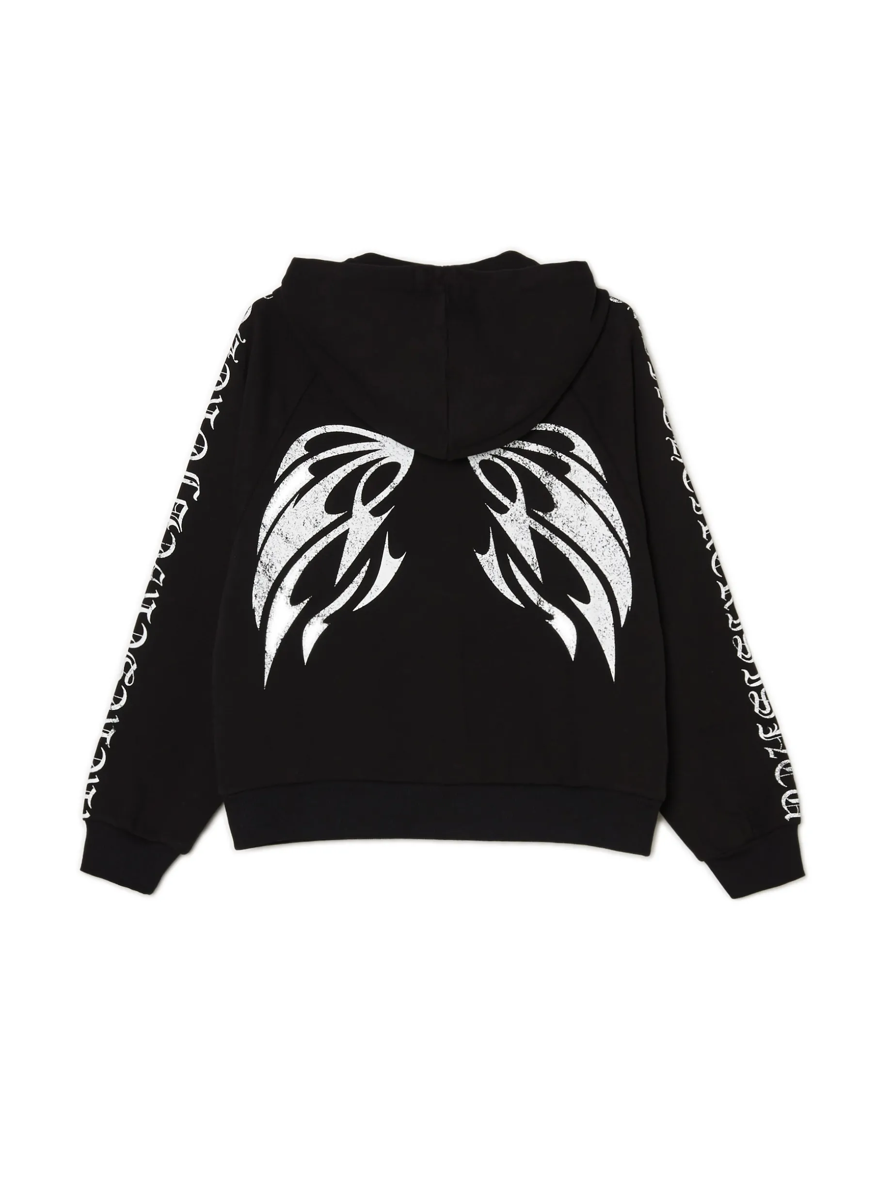 Czarna damska bluza z kapturem typu hoodie. Skrzydła na plecach i ozdobne lampasy na rękawach kuszą swoją oryginalnością. uszyta z materiału o dużej zawartości bawełny regularny, prosty krój duży kaptur typu hoodie długie rękawy ze ściągaczami przy mankietach zapięcie na zamek Modelka prezentuje produkt w rozmiarze S/36. Wzrost modelki: 175 cm