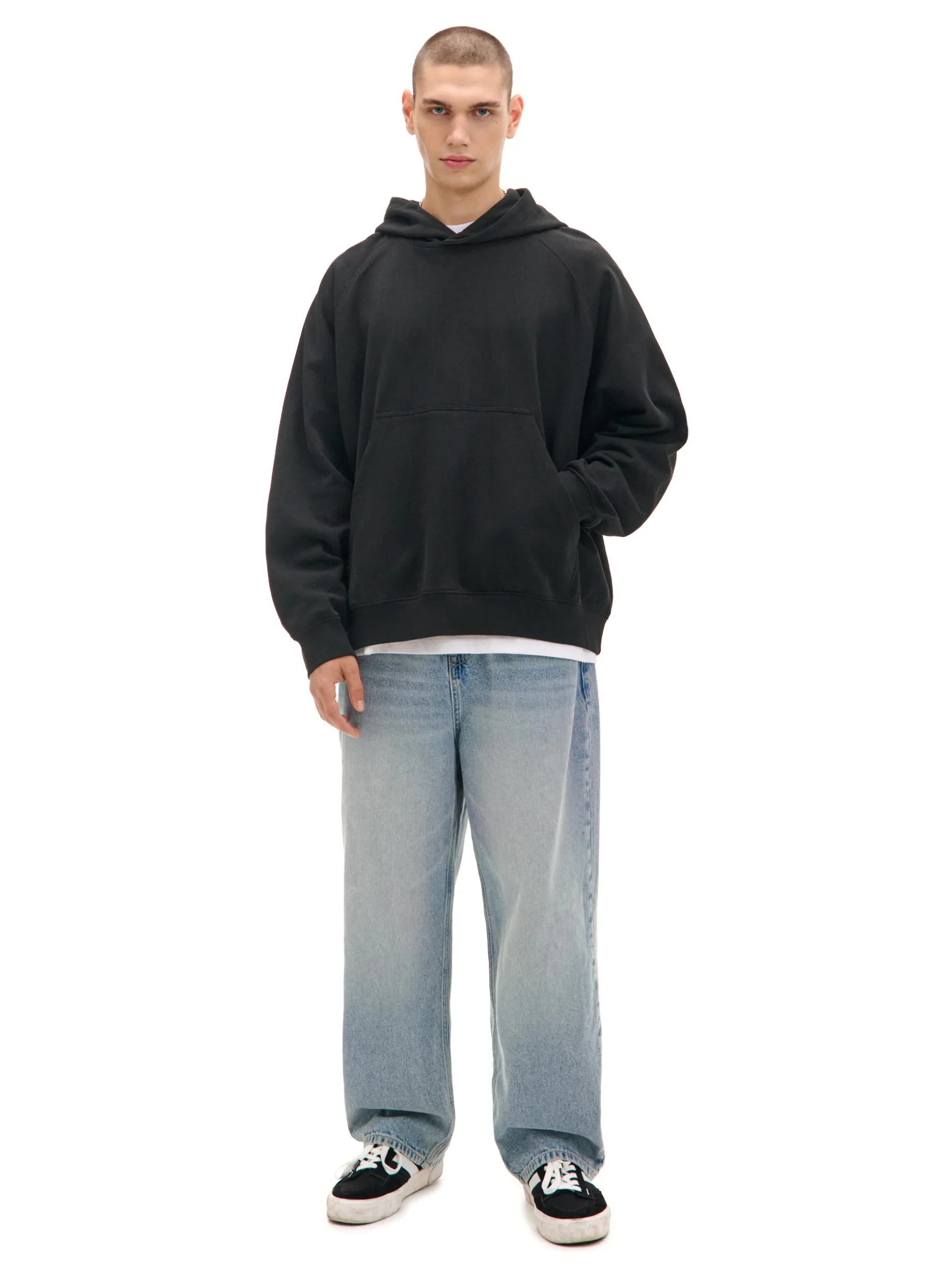 Męska bluza o kroju oversize w gładkim kolorze, uszyta z solidnej dzianiny. Szeroki kaptur, swobodny fason i kieszeń kangurka to must have wzorcowej hoodie. 100% bawełny swobodne, raglanowe rękawy dół i mankiety wykończone ściągaczami obszerny kaptur kieszeń kangurka na przodzie Tworzy zestaw z modelem 424AT-99X . Gramatura: 400 gsm