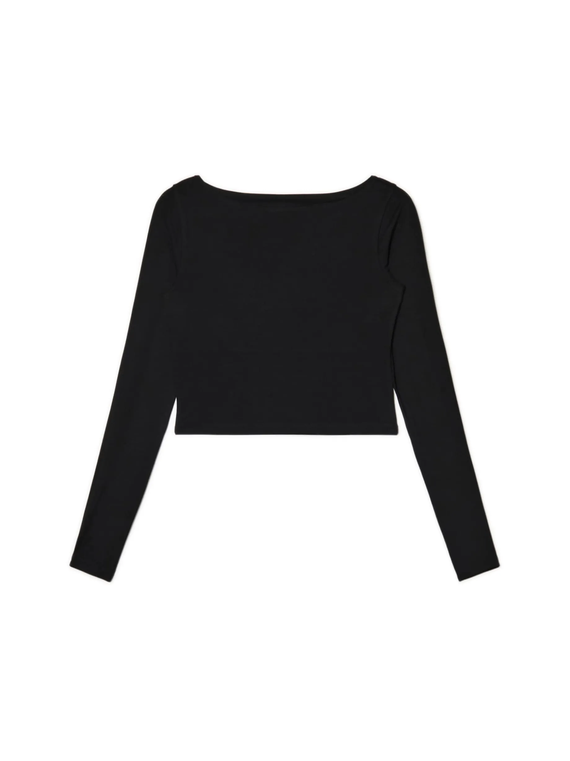 Damska bluzka z długimi rękawami o krótszym, dopasowanym fasonie z dekoltem w łódkę. Idealny item na chłodniejsze wieczory. wiskoza z domieszką elastycznych włókien dopasowany krój podkreślający sylwetkę dekolt w łódkę długie, dopasowane rękawy Wzrost modelki: 177 cm