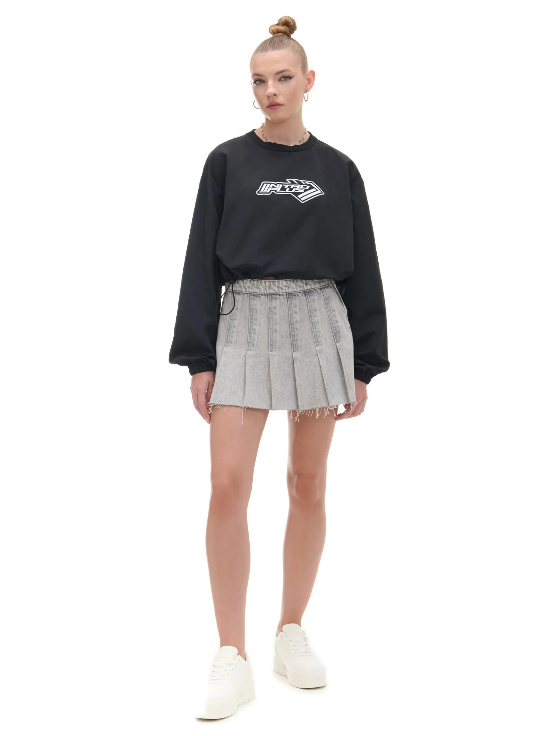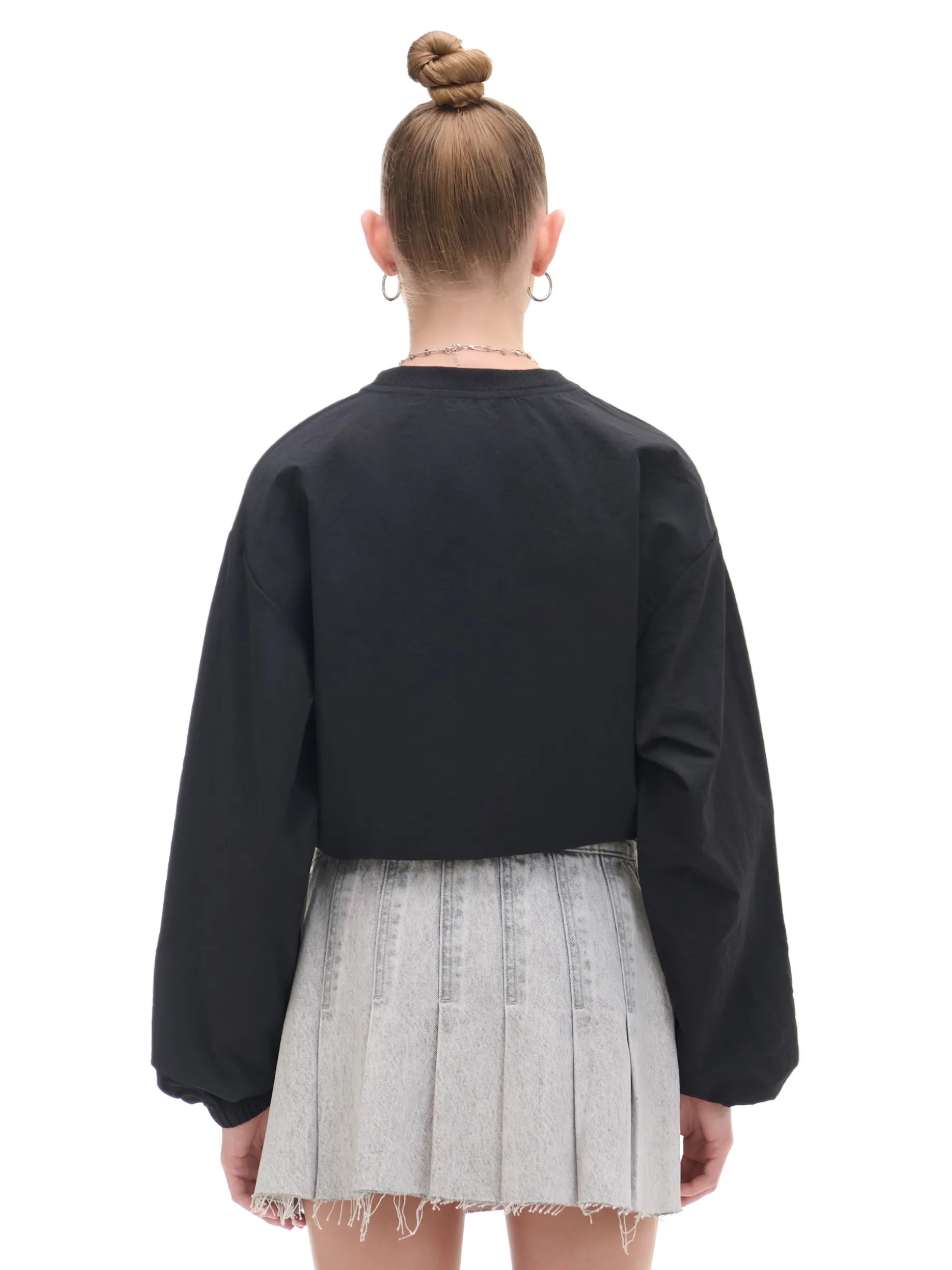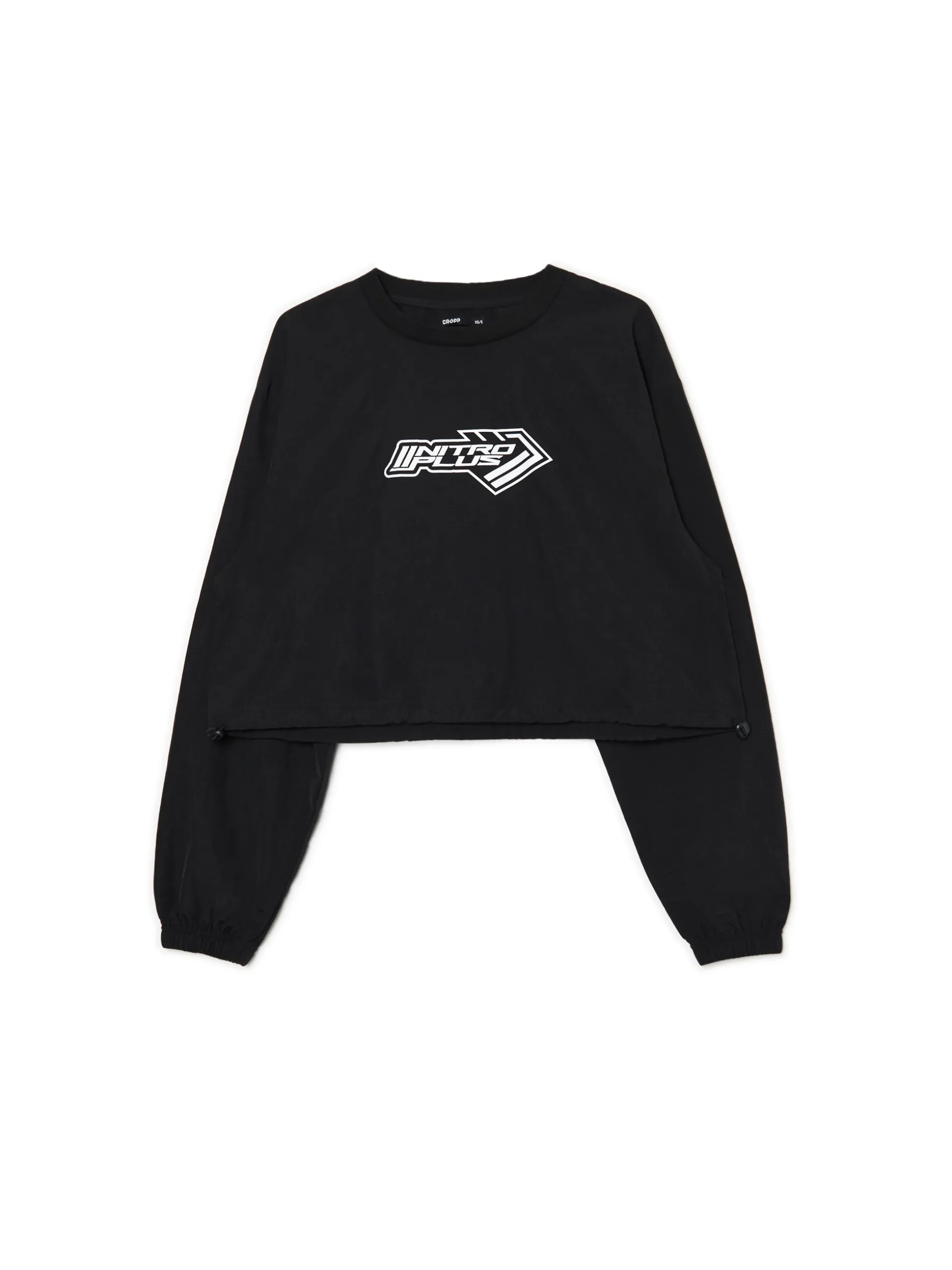 Luźna damska bluzka z długim rękawem, uszyta z trwałej tkaniny z napisem tekstowym na przodzie. W talii możliwość regulacji, która zapobiega unoszeniu się materiału. krój oversize okrągły dekolt z lamówką długie rękawy z gumką przy mankietach lekko obniżona linia ramion ściągacz tunelowy ze stoperami w talii nadruk z przodu