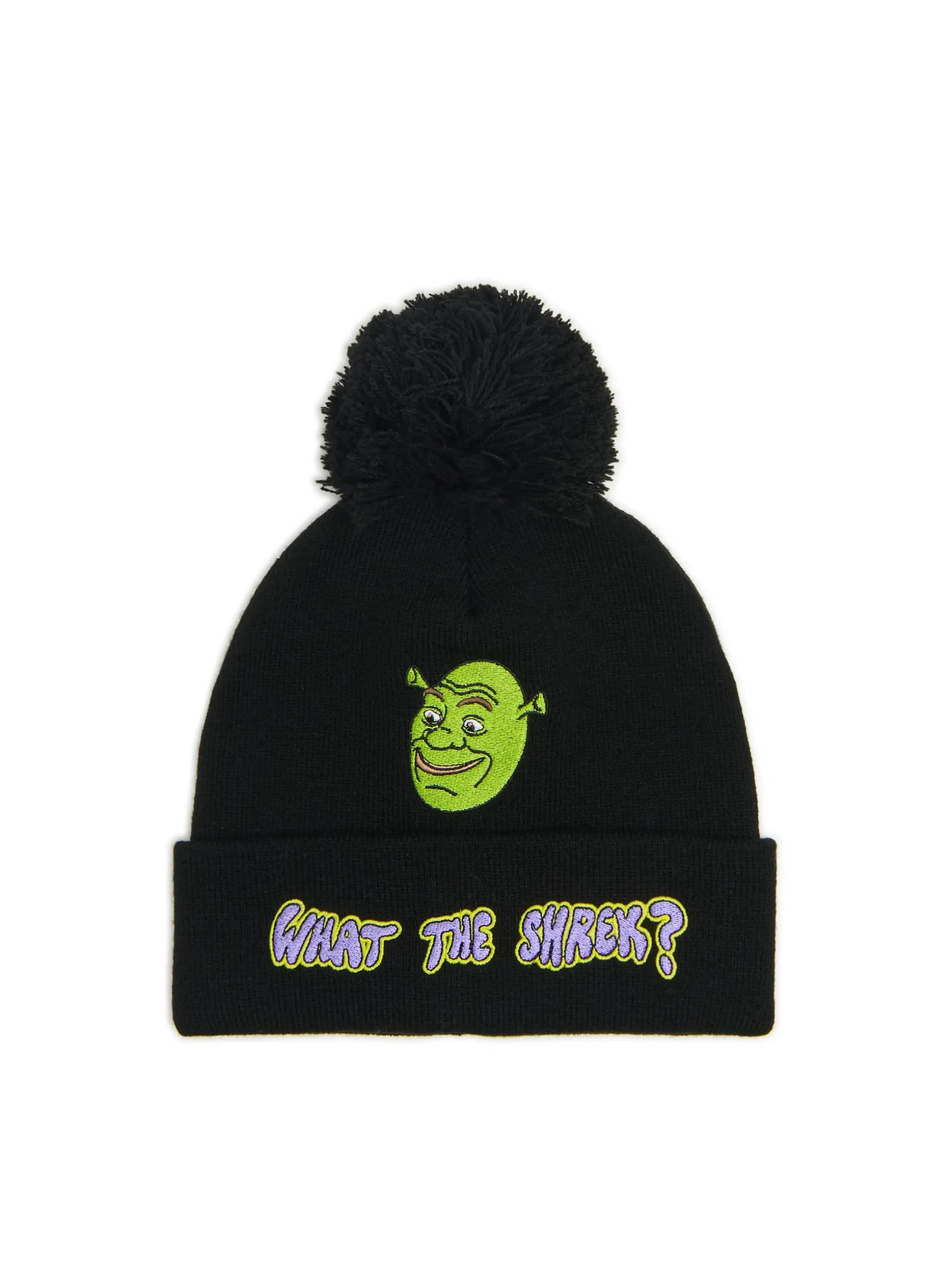 Łap dzianinową męska czapkę beanie z pomponem uszytą z materiału w czarnym kolorze. Na przodzie licencjonowana grafika z podobizną zielonego ogra. Idealny item na zimę? Możemy to omówić przy bezalkoholowym! przyjemny w dotyku materiał prosty krój ozdobny pompon na górze na środku dekoracyjny haft Dreamworks Shrek © DreamWorks Animation LLC. All Rights Reserved.