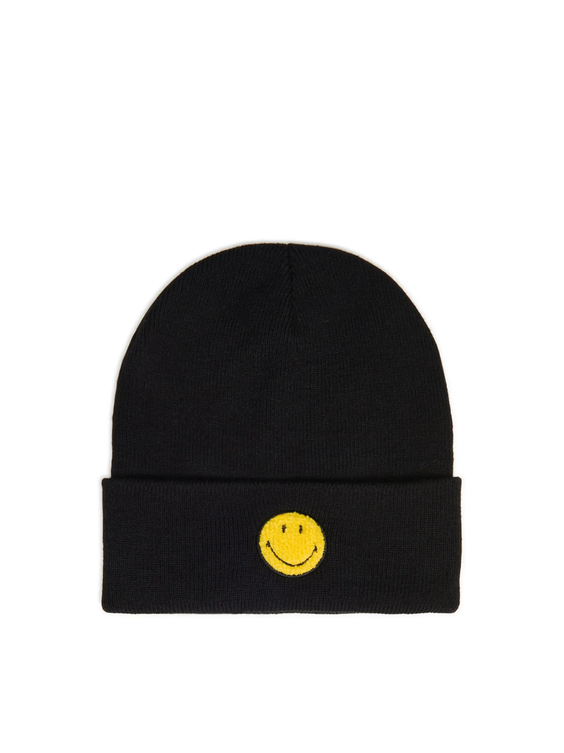 Czarna czapka damska typu beanie, uszyta z dzianiny. Z przodu aplikacja Smiley®. © Smiley®